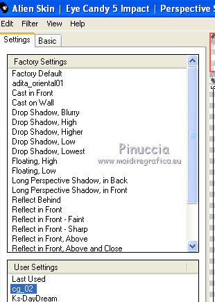 Metti il preset cg_02 nella cartella del Filtro Alien Skin Eye Candy 5 Impact>Settings>Shadow. Se preferisci puoi importarlo direttamente dalla cartella in cui hai scompattato il materiale.