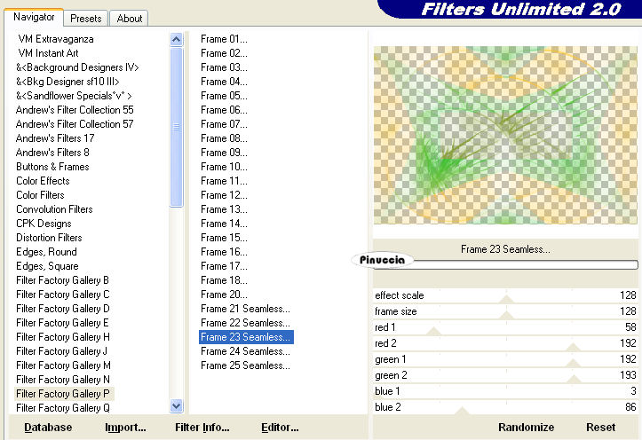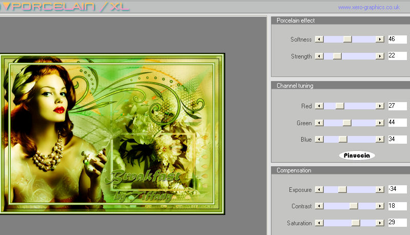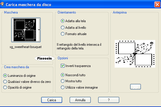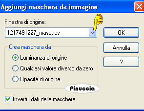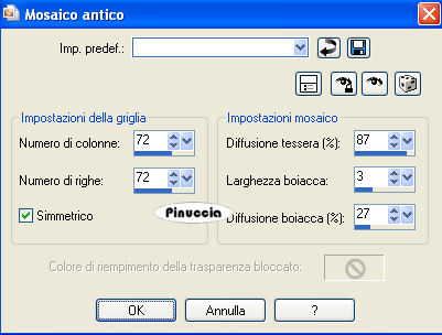 qui puoi trovare qualche risposta ai tuoi dubbi. Se l'argomento che ti interessa non è presente, ti prego di segnalarmelo. Questo tutorial è stato creato con PSP 9, ma può essere eseguito anche con le altre versioni di PSP. Per tradurlo, ho usato PSP X. Questo tutorial è una creazione di ©Christa e non può essere copiato su altri siti nè essere offerto per il download. Lo stesso vale per la mia traduzione. Il materiale viene da vari gruppi di condivisione. Il copyright appartiene ai rispettivi autori. Grazie ai creatori dei tubes che mettono a disposizione il loro lavoro in vari gruppi di condivisione. Occorrente: Materiale qui Per i tubes grazie ChrisPastel, Chaosbaby e Lizztish. Rispetta il lavoro degli autori, non cambiare il nome del file e non cancellare il watermark. Filtri: AAA Frames - Transparent Frame qui Xero - Improver qui Xero - Porcelain e Bad Dream XL qui Filters Unlimited 2.0 qui Filter Factory Gallery P qui I filtri Factory Gallery per essere usati devono prima essere convertiti. Come fare vedi qui Si usano importandoli in Filters Unlimited (come fare vedi qui) ma possono funzionare anche da soli ![]() Metti la maschera sweetheart-bouqet nella cartella Maschere. Apri in PSP la seconda maschera insieme al resto del materiale in PSP. 1. Apri una nuova immagine trasparente 880 x 600 pixels. Imposta il colore di primo piano con il colore #889f39, e il colore di sfondo con il colore bianco #ffffff. Riempi l'immagine trasparente con il colore bianco (tasto destro del mouse).Livelli>nuovo livello raster. Riempi il nuovo livello con il colore di primo piano.Livelli>Nuovo livello maschera>Da immagine. Apri il menu sotto la finestra di origine e vedrai la lista dei files aperti. Seleziona la maschera 1217491227_masque con i seguenti settaggi: ![]() Livelli>Unisci>Unisci gruppo. Livelli>Duplica. 2. Sul livello duplicato: Effetti>Plugins>Filters Unlimited - Filter Factory Gallery P - Frame 23 Seamless. ![]() Attiva il livello sottostante dell'originale. Effetti>Effetti di trama>Mosaico antico. ![]() 3. Apri "lizztish-breakfast-delight1.psp" e vai a Modifica>Copia. Torna al tuo lavoro e vai a Modifica>Incolla come nuovo livello. Livelli>Disponi>Porta in alto. Sposta il tube in basso a destra.Livelli>Carica/Salva maschera>Carica maschera da disco. Cerca e carica la maschera sg_sweetheart-bouquet. ![]() Livelli>Unisci>Unisci gruppo. Effetti>Effetti 3D>Sfalsa ombra, con il colore di primo piano. ![]() Ripeti l'Effetto Sfalsa ombra, cambiando verticale e orizzontale con -1. Livelli>Duplica e attiva il livello sottostante dell'originale. Regola>Tonalità e saturazione>Viraggio. ![]() Attiva il livello del duplicato e cambia la modalità di miscelatura in Luce diffusa. ![]() Effetti>Plugins>Xero - Improver. ![]() 4. Apri "gaby_tube23_26042010.pspimage" e vai a Modifica>Copia. Torna al tuo lavoro e vai a Modifica>Incolla come nuovo livello. Spostalo in alto a destra.Cambia la modalità di miscelatura di questo livello in Luce diffusa. Livelli>Duplica. Effetti>Plugins>Xero - Improver, con i settaggi precedenti. ![]() Apri il tube "Chris-femmepastel.pspimage". Immagine>Ridimensiona, all'85%. Immagine>Rifletti. Modifica>Copia. Torna al tuo lavoro e vai a Modifica>Incolla come nuovo livello. Sposta il tube a sinistra.Livelli>Duplica, e attiva il livello sottostante dell'originale. Regola>Tonalità e saturazione>Viraggio, con i settaggi precedenti. Attiva il livello del duplicato e cambia la modalità di miscelatura in Luce netta. Effetti>Plugins>Xero - Improver, con i settaggi precedenti. Apri "decoro.pspimage". E' già selezionato il decoro che ti serve. Modifica>Copia. Torna al tuo lavoro e vai a Modifica>Incolla come nuovo livello. Sposta l'immagine in alto.Livelli>Disponi>Sposta giù - 2 volte. Regola>Tonalità e saturazione>Viraggio, con i settaggi precedenti. Effetti>Effetti 3D>Sfalsa ombra, con i settaggi precedenti. Effetti>Plugins>Xero - Bad Dream XL. ![]() Livelli>Unisci>Unisci tutto. 5. Immagine>Aggiungi bordatura, 3 pixels, simmetriche, con il colore di primo piano. Immagine>Aggiungi bordatura, 5 pixels, simmetriche, con il colore di sfondo. Immagine>Aggiungi bordatura, 3 pixels, simmetriche, con il colore di primo piano. Modifica>Copia. Immagine>Aggiungi bordatura, 40 pixels, simmetriche, con il colore bianco. Seleziona questo bordo con la bacchetta magica , sfumatura e tolleranza 0,Modifica>Incolla nella selezione. Selezione>Deseleziona. Immagine>Ridimensiona, a 880 pixels di larghezza. ![]() Regola>Messa a fuoco>Metti a fucoo. Livelli>Duplica. Effetti>Plugins>AAA Frames - Transparent Frame. ![]() Effetti>Effetti 3D>Sfalsa ombra, con il colore di primo piano. ![]() Ripeti l'Effetto Sfalsa ombra, cambiando verticale e orizzontale con -10. Apri il file con il testo - o se preferisci usa un tuo testo - e vai a Modifica>Copia. Torna al tuo lavoro e vai a Modifica>Incolla come nuovo livello. Aggiungi il tuo nome e/o il tuo watermark su un nuovo livello. Livelli>Unisci>Unisci tutto. Effetti>Plugins>Xero - Porcelain XL. ![]() Salva in formato jpg. ![]() Se hai problemi o dubbi, o trovi un link non funzionante, o anche soltanto per un saluto, scrivimi. 4 Maggio 2010 |