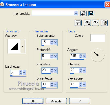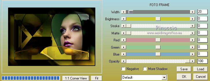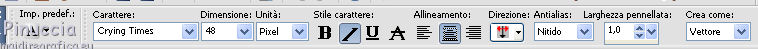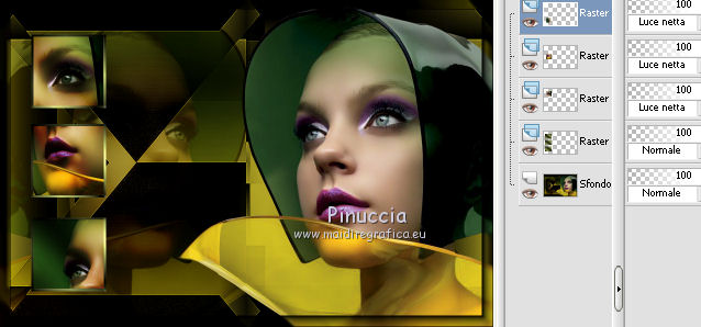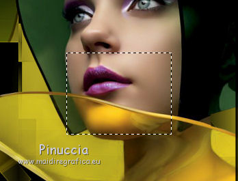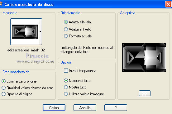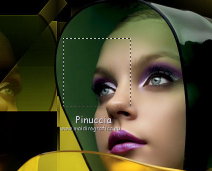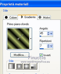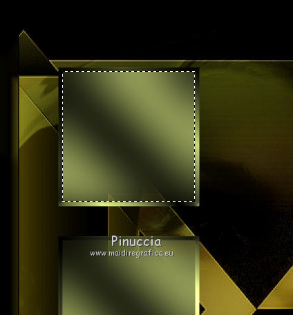 qui puoi trovare qualche risposta ai tuoi dubbi. Se l'argomento che ti interessa non è presente, ti prego di segnalarmelo. Questo tutorial è stato creato con PSP 9, ma può essere eseguito anche con le altre versioni di PSP. Per tradurlo, ho usato PSP X. Questo tutorial è una creazione di ©Christa e non può essere copiato su altri siti nè essere offerto per il download. Lo stesso vale per la mia traduzione. Il materiale viene da vari gruppi di condivisione. Il copyright appartiene ai rispettivi autori. Grazie ai creatori dei tubes che mettono a disposizione il loro lavoro in vari gruppi di condivisione. Occorrente: Materiale qui Per i tubes grazie Guismo. La maschera è ©Aditacreations Rispetta il lavoro degli autori, non cambiare il nome del file e non cancellare il watermark. Filtri: in caso di dubbi, ricorda di consultare la mia sezione filtri qui Graphics Plus - Cross Shadow qui Xero - Improver qui AAA Frames - Foto Frame qui ![]() Metti la maschera nella cartella Maschere. Metti la Selezione nella cartella Selezioni. Apri il resto del materiale in PSP. 1. Apri una nuova immagine trasparente 900 x 600 pixels. Imposta il colore di primo piano con il colore #b2a424, e il colore di sfondo con il colore nero. Riempi l'immagine trasparente con il colore nero di sfondo (tasto destro del mouse).Regola>Aggiungi/Rimuovi disturbo>Aggiungi disturbo. ![]() 2. Livelli>Nuovo livello raster. Riempi con il colore di primo piano.Livelli>Carica/Salva maschera>Carica maschera da disco. Cerca e carica la maschera aditascreations_mask_32: ![]() Livelli>Unisci>Unisci gruppo. Apri il tuo tube - il mio calguisportraitcolerette211010 - e vai a Modifica>Copia. Torna al tuo lavoro e vai a Modifica>Incolla come nuovo livello. Sposta il tube a destra.![]() Livelli>Duplica. Immagine>Rifletti. Livelli>Disponi>Sposta giù. Cambia la modalità di miscelatura di questo livello in Luce diffusa. Livelli>Unisci>Unisci tutto. Effetti>Plugins>AAA Frames - Foto Frame. ![]() 3. Livelli>Nuovo livello raster. Selezione>Carica/Salva selezione>Carica selezione da disco. Cerca e carica la selezione 1049_christa. ![]() Imposta il colore di primo piano con #b0bc6a e lascia il colore di sfondo con il nero. Passa il colore di primo piano a Gradiente. ![]() Riempi la selezione con il gradiente.Selezione>Modifica>Contrai - 4 pixels. Regola>Sfocatura>Sfocatura gaussiana - raggio 15. ![]() Selezione>Inverti. Effetti>Effetti 3D>Smusso a incasso. ![]() Effetti>Plugins>Graphics Plus - Cross Shadow, con i settaggi standard. ![]() Selezione>Deseleziona. 4. Attiva il livello di sfondo. Attiva lo strumento Selezione , rettangolo,e seleziona una parte del tube che vuoi inserire in una delle piccole cornici. Per il mio esempio questa la prima selezione. ![]() Modifica>Copia. Selezione>Deseleziona. Attiva il livello superiore con le piccole cornici. Seleziona la prima cornice.![]() Livelli>Nuovo livello raster. Modifica>Incolla nella selezione. Cambia la modalità di miscelatura di questo livello in Luce netta. Selezione>Deseleziona. Attiva nuovamente il livello di sfondo e ripeti il passaggio precedente ancora due volte, selezionando altre due parti del tube. Nel mio esempio questa la seconda selezione. ![]() La terza selezione: ![]() Non dimenticare di cambiare la modalità di miscelatura di questi livelli in Luce netta. ![]() Quando hai finito: Livelli>Unisci>Unisci tutto. 5. Apri deco_brush_cg.pspimage e vai a Modifica>Copia. Torna al tuo lavoro e vai a Modifica>Incolla come nuovo livello. Sposta il tube a sinistra.Cambia la modalità di miscelatura di questo livello in Luce diffusa. Apri il file con il testo e vai a Modifica>Copia. Torna al tuo lavoro e vai a Modifica>Incolla come nuovo livello. Per questo testo è stato usato il font Crying Times con i seguenti settaggi. ![]() Aggiungi il tuo nome e/o il tuo watermark su un nuovo livello. Livelli>Unisci>Unisci tutto. Se vuoi, ridimensiona l'immagine e salva in formato jpg. ![]() Le vostre versioni. Grazie ![]() Cookies ![]() Cookies ![]() Cookies ![]() Se hai problemi o dubbi, o trovi un link non funzionante, o anche soltanto per un saluto, scrivimi. 7 Novembre 2010 |