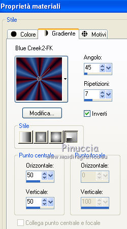 Passa il colore di primo piano a Gradiente e seleziona il gradiente Blue Creek2-FK con i seguenti settaggi.