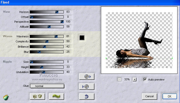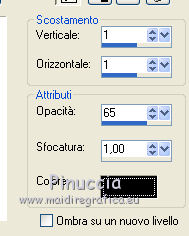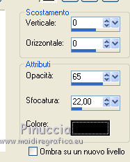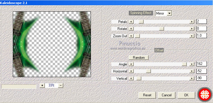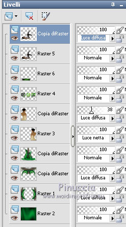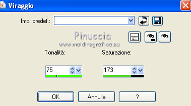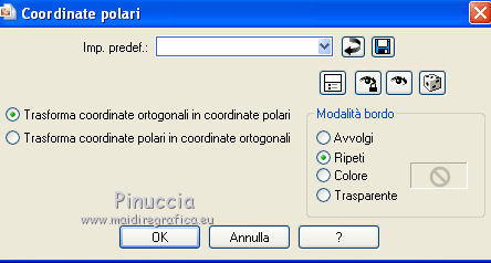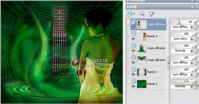 qui puoi trovare qualche risposta ai tuoi dubbi. Se l'argomento che ti interessa non è presente, ti prego di segnalarmelo. Questo tutorial è stato creato con PSP 9, ma può essere eseguito anche con le altre versioni di PSP. Per tradurlo, ho usato PSP X. Questo tutorial è una creazione di ©Christa e non può essere copiato su altri siti nè essere offerto per il download. Lo stesso vale per la mia traduzione. Il materiale viene da vari gruppi di condivisione. Il copyright appartiene ai rispettivi autori. Grazie ai creatori dei tubes che mettono a disposizione il loro lavoro in vari gruppi di condivisione. Occorrente: Materiale qui Per i tubes grazie Chaosgaby, Sorensen Designs e Patries Rispetta il lavoro degli autori, non cambiare il nome del file e non cancellare il watermark. Filtri: in caso di dubbi, ricorda di consultare la mia sezione filtri qui Mehdi - Kaleidoscope 2.1 qui Flaming Pear - Flood qui Xero - Improver qui AAA Frames - Transparent Frame qui Graphics Plus - Cross Shadow qui ![]() 1. Imposta il colore di primo piano con #a7ea92, e il colore di sfondo con #024419. Apri il tube Sorensen_Designs mist nov. Duplicalo usando la combinazione di tasti maiuscola+D e chiudi l'originale. La copia - che ha la dimensione di 800 x 674 pixels - sarà la base del tuo lavoro. Elimina il livello del copyright. Livelli>Nuovo livello raster. Livelli>Disponi>Sposta giù. Riempi il nuovo livello con il colore di sfondo (tasto destro del mouse).Effetti>Plugins>Graphics Plus - Cross Shadow, con i settaggi standard. ![]() 2. Attiva il livello Raster 1. Livelli>Duplica. Attiva nuovamente il livello Raster 1. Effetti>Plugins>Mehdi - Kaleidoscope 2-1. ![]() Cambia la modalità di miscelatura di questo livello in Luce diffusa. Livelli>Duplica. Effetti>Effetti di distorsione>Coordinate polari. ![]() 3. Apri il tube "chg.17.17102010.pspimage" e vai a Modifica>Copia. Torna al tuo lavoro e vai a Modifica>Incolla come nuovo livello. Livelli>Disponi>Porta in alto. Sposta il tube a destra.Cambia la modalità di miscelatura di questo livello in Luce netta. Effetti>Plugins>Xero - Improver. ![]() Livelli>Duplica. Immagine>Rifletti. Cambia la modalità di miscelatura di questo livello in Luce diffusa, e abbassa l'opacità al 38%. ![]() Su entrambi i livelli del tube: Effetti>Effetti 3D>Sfalsa ombra. ![]() Apri "element_cg.pspimage" e vai a Modifica>Copia. Torna al tuo lavoro e vai a Modifica>Incolla come nuovo livello. Se stai usando altri colori, colorizza l'elemento (sul Viraggio vedi qui). Effetti>Effetti 3D>Sfalsa ombra, con il colore nero. ![]() Ripeti l'Effetto Sfalsa ombra, cambiando verticale e orizzontale con -1. Posiziona il tube come nel mio esempio.4. Apri il tube "1Patries-VR 316-minidress" e vai a Modifica>Copia. Torna al tuo lavoro e vai a Modifica>Incolla come nuovo livello. Effetti>Plugins>Flaming Pear - Flood. ![]() Attiva lo strumento Selezione a mano libera , da punto a punto,e seleziona l'acqua creata dal filtro Flood. ![]() Modifica>Copia. Livelli>Nuovo livello raster. Modifica>Incolla nella selezione. Attiva il livello del tube e premi sulla tastiera il tasto CANC. Selezione>Deseleziona. Attiva il livello superiore della selezione. Regola>Tonalità e saturazione>Viraggio, con i valori corrispondenti al tuo colore di primo piano. ![]() Attiva nuovamente il livello del tube. Livelli>Disponi>Porta in alto. Effetti>Effetti 3D>Sfalsa ombra, con il colore nero. ![]() Sposta il tube un po' più in basso e un po' più a sinistra.![]() Livelli>Duplica, e cambia la modalità di miscelatura di questo livello in Luce diffusa. Questa dovrebbe essere la tua paletta dei livelli. ![]() Livelli>Unisci>Unisci tutto. Modifica>Copia. 5. Immagine>Aggiungi bordatura, 2 pixels, simmetriche, con il colore di primo piano. Immagine>Aggiungi bordatura, simmetriche non selezionato, con il colore di sfondo. ![]() Seleziona questo bordo con la bacchetta magica ![]() Modifica>Incolla nella selezione. Effetti>Plugins>AAA Frames - Foto Frame. ![]() Selezione>Deseleziona. Apri il file con il testo - o, se preferisci, scrivi un tuo testo - e vai a Modifica>Copia. Torna al tuo lavoro e vai a Modifica>Incolla come nuovo livello. per il mio testo ho usato il font AdamsHand Regular Aggiungi il tuo nome e/o il tuo watermark su un nuovo livello. Livelli>unisci>Unisci e salva in formato jpg. Se vuoi mandare l'immagine a Christa, ridimensionala a 800 pixels di larghezza. Per inviare a Christa Mail Se vuoi mandare a me, trovi la mail sulla barra del menu in alto. ![]() Se hai problemi o dubbi, o trovi un link non funzionante, o anche soltanto per un saluto, scrivimi. 31 Ottobre 2010 |