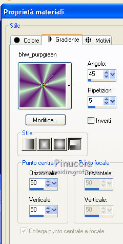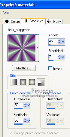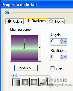 Passa il colore di primo piano a Gradiente e seleziona il gradiente bhw_purpgreen con i seguenti settaggi.