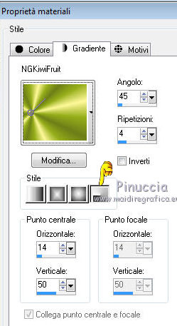 Passa il colore di primo piano a Gradiente, e seleziona il gradiente NGKiwiFruit con i seguenti settaggi.