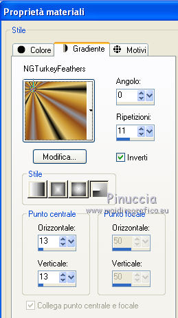 Passa il colore di primo piano a Gradiente, e seleziona il gradiente NGTTurkeyFeathers, con i seguenti settaggi.