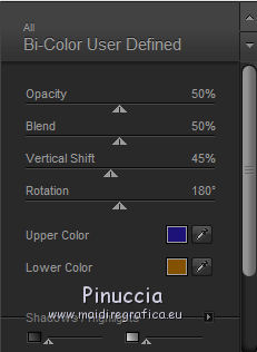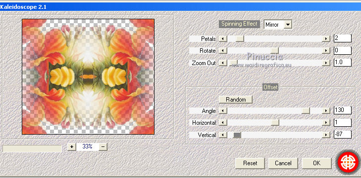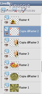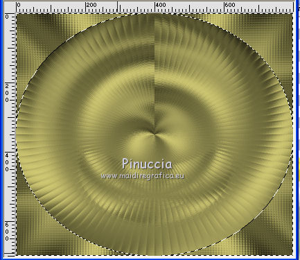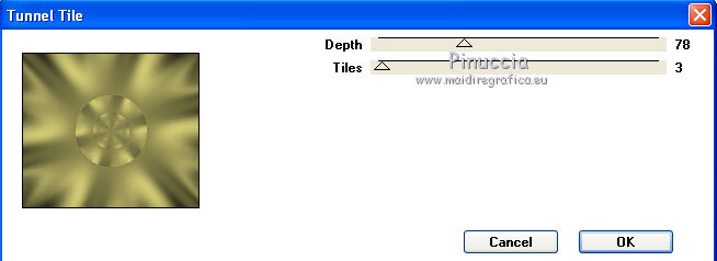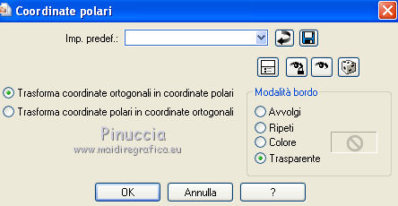 qui puoi trovare qualche risposta ai tuoi dubbi. Se l'argomento che ti interessa non è presente, ti prego di segnalarmelo. Questo tutorial è stato creato con PSP 9, ma può essere eseguito anche con le altre versioni di PSP. Per tradurlo, ho usato PSP X. Questo tutorial è una creazione di ©Christa e non può essere copiato su altri siti nè essere offerto per il download. Lo stesso vale per la mia traduzione. Il materiale viene da vari gruppi di condivisione. Il copyright appartiene ai rispettivi autori. Grazie ai creatori dei tubes che mettono a disposizione il loro lavoro in vari gruppi di condivisione. Occorrente: Materiale qui Per il tube grazie Chaosgaby e Guismo Rispetta il lavoro degli autori, non cambiare il nome del file e non cancellare il watermark. Filtri: in caso di dubbi, ricorda di consultare la mia sezione filtri qui Xero - Improver qui Mehdi - Kaleidoscope 2-1 qui Funhouse - Tunnel Tile qui Nik Software - Color Efex Pro qui Graphics Plus - Cross Shadow qui ![]() 1. Apri una nuova immagine trasparente 800 x 700 pixels. Imposta il colore di primo piano con #efca58, e il colore di sfondo con #5d5a34. Riempi l'immagine trasparente con il colore di sfondo.Effetti>Plugins>Graphics Plus - Cross Shadow, con i settaggi standard. ![]() Effetti>Plugins>Funhouse - Tunnel Tile. ![]() 2. Effetti>Effetti di trama>Mosaico di vetro. ![]() Livelli>Duplica. Effetti>Effetti di distorsione>Coordinate polari. ![]() Attiva lo strumento Bacchetta magica , sfumatura e tolleranza 0,e clicca sui quattro angoli per selezionarli. ![]() Selezione>Inverti. Effetti>Effetti di trama>Mosaico di vetro, con i settaggi precedenti. Effetti>Effetti 3D>Sfalsa ombra, con il colore nero. ![]() Mantieni selezionato. 3. Apri il tube del fiore e vai a Modifica>Copia. Torna al tuo lavoro e vai a Modifica>Incolla come nuovo livello. Posiziona il fiore nella forma.![]() Cambia la modalità di miscelatura di questo livello in Luce netta. Selezione>Inverti. Premi sulla tastiera il tasto CANC. Selezione>Inverti. Livelli>Duplica. Selezione>Inverti. Effetti>Plugins>Mehdi - Kaleidoscope 2.1. Non preoccuparti se noti una leggera differenza tra la tua finestra di anteprima e quella del mio esempio. Questo dipende dalla posizione del fiore che non potrà essere perfettamente uguale alla mia ![]() Selezione>Inverti. Adesso è nuovamente selezionato l'ovale. Premi sulla tastiera il tasto CANC. Selezione>Inverti. Effetti>Effetti 3D>Smusso a incasso. ![]() Effetti>Effetti 3D>Sfalsa ombra, con i settaggi precedenti. Selezione>Deseleziona. 4. Apri il tube della donna - il mio chg.4.11.042011 - e vai a Modifica>Copia. Torna al tuo lavoro e vai a Modifica>Incolla come nuovo livello. Immagine>Ridimensiona, al 65%, tutti i livelli non selezionato. Spostalo nell'ovale a destra.Livelli>Disponi>Sposta giù. Per il mio tube (se stai usando un altro tube, dovrai valutare): Livelli>Duplica, e cambia la modalità di miscelatura di questo livello in Luce diffusa. Su entrambi i livelli: Effetti>Plugins>Xero - Improver. ![]() Apri il tube del coniglietto - calguiseaster19310.psd - e vai a Modifica>Copia. Torna al tuo lavoro e vai a Modifica>Incolla come nuovo livello. Livelli>Disponi>Porta in alto. Immagine>Ridimensiona, al 65%, tutti i livelli non selezionato. Sposta il tube in basso a sinistra.Regola>Messa a fuoco>Metti a fuoco. Per il mio tube: Effetti>Plugins>Nik Software - Color Efex Pro - Bi-Color User Defined. ![]() Effetti>Effetti 3D>Sfalsa ombra, con i settaggi precedenti. Attiva il livello con il filtro Kaleidoscope: ![]() Modifica>Copia. Livelli>Unisci>Unisci tutto. 5. Immagine>Aggiungi bordatura, 35 pixels, simmetriche, con il colore di primo piano. Seleziona questo bordo con la bacchetta magica ![]() Effetti>Plugins>Graphics Plus - Cross shadow, con i settaggi standard. Livelli>Nuovo livello raster. Modifica>Incolla nella selezione. Regola>Sfocatura>Sfocatura gaussiana - raggio 15. ![]() Effetti>Effetti di trama>Mosaico di vetro con i settaggi precedenti. Selezione>Inverti. Effetti>Effetti 3D>Sfalsa ombra, con i settaggi precedenti. Attiva il livello di sfondo. Modifica>Copia. Modifica>Incolla come nuovo livello. Selezione>Deseleziona. Livelli>Disponi>Porta in alto. ![]() Immagine>Ruota per gradi - 5 gradi a destra. ![]() Effetti>Effetti 3D>Sfalsa ombra, con i settaggi precedenti. Scrivi il tuo testo o usa il file di testo fornito con il materiale. Aggiungi il tuo nome e/o il tuo watermark su un nuovo livello. Apri "deco_ecken.psd" e vai a Modifica>Copia. Torna al tuo lavoro e vai a Modifica>Incolla come nuovo livello. Se stai usando altri colori, colorizza l'elemento. Cambia la modalità di miscelatura di questo livello in Luce netta. Livelli>Unisci>Unisci tutto. Immagine>Ridimensiona, a 800 pixels di larghezza. Salva in formato jpg. ![]() Se hai problemi o dubbi, o trovi un link non funzionante, o anche soltanto per un saluto, scrivimi. 13 Aprile 2011 |