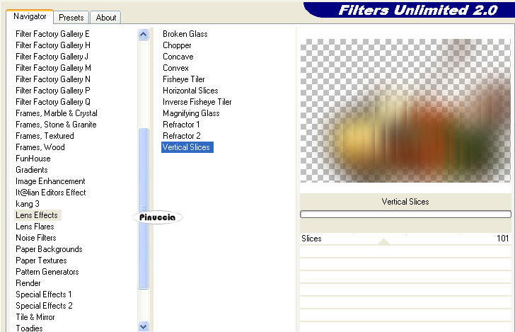 Effetti>Plugins>Filters Unlimited 2.0 - Lens Effects - Vertical Slices.