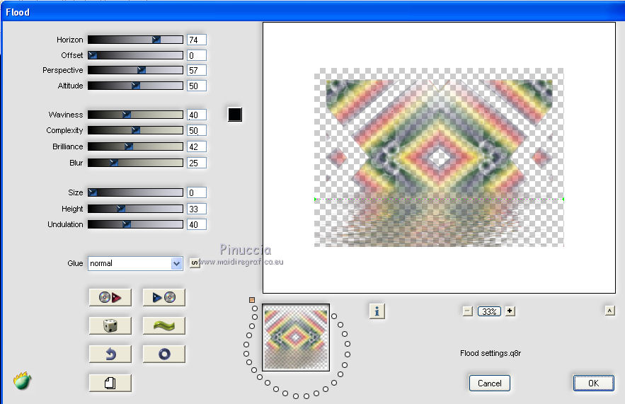 Attiva il livello copia di Raster 1 e ripeti l'Effetto Flood, con i seguenti settaggi.