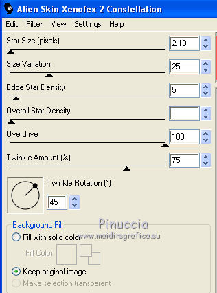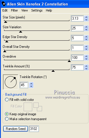 Effetti>Plugins>Alien Skin Xenofex 2.0 - Constellation, cambia Star Size con 3,13, e clicca una volta su Random Seed.