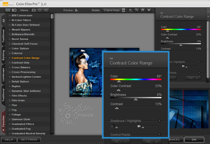 qui puoi trovare qualche risposta ai tuoi dubbi. Se l'argomento che ti interessa non è presente, ti prego di segnalarmelo. Questo tutorial è stato creato con PSP 9, ma può essere eseguito anche con le altre versioni di PSP. Per tradurlo, ho usato PSP X. Questo tutorial è una creazione di ©Christa e non può essere copiato su altri siti nè essere offerto per il download. Lo stesso vale per la mia traduzione. Il materiale viene da vari gruppi di condivisione. Il copyright appartiene ai rispettivi autori. Grazie ai creatori dei tubes che mettono a disposizione il loro lavoro in vari gruppi di condivisione. Occorrente: Materiale qui Per i tube grazie Guismo. Rispetta il lavoro degli autori, non cambiare il nome del file e non cancellare il watermark. Filtri: Penta.com - Color Dot qui Simple qui Graphics Plus - Cross Shadow qui Nik Software - Color Efex qui AAA Filters - Good Vibrations qui AAA Frames - Foto Frame qui ![]() 1. Apri una nuova immagine trasparente 900 x 600 pixels. Imposta il colore di primo piano con il colore chiaro #2b89c9, e il colore di sfondo con il colore scuro #003e66. Riempi l'immagine trasparente con il colore di sfondo (tasto destro del mouse).Plugins>Graphics Plus - Cross Shadow, con i settaggi standard. ![]() Livelli>Nuovo livello raster. Selezione>Seleziona tutto. Apri "n052010.pspimage" e vai a Modifica>copia. Torna al tuo lavoro e vai a Modifica>Incolla nella selezione. Selezione>Deseleziona. 2. Cambia la modalità di miscelatura di questo livello in Luminanza (esistente). Livelli>Duplica, e attiva il livello sottostante dell'originale. Regola>Sfocatura>Sfocatura radiale. ![]() Effetti>Effetti geometrici>Prospettiva orizzontale. ![]() Effetti>Effetti di immagine>Motivo unico. ![]() Effetti>Effetti di bordo>Aumenta. Effetti>Plugins>Simple - 4 Way Average. Effetti>Plugins>Penta.com - Color Dot. ![]() 3. Apri "calguiselegance1929.pspimage" e vai a Modifica>Copia. Torna al tuo lavoro e vai a Modifica>Incolla come nuovo livello. Livelli>Disponi>Porta in alto. Sposta il tube a destra.Regola>Tonalità e saturazione>Viraggio, con i valori corrispondenti al colore di primo piano. I miei: ![]() Effetti>Effetti 3D>Sfalsa ombra, con il colore nero. ![]() Ripeti l'Effetto Sfalsa ombra, cambiando verticale e orizzontale con -3. 4. Apri "calguisbeautywinter5119.pspimage" e vai a Modifica>Copia. Torna al tuo lavoro e vai a Modifica>Incolla come nuovo livello. Immagine>Ridimensiona, al 75%, tutti i livelli non selezionato. Regola>Messa a fuoco>Metti a fuoco. Sposta il tube a sinistra.Livelli>Duplica. Immagine>Rifletti. Regola>Tonalità e saturazione>Viraggio, con i settaggi precedenti. Cambia la modalità di miscelatura di questo livello in Luce netta, e abbassa l'opacità al 56%. Posiziona il tube a destra dell'immagine in cornice.Livelli>Duplica. Immagine>Rifletti. Posiziona il duplicato a sinistra dell'immagine in cornice.![]() Attiva il livello del tube originale che sta sul lato sinistro. Effetti>Effetti 3D>Sfalsa ombra, con i settaggi precedenti. Livelli>Unisci>Unisci tutto. 5. Effetti>Plugins>AAA Frames - Foto Frame: ![]() Immagine>Ridimensiona, a 800 pixels di larghezza, tutti i livelli selezionato. ![]() Regola>Messa a fuoco>Metti a fuoco. Modifica>Copia. Immagine>Aggiungi bordatura, 45 pixels, simmetriche, con il colore di primo piano. Seleziona questo bordo con la bacchetta magica ![]() Modifica>Incolla nella selezione. Selezione>Seleziona tutto. Selezione>Modifica>Contrai - 25 pixels. Selezione>Inverti. Effetti>Plugins>AAA Filters - Good Vibrations. ![]() Selezione>Deseleziona. 6. Effetti>Plugins>Nik Software - Color Efex Pro: Contrast Color Range, con i seguenti settaggi. ![]() Apri il file con il testo - o se preferisci usa un tuo testo - e vai a Modifica>Copia. Torna al tuo lavoro e vai a Modifica>Incolla come nuovo livello. Per questo testo è stato usato il font Lucida Calligraphy. Aggiungi il tuo nome e/o il tuo watermark su un nuovo livello. Livelli>Unisci>Unisci tutto e salva in formato jpg. ![]() Se hai problemi o dubbi, o trovi un link non funzionante, o anche soltanto per un saluto, scrivimi. 27 Maggio 2010 |