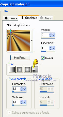 Imposta il colore di primo piano a Gradiente, e seleziona il gradiente NGTurkeyFeathers con i seguenti settaggi.