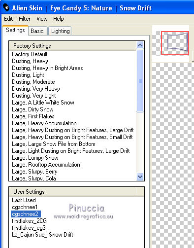 Metti il preset cgschnee2 nella cartella del filtro: Alien Skin Eye Candy 5 Nature>Settings>SnowDrift. Se preferisci puoi importarlo, quando ti servirà, dalla cartella in cui hai scompattato il materiale.