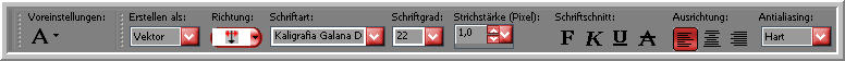 Per questo testo è stato usato il font Kaligrafia Galana con i seguenti settaggi.