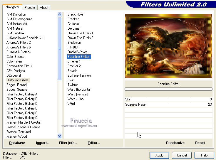 Effetti>Plugins>Filters Unlimited 2.0 - Distortion Filter - Scanline Shifter.