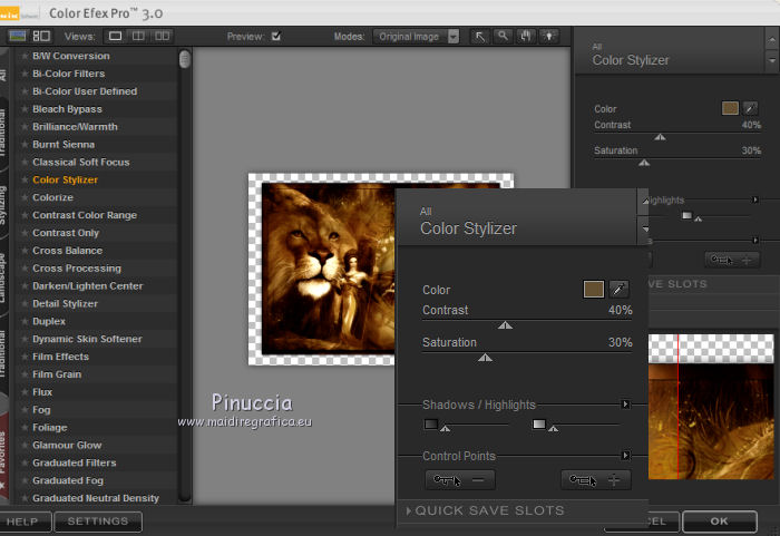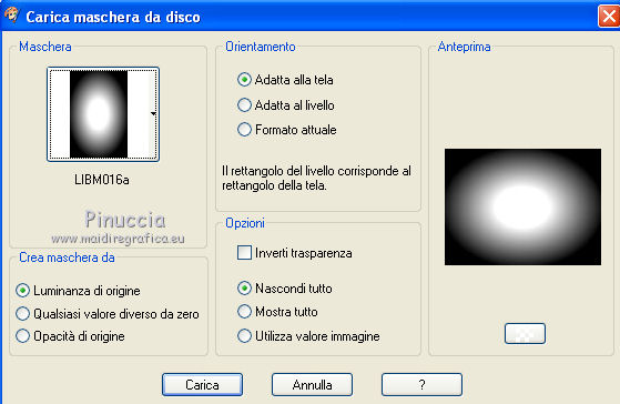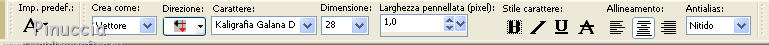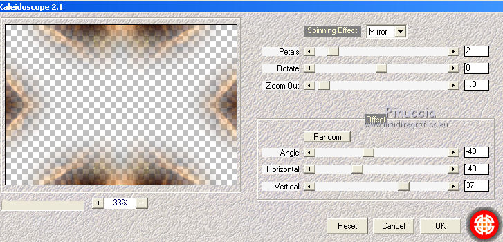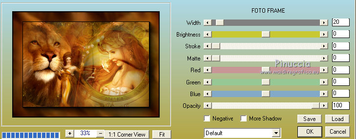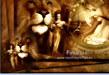qui puoi trovare qualche risposta ai tuoi dubbi. Se l'argomento che ti interessa non è presente, ti prego di segnalarmelo. Questo tutorial è stato creato con PSP 9, ma può essere eseguito anche con le altre versioni di PSP. Per tradurlo, ho usato PSP X. Questo tutorial è una creazione di ©Christa e non può essere copiato su altri siti nè essere offerto per il download. Lo stesso vale per la mia traduzione. Il materiale viene da vari gruppi di condivisione. Il copyright appartiene ai rispettivi autori. Grazie ai creatori dei tubes che mettono a disposizione il loro lavoro in vari gruppi di condivisione. Occorrente: Due tubes o due immagini a scelta. Il resto del materiale qui Per le immagini usate, grazie Soa Lee per il permesso. Rispetta il lavoro degli autori, non cambiare il nome del file e non cancellare il watermark. Filtri: in caso di dubbi, ricorda di consultare la mia sezione filtri qui Xero - Bad Dream XL qui Graphics Plus - Cross Shadow qui AAA Frames - Foto Frame qui Nik Software - Color Efex Pro qui Prima di iniziare anticipo una cosa importante per il tutorial. Le mie descrizioni si riferiscono sempre al modo in cui creo la mia immagine. Per altri tubes e colori, potrebbe essere necessario modificare le mie impostazioni. Gli elementi possono essere colorizzati. Questo non lo scriverò più nel tutorial. ![]() 1. Apri una nuova immagine trasparente 900 x 650 pixels. Imposta il colore di primo piano con il colore chiaro #d9b049, e il colore di sfondo con il colore scuro #53351b. Riempi l'immagine trasparente con il colore di sfondo.Effetti>Plugins>Graphics Plus - Cross Shadow, con i settaggi standard. ![]() Apri "element_cg.psd" e vai a Modifica>Copia. Torna al tuo lavoro e vai a Modifica>Incolla come nuovo livello. Cambia la modalità di miscelatura di questo livello in Luce netta. 2. Livelli>Nuovo livello raster. Riempi con il colore di sfondo.Livelli>Carica/Salva maschera>Carica maschera da disco. Cerca e carica la maschera eglantine3110611. ![]() Livelli>Unisci>Unisci gruppo. Effetti>Plugins>Xero - Bad Dream XL. ![]() Apri la prima delle tue immagini (per la parte sinistra). Livelli>Carica/Salva maschera>Carica maschera da disco. Cerca e carica la maschera LIBMO16a. ![]() Livelli>Unisci>Unisci gruppo. Modifica>Copia, e minimizza l'immagine che ti servirà ancora Torna al tuo lavoro e vai a Modifica>Incolla come nuovo livello. Ancora Livelli>Carica/Salva maschera>Carica maschera da disco. Carica nuovamente la maschera LIBMO16a. ![]() Livelli>Unisci>Unisci gruppo. Sposta il tube a sinistra.Effetti>Plugins>Xero - Bad Dream XL, con i settaggi precedenti. ![]() Apri il tuo secondo tube (per la parte destra). Livelli>Carica/Salva maschera>Carica maschera da disco. Carica nuovamente la maschera LIBMO16a. ![]() Livelli>Unisci>Unisci gruppo. Modifica>Copia. Torna al tuo lavoro e vai a Modifica>Incolla come nuovo livello. Sposta il tube a destra.Per il mio tube ho cambiato la modalità di miscelatura di questo livello in Luce netta. Attiva il livello del tube a sinistra. Livelli>Duplica. Effetti>Plugins>Mehdi - Kaleidoscope 2.1. ![]() 4. Livelli>Unisci>Unisci visibile. Livelli>Duplica. Effetti>Plugins>AAA Frames - Foto Frame. ![]() Immagine>Ridimensiona, al 90%, tutti i livelli non selezionato. Effetti>Effetti 3D>Sfalsa ombra, con il colore nero. ![]() Attiva il livello Uniti. Effetti>Plugins>AAA Frames - Foto Frame. ![]() Attiva il livello del duplicato. Effetti>Plugins>Nik Software - Color Efex Pro - Color Stylizer. ![]() 5. Apri il primo tube che hai lasciato in attesa dopo aver applicato la maschera. Modifica>Copia. Torna al tuo lavoro e vai a Modifica>Incolla come nuovo livello. Immagine>Ridimensiona, al 55%, tutti i livelli non selezionato. Immagine>Rifletti. Spostalo in basso a sinistra.Effetti>Plugins>Xero - Bad Dream XL, con i settaggi precedenti. Effetti>Plugins>Nik Software - Color Efex Pro, con i settaggi precedenti. Attiva il livello Uniti. Modifica>Copia. Immagine>Dimensioni tela. ![]() Livelli>Nuovo livello raster. Livelli>Disponi>Sposta giù. Selezione>Seleziona tutto. Modifica>Incolla nella selezione. Selezione>Deseleziona. Attiva il livello Uniti. Immagine>Ruota per gradi - 5 gradi a sinistra. ![]() Effetti>Effetti 3D>Sfalsa ombra, con i settaggi precedenti. Sposta il piccolo tube in basso a sinistra.![]() 6. Apri il file di testo e vai a Modifica>Copia. Torna al tuo lavoro e vai a Modifica>Incolla come nuovo livello. Per questo testo è stato usato il font Kaligrafia Galana Dos con i seguenti settaggi. settaggi usati da Christa con PSP 9; dovrai regolare la dimensione in base al tuo testo e alla versione di PSP che stai usando. ![]() Aggiungi il tuo nome e/o il tuo watermark, senza dimenticare eventuali copyright delle immagini usate. Livelli>Unisci>Unisci tutto. Se vuoi, Immagine>Ridimensiona, alle dimensioni che preferisci. In questo caso non dimenticare di mettere a fuoco. Salva in formato jpg. ![]() Se hai problemi o dubbi, o trovi un link non funzionante, o anche soltanto per un saluto, scrivimi. 4 Settembre 2011 |