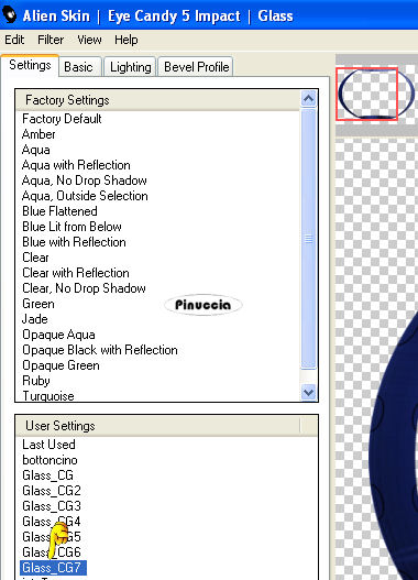Metti il preset Glass_CG7 nella cartella del filtro: Alien Skin Eye Candy 5 Impact>Settings>Glass. Se preferisci, puoi importarlo direttamente dalla cartella in cui hai scompattato il materiale, quando ti servirà.