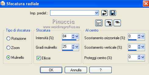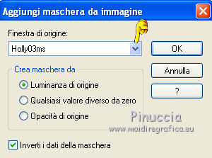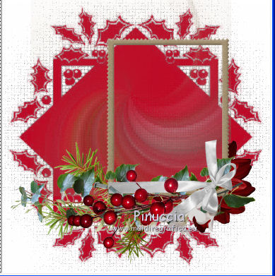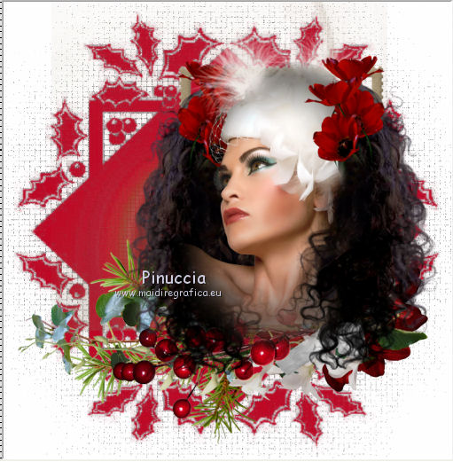 qui puoi trovare qualche risposta ai tuoi dubbi. Se l'argomento che ti interessa non è presente, ti prego di segnalarmelo. Questo tutorial è stato creato con PSP 9, ma può essere eseguito anche con le altre versioni di PSP. Per tradurlo, ho usato PSP X. Questo tutorial è una creazione di ©Christa e non può essere copiato su altri siti nè essere offerto per il download. Lo stesso vale per la mia traduzione. Il materiale viene da vari gruppi di condivisione. Il copyright appartiene ai rispettivi autori. Grazie ai creatori dei tubes che mettono a disposizione il loro lavoro in vari gruppi di condivisione. Occorrente: Materiale qui Per i tubes grazie Nini . Rispetta il lavoro degli autori, non cambiare il nome del file e non cancellare il watermark. Filtri: in caso di dubbi, ricorda di consultare la mia sezione filtri qui Xero - Improver qui ![]() Apri tutto il materiale in PSP, compresa la maschera. 1. Imposta il colore di primo piano con il bianco, e il colore di sfondo con #bf0926. Apri "cfsampler.pspimage". Duplica l'immagine usando la combinazione di tasti maiuscola+D e chiudi l'originale. La copia sarà la base del tuo lavoro. Livelli>Nuovo livello raster. Livelli>Disponi>Sposta giù. Riempi il livello con il colore di primo piano.2. Livelli>Nuovo livello raster. Riempi con il colore di sfondo.Livelli>Nuovo livello maschera>Da immagine. Apri il menu sotto la finestra di origine e vedrai la lista dei files aperti. Tra questi la maschera. Seleziona la maschera Holly03ms.jpg con i seguenti settaggi: ![]() Livelli>Unisci>Unisci gruppo. Effetti>Effetti 3D>Sfalsa ombra, ombra su nuovo livello selezionato. ![]() Rimani posizionato sul livello dell'ombra. Effetti>Effetti di trama>Mosaico antico. ![]() 3. Attiva il livello della cornice. Livelli>Duplica, e attiva il livello sottostante dell'originale. Regola>Sfocatura>Sfocatura radiale. ![]() Effetti>Effetti di trama>Mosaico antico, con i settaggi precedenti. ![]() Immagine>Ridimensiona, al 75%, tutti i livelli non selezionato. Sposta l'immagine nella cornice.![]() 4. Apri il tube con il viso e vai a Modifica>Copia. Torna al tuo lavoro e vai a Modifica>Incolla come nuovo livello. Livelli>Disponi>Porta in alto. Immagine>Ridimensiona, al 75%, tutti i livelli non selezionato. Sposta il tube a destra nella cornice.Il passaggio successivo dipende dal tube che hai usato. Per il mio tube: Livelli>Duplica. Immagine>Rifletti. Livelli>Disponi>Sposta giù. Sposta il tube duplicato in modo che rimangano visibili, a sinistra, soltanto i capelli.![]() Attiva il livello superiore e cancella la spalla.![]() Dovresti avere questo. ![]() Sul tube di destra: Effetti>Plugins>Xero - Improver. ![]() 5. Apri image_1.pspimage e vai a Modifica>Copia. Torna al tuo lavoro e vai a Modifica>Incolla come nuovo livello. Livelli>Disponi>Porta in alto. Spostalo in basso.Effetti>Effetti 3D>Sfalsa ombra, con il colore nero, ombra su nuovo livello non selezionato. Attiva il livello della cornice. Effetti>Effetti 3D>Sfalsa ombra, con il colore nero, ombra su nuovo livello selezionato. Rimani posizionato sul livello dell'ombra. Effetti>Effetti di trama>Mosaico antico, con i settaggi precedenti. Immagine>Ridimensiona, al 90%, tutti i livelli non selezionato. Apri "image_2.pspimage" e vai a Modifica>Copia. Torna al tuo lavoro e vai a Modifica>Incolla come nuovo livello. Livelli>Disponi>Porta in alto. Spostalo in alto, vedi il mio esempio.Effetti>Effetti 3D>Sfalsa ombra, con i settaggi precedenti, ombra su nuovo livello non selezionato. Apri il file "text" e vai a Modifica>Copia. Torna al tuo lavoro e vai a Modifica>Incolla come nuovo livello. Effetti>Effetti 3D>Sfalsa ombra, con i settaggi precedenti. Aggiungi il tuo nome e/o il tuo watermark su un nuovo livello. Livelli>Unisci>Unisci tutto e salva in formato jpg. ![]() Se hai problemi o dubbi, o trovi un link non funzionante, o anche soltanto per un saluto, scrivimi. 18 Novembre 2010 |