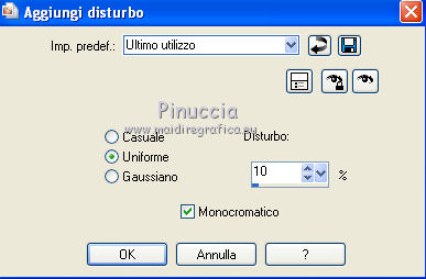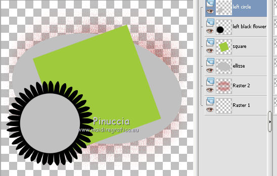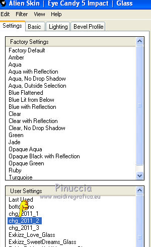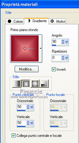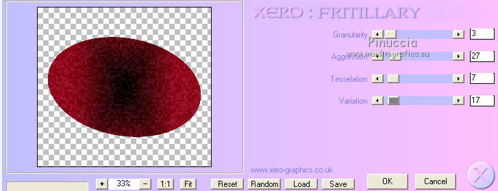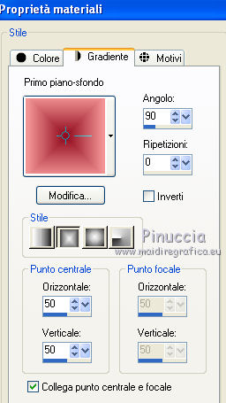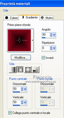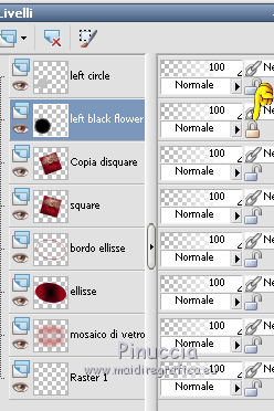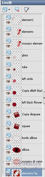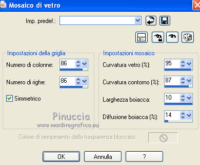qui puoi trovare qualche risposta ai tuoi dubbi. Se l'argomento che ti interessa non è presente, ti prego di segnalarmelo. Questo tutorial è stato creato con PSP X3, ma può essere eseguito anche con le altre versioni di PSP. Per tradurlo, ho usato PSP X. Questo tutorial è una creazione di ©Christa e non può essere copiato su altri siti nè essere offerto per il download. Lo stesso vale per la mia traduzione. Il materiale viene da vari gruppi di condivisione. Il copyright appartiene ai rispettivi autori. Grazie ai creatori dei tubes che mettono a disposizione il loro lavoro in vari gruppi di condivisione. Occorrente: Materiale qui Per il tubes grazie Chaosgaby. Per il template Daira Rispetta il lavoro degli autori, non cambiare il nome del file e non cancellare il watermark. Filtri: in caso di dubbi, ricorda di consultare la mia sezione filtri qui Xero - Improver, Fritillary qui Xero - Bad Dream XL qui Alien Skin Eye Candy 5 Impact - Glass qui Prima di iniziare anticipo una cosa importante per il tutorial. Le mie descrizioni si riferiscono sempre al modo in cui creo la mia immagine. Per altri tubes e colori, potrebbe essere necessario modificare le mie impostazioni. Gli elementi possono essere colorizzati. Questo non lo scriverò più nel tutorial. ![]() Metti il preset chg_2011_2.f1s nella cartella del filtro Alien Skin Eye Candy 5 Impact>Settings>Glass. Con doppio clic sul file il preset si installa automaticamente. Se preferisci puoi importarlo, quando ti servirà, dalla cartella in cui hai scompattato il materiale. Vedi la scheda del filtro qui e come importare un preset in Eye Candy qui 1. Apri tutto il materiale in PSP e minimizzalo. Scegli due colori dai tuoi tubes. Per l'esempio colore di primo piano #90081c, colore di sfondo #f29495. Apri una nuova immagine trasparente 760 x 700 pixels. Apri glasmosaik_cg.psd e vai a Modifica>Copia. Torna al tuo lavoro e vai a Modifica>Incolla come nuovo livello. 2. Apri il template LMC_Tag Template-by Daira. Attiva il livello "ellipse" e vai a Modifica>Copia. Torna al tuo lavoro e vai a Modifica>Incolla come nuovo livello. Attiva nuovamente il Template e copia il livello "square". Torna al tuo lavoro e vai a Modifica>Incolla come nuovo livello. Dal Template copia il livello "left black flower". Torna al tuo lavoro e vai a Modifica>Incolla come nuovo livello. Spostalo in basso a sinistra.Dal Template copia il livello "left circle". Torna al tuo lavoro e vai a Modifica>Incolla come nuovo livello. Spostalo sul fiore nero.Per chiarezza, rinomina i livelli così come stanno nel template. Dovresti avere questo. ![]() 3. Adesso lavoriamo su ogni livello. Attiva il livello "square". Attiva lo strumento Bacchetta magica , sfumatura e tolleranza 0,e clicca nel quadrato per selezionarlo. Selezione>Modifica>Espandi - 5 pixels. Riempi con il colore di primo piano.Livelli>Nuovo livello raster. Apri il tube "chg.19.04062011". Immagine>Rifletti. Modifica>Copia. minimizza il tube perchè ti servirà ancora Torna al tuo lavoro e vai a Modifica>Incolla nella selezione. Effetti>Plugins>Xero - Improver. ![]() Livelli>Disponi>Sposta giù. Selezione>Deseleziona. Livelli>Duplica, e attiva il livello originale del quadrato. Immagine>Ruota per gradi - 35 gradi a destra. ![]() Su entrambi i livelli: Effetti>Effetti 3D>Sfalsa ombra, con il colore nero. ![]() 4. Attiva il livello "ellisse". Seleziona la forma con la bacchetta magica ![]() Imposta il colore di sfondo con il nero e passa il colore di primo piano a Gradiente, con i seguenti settaggi. ![]() Riempi la selezione con il gradiente.Selezione>Modifica>Seleziona bordature selezione. ![]() Livelli>Nuovo livello raster. Imposta il colore di sfondo con un colore chiaro - per l'esempio #f29495. Mantieni i settaggi del gradiente, ma togli la selezione a Inverti. ![]() Riempi la selezione con il gradiente.Effetti>Effetti 3D>Smusso a incasso. ![]() Effetti>Plugins>Xero - Bad Dream XL. ![]() Selezione>Deseleziona. Effetti>Effetti 3D>Sfalsa ombra, con i settaggi precedenti. Rinomina questo livello "bordo ellisse". 5. Attiva il livello "left black flower". Clicca all'esterno del fiore con la bacchetta magica ![]() Selezione>Inverti (in questo modo sarà selezionato il fiore). Riempi con il colore di primo piano.Nella paletta dei livelli clicca sul lucchetto di questo livello per bloccare la trasparenza. Il lucchetto si chiuderà. ![]() Effetti>Effetti 3D>Ritaglio. ![]() Clicca nuovamente sul lucchetto per sbloccare la trasparenza. Regola>Aggiungi/Rimuovi disturbo>Aggiungi disturbo. ![]() Selezione>Deseleziona. Livelli>Duplica. Immagine>Ridimensiona, al 90%, tutti i livelli non selezionato. Immagine>Ruota per gradi - 5 gradi a sinistra. ![]() Chiudendo momentaneamente il livello "left circle", dovresti avere questo. ![]() 6. Attiva il livello "left circle". Clicca all'esterno del cerchio con la bacchetta magica ![]() Selezione>Inverti. Cambia nuovamente i settaggi del Gradiente selezionando Inverti. ![]() Riempi la selezione con il gradiente.Attiva nuovamente il tuo tube. Modifica>Annulla azione Rifletti. Modifica>Copia. Torna al tuo lavoro e vai a Modifica>Incolla nella selezione. Clicca sul lucchetto nella paletta per bloccare la trasparenza. Effetti>Effetti 3D>Ritaglio, con i settaggi precedenti. Clicca ancora sul lucchetto per sbloccare la trasparenza. Livelli>Nuovo livello raster. Effetti>Plugins>Alien Skin Eye Candy 5 Impact - Glass. Seleziona il preset chg_2011_2 e ok. ![]() Selezione>Deseleziona. Su i due livelli con il fiore: Effetti>Effetti 3D>Sfalsa ombra, con i settaggi precedenti. 7. Apri il tube "lisaminor_wa_2sweet.psd" e vai a Modifica>Copia. Torna al tuo lavoro e vai a Modifica>Incolla come nuovo livello. Livelli>Disponi>Porta in alto. Sposta il tube a destra.Regola>Messa a fuoco>Metti a fuoco. Livelli>Duplica, e attiva il livello sottostante dell'originale. Effetti>Effetti di trama>Mosaico di vetro. ![]() Attiva il livello superiore del duplicato. Effetti>Effetti 3D>Sfalsa ombra, con i settaggi precedenti