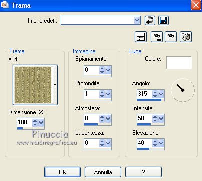Effetti>Effetti di trama>Trama - seleziona la trama a34 con i seguenti settaggi.