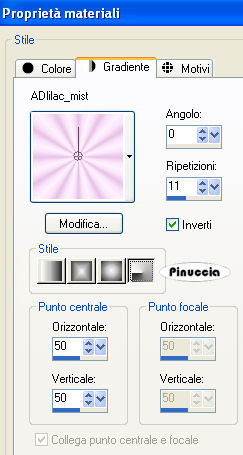 Passa il colore di primo piano a Gradiente e seleziona il gradiente ADlilac_mist con i seguenti settaggi.