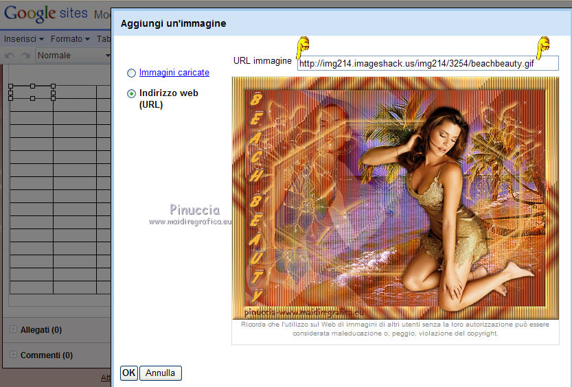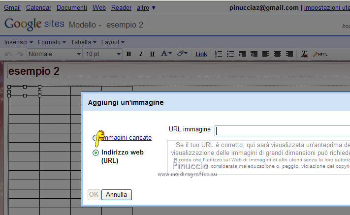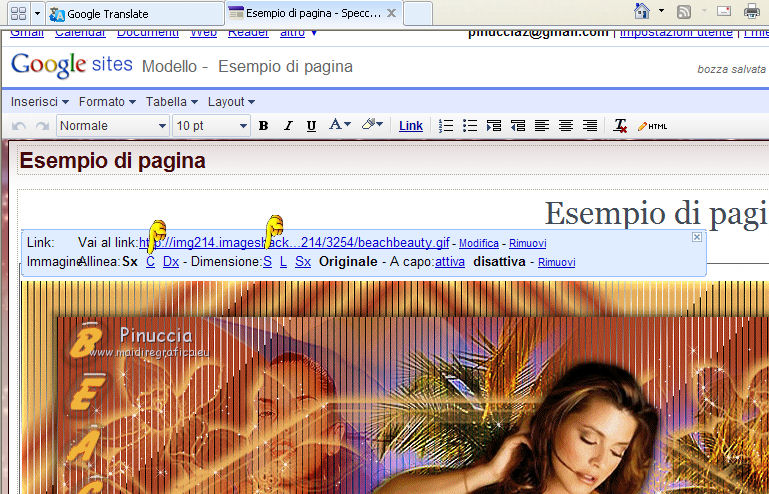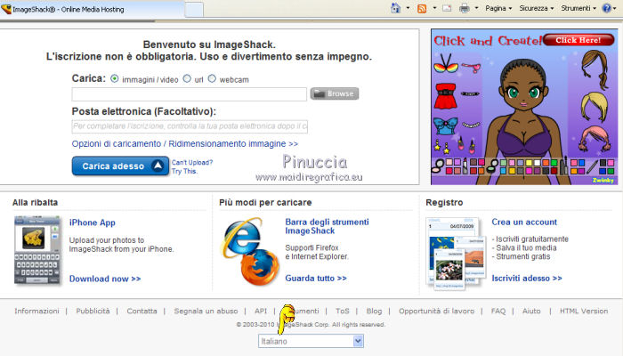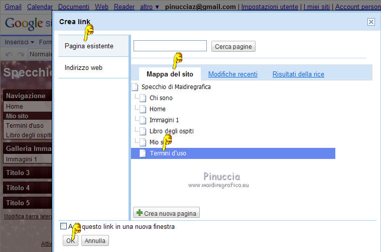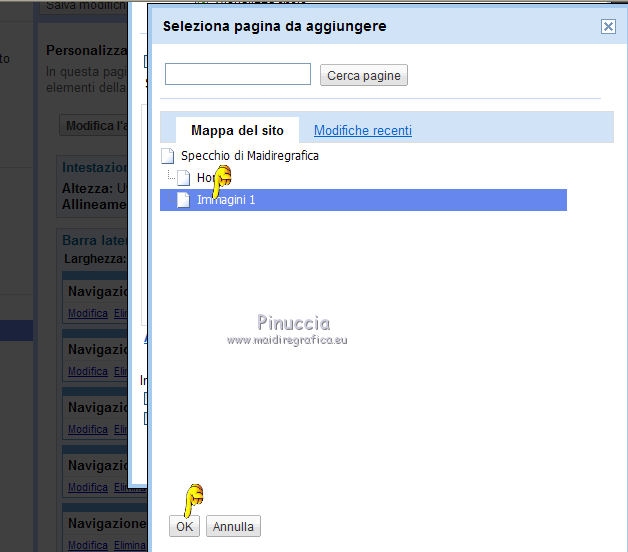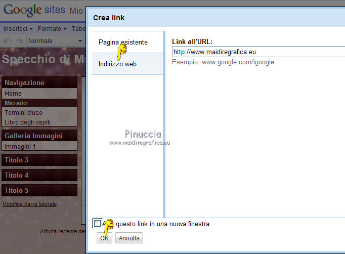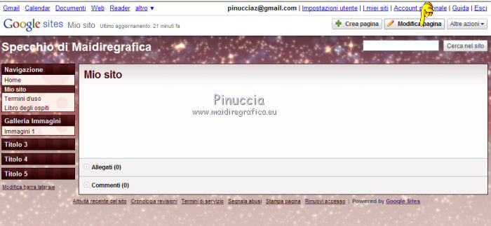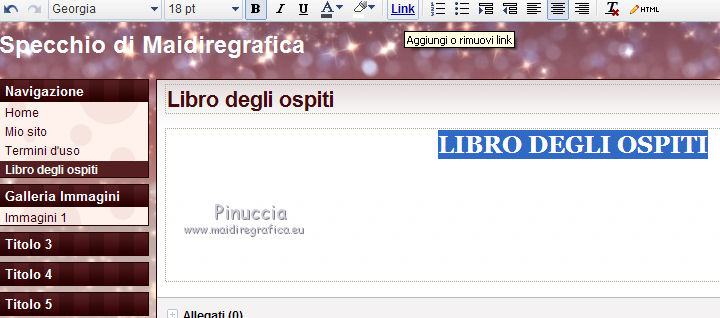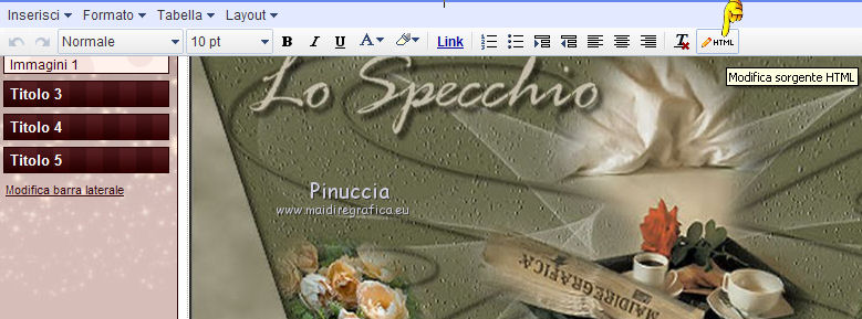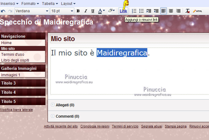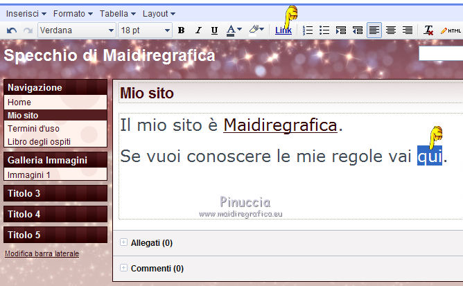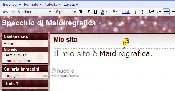 Questo tutorial è una creazione di ©Christa e non può essere copiato su altri siti nè essere offerto per il download. Lo stesso vale per la mia traduzione. pagina 1 ![]() Adesso alcuni appunti sul caricamento delle immagini da un sito hosting. L'esempio fornito da Christa si riferisce a un sito tedesco. Per questo ho scelto casualmente uno dei siti più frequentemente usati in Italia - Image Shack. In linea di massima il funzionamento è simile per tutti i siti di questo, ma non ti sarà difficile individuare eventuali varianti e adattare le spiegazioni a queste varianti. Su Image Shack non è necessario registrarsi, ma per illustrare l'esempio l'ho fatto, perchè non ho il tempo di seguire il percorso delle immagini inserite da utenti non registrati. Nel passare da una pagina all'altra di questo sito, è facile ritrovarsi con le pagine in inglese. Nessun problema: in questo caso, seleziona la lingua nel menu a tendina e ti ritroverai a "parlare" italiano. ![]() Per caricare le tue immagini, clicca su Browse per cercare sul tuo computer l'immagine che vuoi caricare. Prima di cliccare su Carica adesso, puoi usare le opzioni di caricamento/ridimensionamento, secondo le tue esigenze. ![]() Dopo aver caricato le tue immagini, clicca - sul menu superiore - su Mie immagini (il sito riprenderà a "parlare" in inglese), e vedrai tutte le immagini sin qui caricate. ![]() Per caricare l'immagine sul tuo sito, dovrai avere l'indirizzo dell'immagine. Per ottenerlo, seleziona l'immagine che vuoi caricare, e clicca sul primo pallino in alto (Share it). Questo farà aprire con la finestra dei vari link (copia il link adatto al tuo scopo). ![]() Passiamo ora al caricamento delle immagini sulla pagina di esempio che abbiamo usato alla fine della prima parte. Dopo Inserisci>Immagine, seleziona Indirizzo web. ![]() E incolla l'indirizzo che hai copiato, cancellando la parte prima di http e quella dopo l'estensione del file. Se l'indirizzo è corretto vedrai subito l'anteprima dell'immagine. ![]() Clicca ok e ridimensiona nuovamente l'immagine come descritto nella pagina precedente. ![]() Per aggiungere le immagini ho occupato solo la prima linea. Clicca su Salva per salvare le modifiche e - in alto, su "elenco modelli" - clicca su Crea una nuova pagina da questo modello. ![]() Adesso crea una nuova pagina da questo modello. Inserisci un nome - nel mio esempio Immagini 1 - e Crea pagina. ![]() Nella finestra successiva clicca Salva per salvare le modifiche, e sarà disponibile nuovamente in alto a destra il menu iniziale. Ripeti Altre Azioni>Gestisci sito e seleziona Layout del sito. Clicca su Modifica di uno dei titoli della Navigazione - nel mio esempio Titolo 1 - e clicca su Aggiungi pagina. ![]() Nella finestra successiva ti apparirà l'albero delle pagine create. Seleziona la pagina e ok. ![]() A questo punto dai un nome al titolo - mel mio esempio Galleria Immagini - e ok. ![]() In questo modo potrai aggiungere quante pagine vuoi. Non dimenticare di Salvare le modifiche. 7. Navigazione: Home Richiama la tua pagina come hai fatto in precedenza. Crea delle nuove pagine per il menu di navigazione. Puoi seguire il percorso già descritto, oppure cliccare direttamente su Crea pagina del menu superiore. ![]() Assegna un nome alla pagina, lasciando sempre selezionato Sposta la pagina al livello superiore. ![]() Clicca su Crea pagina, e nella finestra successiva Salva. Quando hai creato le tue pagine per il menu di navigazione, ripeti il percorso che ormai ti sarà familiare e clicca su Modifica del primo titolo Navigazione; Aggiungi pagina, e seleziona la pagina da aggiungere dalla finestra successiva. ![]() Quando hai aggiunto tutte le pagine che andranno sotto questo Titolo, clicca su Ok. Nel mio esempio ho aggiunto anche il Libro degli ospiti, di cui parleremo dopo. ![]() 8. Come collegare testo e immagini. Per aggiungere un testo alle pagine, clicca su Modifica pagina. ![]() Scrivi il tuo testo; per collegare il testo, seleziona la parola e clicca su "link". ![]() Nella finestra successiva seleziona "Indirizzo Web", scrivi l'indirizzo del collegamento, e ok. ![]() E la parola selezionata avrà il collegamento attivo. ![]() Se invece vuoi collegare un testo a una pagina del tuo sito, dopo aver selezionato la parola e cliccato su "link". ![]() Nella finestra successiva, le selezioni saranno differenti: dovrai selezionare Pagina esistente; attivare la Mappa del sito e selezionare la pagina da collegare: ![]() 9. Il libro degli ospiti. Ci sono diversi siti che offrono guestbook gratuiti. Per illustrare l'esempio ho usato questo http://www.smartgb.com/ Esegui i passaggi necessari di registrazione e attivazione del libro degli ospiti. Copia l'indirizzo del guestbook che troverai nell'ultima pagina con le istruzioni. ![]() Adesso dovrai inserire il link nella tua pagina degli ospiti. Clicca su Modifica>Pagina e scrivi un testo di benvenuto, per illustrare il mio esempio, ho scritto solamente il titolo: Libro degli ospiti. Seleziona il testo e - come hai già imparato a fare - clicca su Link. ![]() Nella finestra successiva, incolla l'indirizzo del libro. ![]() Ora la scritta sarà collegata al Libro degli ospiti. Se vuoi, Puoi anche aggiungere un contatore per le visite. La home page è la pagina più adatta. Per illustrare il mio esempio, ho usato il contatore della mia home di Maidiregrafica.eu. E' il primo contatore utilizzato quando ho creato il sito nel 2006 con gli strumenti di Libero.it Dopo il login, ho selezionato Applicazioni. ![]() Nella pagina successiva ci sono gli strumenti a disposione degli utenti. Ho selezionato Contatori. E, ancora, nella nuova pagina, ho scelto il contatore per la mia home. Seguendo le chiare istruzioni, ho copiato il relativo codice. ![]() Puoi seguire il mio esempio o scegliere tra i vari servizi free che trovi in rete. Per inserire il codice nella tua home, vai a Modifica>Pagina, sulla barra degli strumenti clicca su html: ![]() Poi incolla il codice dopo l'ultimo test
