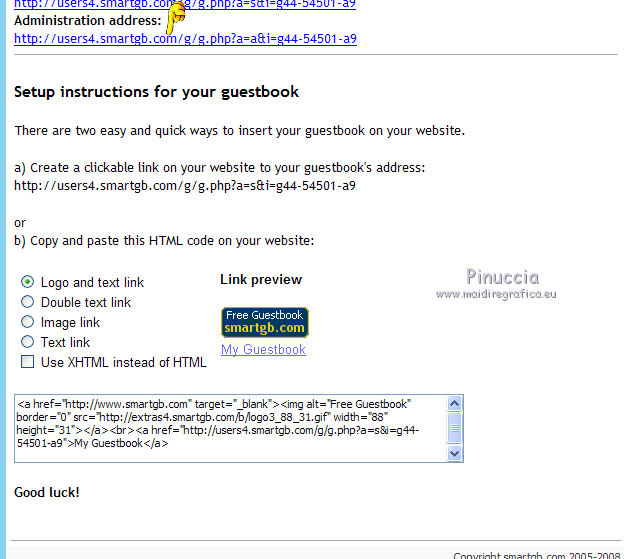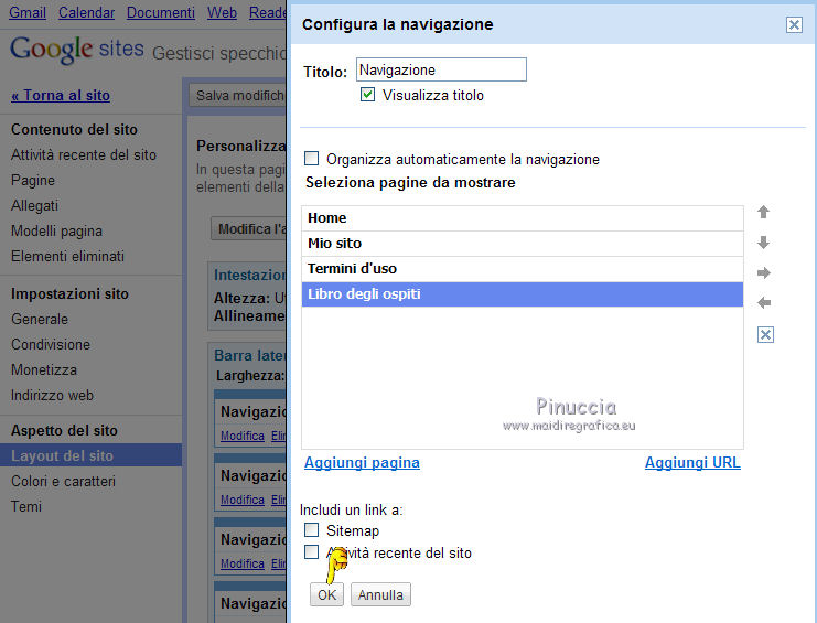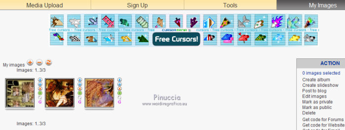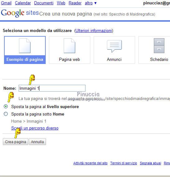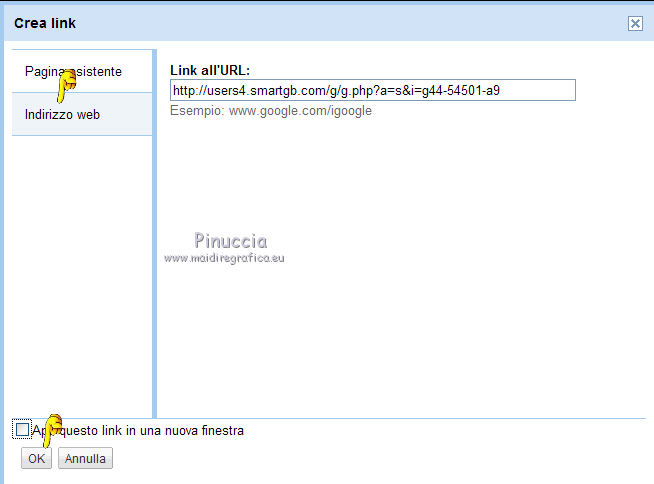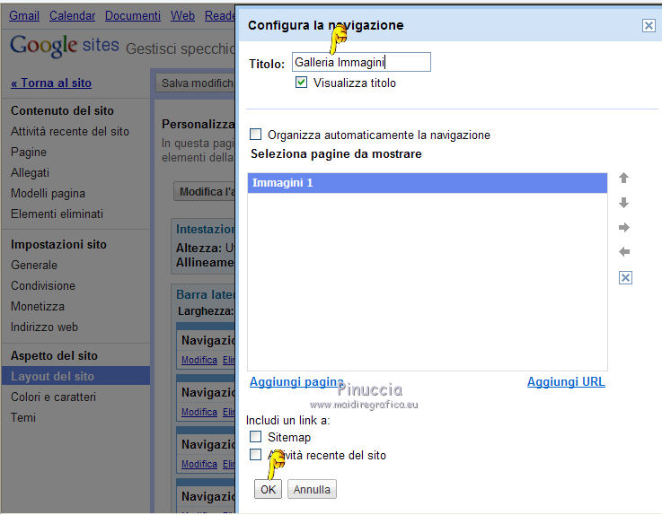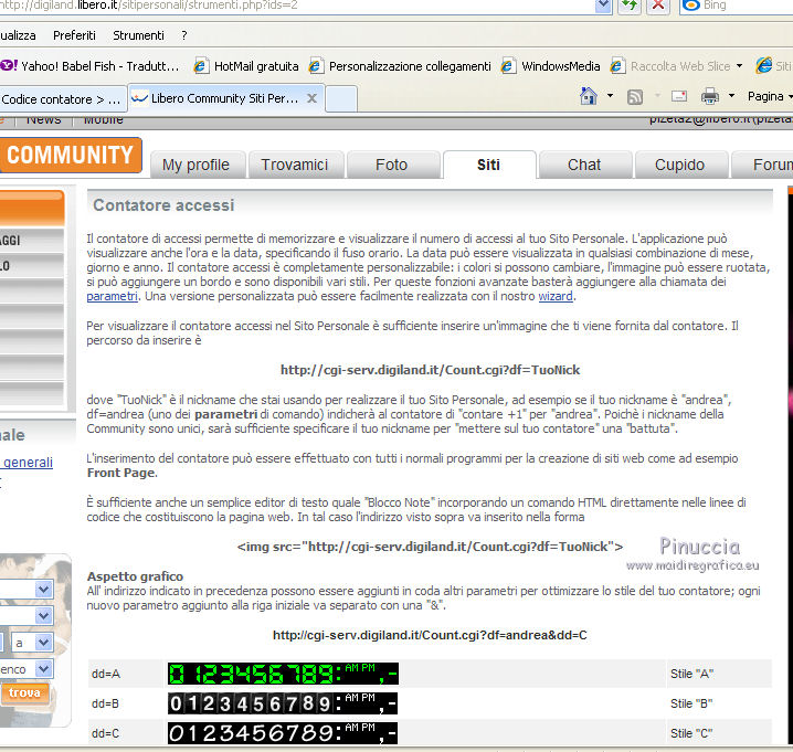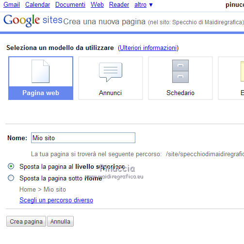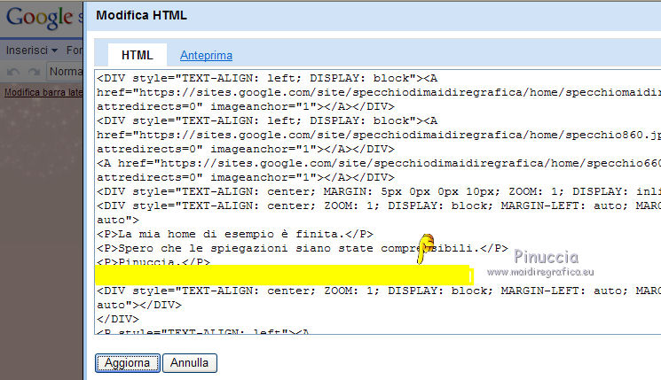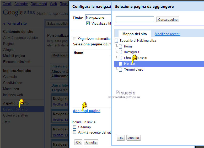 Questo tutorial è una creazione di ©Christa e non può essere copiato su altri siti nè essere offerto per il download. Lo stesso vale per la mia traduzione. pagina 1 ![]() Adesso alcuni appunti sul caricamento delle immagini da un sito hosting. L'esempio fornito da Christa si riferisce a un sito tedesco. Per questo ho scelto casualmente uno dei siti più frequentemente usati in Italia - Image Shack. In linea di massima il funzionamento è simile per tutti i siti di questo, ma non ti sarà difficile individuare eventuali varianti e adattare le spiegazioni a queste varianti. Su Image Shack non è necessario registrarsi, ma per illustrare l'esempio l'ho fatto, perchè non ho il tempo di seguire il percorso delle immagini inserite da utenti non registrati. Nel passare da una pagina all'altra di questo sito, è facile ritrovarsi con le pagine in inglese. Nessun problema: in questo caso, seleziona la lingua nel menu a tendina e ti ritroverai a "parlare" italiano. ![]() Per caricare le tue immagini, clicca su Browse per cercare sul tuo computer l'immagine che vuoi caricare. Prima di cliccare su Carica adesso, puoi usare le opzioni di caricamento/ridimensionamento, secondo le tue esigenze. ![]() Dopo aver caricato le tue immagini, clicca - sul menu superiore - su Mie immagini (il sito riprenderà a "parlare" in inglese), e vedrai tutte le immagini sin qui caricate. ![]() Per caricare l'immagine sul tuo sito, dovrai avere l'indirizzo dell'immagine. Per ottenerlo, seleziona l'immagine che vuoi caricare, e clicca sul primo pallino in alto (Share it). Questo farà aprire con la finestra dei vari link (copia il link adatto al tuo scopo). ![]() Passiamo ora al caricamento delle immagini sulla pagina di esempio che abbiamo usato alla fine della prima parte. Dopo Inserisci>Immagine, seleziona Indirizzo web. ![]() E incolla l'indirizzo che hai copiato, cancellando la parte prima di http e quella dopo l'estensione del file. Se l'indirizzo è corretto vedrai subito l'anteprima dell'immagine. ![]() Clicca ok e ridimensiona nuovamente l'immagine come descritto nella pagina precedente. ![]() Per aggiungere le immagini ho occupato solo la prima linea. Clicca su Salva per salvare le modifiche e - in alto, su "elenco modelli" - clicca su Crea una nuova pagina da questo modello. ![]() Adesso crea una nuova pagina da questo modello. Inserisci un nome - nel mio esempio Immagini 1 - e Crea pagina. ![]() Nella finestra successiva clicca Salva per salvare le modifiche, e sarà disponibile nuovamente in alto a destra il menu iniziale. Ripeti Altre Azioni>Gestisci sito e seleziona Layout del sito. Clicca su Modifica di uno dei titoli della Navigazione - nel mio esempio Titolo 1 - e clicca su Aggiungi pagina. ![]() Nella finestra successiva ti apparirà l'albero delle pagine create. Seleziona la pagina e ok. ![]() A questo punto dai un nome al titolo - mel mio esempio Galleria Immagini - e ok. ![]() In questo modo potrai aggiungere quante pagine vuoi. Non dimenticare di Salvare le modifiche. 7. Navigazione: Home Richiama la tua pagina come hai fatto in precedenza. Crea delle nuove pagine per il menu di navigazione. Puoi seguire il percorso già descritto, oppure cliccare direttamente su Crea pagina del menu superiore. ![]() Assegna un nome alla pagina, lasciando sempre selezionato Sposta la pagina al livello superiore. ![]() Clicca su Crea pagina, e nella finestra successiva Salva. Quando hai creato le tue pagine per il menu di navigazione, ripeti il percorso che ormai ti sarà familiare e clicca su Modifica del primo titolo Navigazione; Aggiungi pagina, e seleziona la pagina da aggiungere dalla finestra successiva. ![]() Quando hai aggiunto tutte le pagine che andranno sotto questo Titolo, clicca su Ok. Nel mio esempio ho aggiunto anche il Libro degli ospiti, di cui parleremo dopo. ![]() 8. Come collegare testo e immagini. Per aggiungere un testo alle pagine, clicca su Modifica pagina. ![]() Scrivi il tuo testo; per collegare il testo, seleziona la parola e clicca su "link". ![]() Nella finestra successiva seleziona "Indirizzo Web", scrivi l'indirizzo del collegamento, e ok. ![]() E la parola selezionata avrà il collegamento attivo. ![]() Se invece vuoi collegare un testo a una pagina del tuo sito, dopo aver selezionato la parola e cliccato su "link". ![]() Nella finestra successiva, le selezioni saranno differenti: dovrai selezionare Pagina esistente; attivare la Mappa del sito e selezionare la pagina da collegare: ![]() 9. Il libro degli ospiti. Ci sono diversi siti che offrono guestbook gratuiti. Per illustrare l'esempio ho usato questo http://www.smartgb.com/ Esegui i passaggi necessari di registrazione e attivazione del libro degli ospiti. Copia l'indirizzo del guestbook che troverai nell'ultima pagina con le istruzioni. ![]() Adesso dovrai inserire il link nella tua pagina degli ospiti. Clicca su Modifica>Pagina e scrivi un testo di benvenuto, per illustrare il mio esempio, ho scritto solamente il titolo: Libro degli ospiti. Seleziona il testo e - come hai già imparato a fare - clicca su Link. ![]() Nella finestra successiva, incolla l'indirizzo del libro. ![]() Ora la scritta sarà collegata al Libro degli ospiti. Se vuoi, Puoi anche aggiungere un contatore per le visite. La home page è la pagina più adatta. Per illustrare il mio esempio, ho usato il contatore della mia home di Maidiregrafica.eu. E' il primo contatore utilizzato quando ho creato il sito nel 2006 con gli strumenti di Libero.it Dopo il login, ho selezionato Applicazioni. ![]() Nella pagina successiva ci sono gli strumenti a disposione degli utenti. Ho selezionato Contatori. E, ancora, nella nuova pagina, ho scelto il contatore per la mia home. Seguendo le chiare istruzioni, ho copiato il relativo codice. ![]() Puoi seguire il mio esempio o scegliere tra i vari servizi free che trovi in rete. Per inserire il codice nella tua home, vai a Modifica>Pagina, sulla barra degli strumenti clicca su html: ![]() Poi incolla il codice dopo l'ultimo test