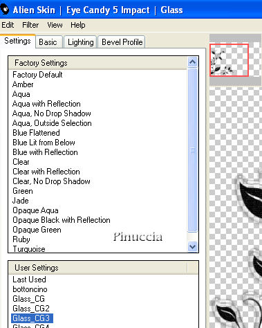 Metti i preset Glass_CG2 e Glass_CG3 nella cartella del filtro: Alien Skin Eye Candy 5 Impact>Settings>Glass. Se preferisci, puoi importarlo direttamente dalla cartella in cui hai scompattato il materiale, quando ti servirà.
