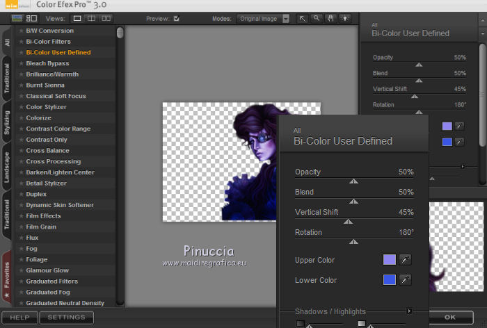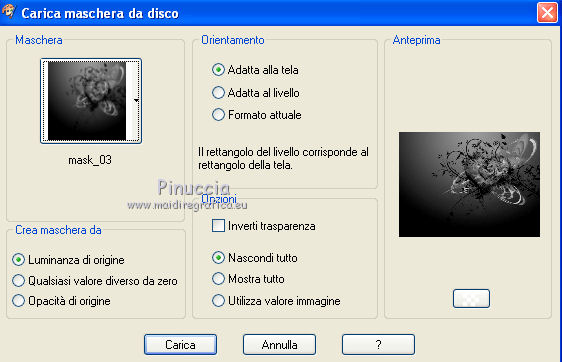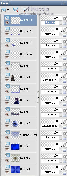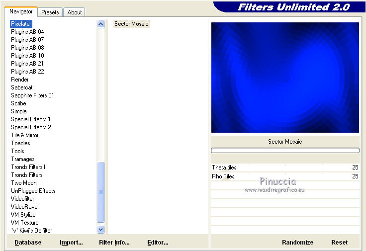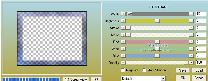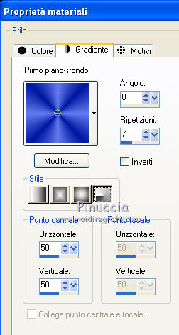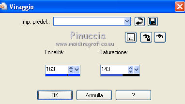 qui puoi trovare qualche risposta ai tuoi dubbi. Se l'argomento che ti interessa non è presente, ti prego di segnalarmelo. Questo tutorial è stato creato con PSP 9, ma può essere eseguito anche con le altre versioni di PSP. Per tradurlo, ho usato PSP X. Questo tutorial è una creazione di ©Christa e non può essere copiato su altri siti nè essere offerto per il download. Lo stesso vale per la mia traduzione. Il materiale viene da vari gruppi di condivisione. Il copyright appartiene ai rispettivi autori. Grazie ai creatori dei tubes che mettono a disposizione il loro lavoro in vari gruppi di condivisione. Occorrente: Materiale qui Per i tubes grazie Chaosgaby. Per la maschera grazie Adita Rispetta il lavoro degli autori, non cambiare il nome del file e non cancellare il watermark. Filtri: in caso di dubbi, ricorda di consultare la mia sezione filtri qui Filters Unlimited qui Pixelate - Sector Mosaic qui Xero - Improver qui Nik Software - Color Efex Pro qui AAA Frames - Transparent Frame e Texture Frame qui Graphics Plus - Cross Shadow qui ![]() Metti la maschera nella cartella Maschere, e apri il resto del materiale in PSP. 1. Apri una nuova immagine trasparente 860 x 645 pixels. Imposta il colore di primo piano con il colore chiaro #637aef, e il colore di sfondo con il colore scuro #00169f Riempi l'immagine trasparente con il colore di sfondo (tasto destro del mouse).Effetti>Plugins>Graphics Plus - Cross Shadow, con i settaggi standard: ![]() Effetti>Plugins>Filters Unlimited - Pixelate - Sector Mosaic. ![]() Effetti>Effetti di bordo>Aumenta. 2. Livelli>Nuovo livello raster. Riempi con il colore di primo piano.Livelli>Carica/Salva maschera>Carica maschera da disco. Cerca e carica la maschera mask_03. ![]() Livelli>Unisci>Unisci gruppo. Effetti>Effetti 3D>Sfalsa ombra, con il colore nero. ![]() Apri il tube con lo sfondo - il mio chg.7.24102010.pspimage - e vai a Modifica>Copia. Torna al tuo lavoro e vai a Modifica>Incolla come nuovo livello. Regola>Tonalità e saturazione>Viraggio - con i valori Tonalità (H) e Saturazione (S) corrispondenti al tuo colore di primo piano, ma con il valore di Saturazione un po' più basso. I miei: ![]() Cambia la modalità di miscelatura di questo livello in Luminanza (esistente). 3. Apri element_cg.pspimage e vai a Modifica>Copia. Torna al tuo lavoro e vai a Modifica>Incolla come nuovo livello. Sposta questo elemento in basso.Se stai usando altri colori, colorizza. Il livello è correttamente impostato in Luce netta. Apri "chg.1.24102010.pspimage" e vai a Modifica>Copia. Torna al tuo lavoro e vai a Modifica>Incolla come nuovo livello. Sposta il tube a destra.Per il mio tube (se stai usando un altro tube, dovrai valutare se e come usare il filtro in base al tube e ai suoi colori): Effetti>Plugins>Nik software - Color Efex Pro - Bi-Color User Defined. Upper Color: #8f85f1 Lower Color: #3a56e4. ![]() Effetti>Effetti 3D>Sfalsa ombra, con il colore nero. ![]() Effetti>Plugins>Xero - Improver. ![]() 4. Apri "chg.6.03102010.pspimage" e vai a Modifica>Copia. Torna al tuo lavoro e vai a Modifica>Incolla come nuovo livello. Immagine>Ridimensiona, al 75%, tutti i livelli non selezionato. Sposta il tube a sinistra.Cambia la modalità di miscelatura di questo livello in Sovrapponi. Effetti>Effetti 3D>Sfalsa ombra, con i settaggi precedenti. Effetti>Plugins>Xero - Improver, con i settaggi precedenti. Attiva il livello Raster 1. Selezione>Seleziona tutto. Immagine>Ritaglia la selezione. Immagine>Dimensione tela. ![]() Livelli>Nuovo livello raster. Livelli>Disponi>Porta sotto. Passa il colore di piano a Gradiente. ![]() Riempi il livello con il gradiente.5. Apri "element1_cg.pspimage" e vai a Modifica>Copia. Torna al tuo lavoro e vai a Modifica>Incolla come nuovo livello. (la modalità di questo elemento è in Luce netta). Se necessario, colorizza. Effetti>Effetti di bordo>Aumenta di più. Apri "element_rand_cg.pspimage" e vai a Modifica>Copia. Torna al tuo lavoro e vai a Modifica>Incolla come nuovo livello. Livelli>Disponi>Porta in alto (anche questo elemento è in modalità Luce netta). Effetti>Effetti di bordo>Aumenta di più. Effetti>Plugins>AAA Frames - Foto Frame. ![]() 6. Adesso aggiungi gli elementi decorativi che preferisci o usa quelli forniti con il materiale. Su tutti: Effetti>Effetti 3D>Sfalsa ombra, con i settaggi precedenti. Apri il file con il testo - o, se preferisci, scrivi un tuo testo - e vai a Modifica>Copia. Torna al tuo lavoro e vai a Modifica>Incolla come nuovo livello. Posiziona il testo come preferisci.Aggiungi il tuo nome e/o il tuo watermark su un nuovo livello. Questa dovrebbe essere la tua paletta dei livelli. ![]() Livelli>Unisci>Unisci tutto. Immagine>Dimensione tela (se non vuoi mandare l'immagine a Christa, puoi decidere se ridimensionare e in quale misura). ![]() Hai finito. Puoi salvare il tuo lavoro in formato jpg. Per inviare a Christa Mail Se vuoi mandare a me, trovi la mail sulla barra del menu in alto. ![]() Se hai problemi o dubbi, o trovi un link non funzionante, o anche soltanto per un saluto, scrivimi. 1 Novembre 2010 |