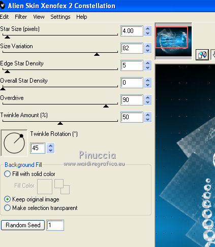 Effetti>Plugins>Alien Skin Xenofex 2.0 - Constellation, con gli stessi settaggi, ma cliccando una volta su Random Seed.