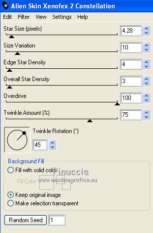 Effetti>Plugins>Alien Skin Xenofex 2.0 - Constellation, cambia soltanto Star Size, senza Random Seed.