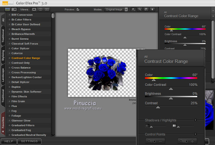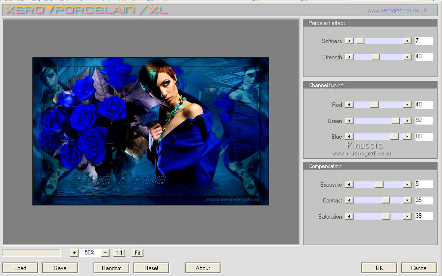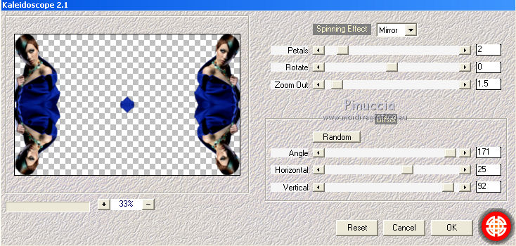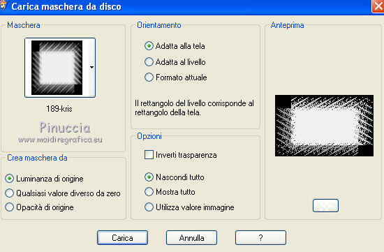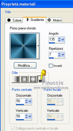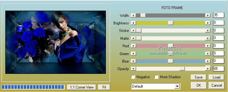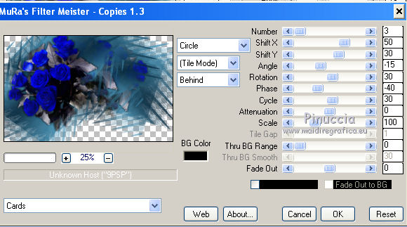 qui puoi trovare qualche risposta ai tuoi dubbi. Se l'argomento che ti interessa non è presente, ti prego di segnalarmelo. Questo tutorial è stato creato con PSP 9, ma può essere eseguito anche con le altre versioni di PSP. Per tradurlo, ho usato PSP X. Questo tutorial è una creazione di ©Christa e non può essere copiato su altri siti nè essere offerto per il download. Lo stesso vale per la mia traduzione. Il materiale viene da vari gruppi di condivisione. Il copyright appartiene ai rispettivi autori. Grazie ai creatori dei tubes che mettono a disposizione il loro lavoro in vari gruppi di condivisione. Occorrente: Materiale qui Grazie Chaosgaby e Colombe per i tubes. Rispetta il lavoro degli autori, non cambiare il nome del file e non cancellare il watermark. Filtri: in caso di dubbi, ricorda di consultare la mia sezione filtri qui Nick Software - Color Efex Pro qui Mehdi - Kaleidoscope 2.1 qui Xero - Improver qui Xero - Porcelain XL qui AAA Frames - Foto Frame qui Flaming Pear - Flood qui Mura's Meister - Copies qui Graphics Plus - Cross Shadow qui ![]() Metti la maschera nella cartella Maschere, e apri il resto del materiale in PSP. 1. Apri una nuova immagine trasparente 960 x 600 pixels. Imposta il colore di primo piano con il colore chiaro #4d9abd, e il colore di sfondo con il colore scuro #042336. Riempi l'immagine trasparente con il colore di sfondo (tasto destro del mouse).Effetti>Plugins>Graphics Plus - Cross Shadow. ![]() 2. Livelli>Nuovo livello raster. Passa il colore di primo piano a Gradiente. ![]() Riempi il livello con il gradiente.Regola>Sfocatura>Sfocatura gaussiana - raggio 25. ![]() Apri "roses-bleu-t7-tube-colombe.pspimage" e vai a Modifica>Copia. Torna al tuo lavoro e vai a Modifica>Incolla come nuovolivello. Effetti>Effetti 3D>sfalsa ombra, con il colore nero. ![]() Ripeti l'Effetto Sfalsa ombra, cambiando verticale e orizzontale con -5. Effetti>Plugins>Nik Software - Color Efex Pro - Contrast Color Range. I miei settaggi (con altri colori e altri tuben dovrai sperimentare i settaggi più adatti). ![]() Effetti>Plugins>Xero - Improver. ![]() Livelli>Unisci>Unisci giù. 3. Livelli>Carica/Salva maschera>Carica maschera da disco. Cerca e carica la maschera 189-kris. ![]() Livelli>Unisci>Unisci gruppo. Effetti>Plugins>Mura's Meister - Copies. ![]() Effetti>Plugins>Flaming Pear - Flood. ![]() 4. Apri "chg.28.01072010.pspimage" e vai a Modifica>Copia. Torna al tuo lavoro e vai a Modifica>Incolla come nuovo livello. Immagine>Ridimensiona, al 75%, tutti i livelli non selezionato. Sposta il tube accanto ai fiori.Effetti>Plugins>Flaming Pear - Flood, con i settaggi precedenti. Livelli>Duplica. Effetti>Plugins>Mehdi - Kaleidoscope 2.1. ![]() Attiva lo strumento Selezione , rettangolo,e seleziona l'immagine al centro. ![]() Premi sulla tastiera il tasto CANC. Selezione>Deseleziona. Cambia la modalità di miscelatura di questo livello in Luce diffusa. Attiva il livello sottostante del tube originale. Effetti>Effetti 3D>Sfalsa ombra, con il colore nero. ![]() Effetti>Plugins>Xero - Improver, con i settaggi precedenti. 5. Livelli>Unisci>Unisci tutto. Effetti>Plugins>AAA Frames - Foto Frame. ![]() Apri il file con il testo e vai a Modifica>Copia. Torna al tuo lavoro e vai a Modifica>Incolla come nuovo livello. Aggiungi il tuo nome e/o il tuo watermark su un nuovo livello. Livelli>Unisci>Unisci tutto. Effetti>Plugins>Xero - Porcelain XL. ![]() Salva in formato jpg. Per queste varianti, ho usato tube di LuzCristina, Claudia Viza, Aclis e Moni. ![]() ![]() ![]() Se hai problemi o dubbi, o trovi un link non funzionante, o anche soltanto per un saluto, scrivimi. 3 Agosto 2010 |