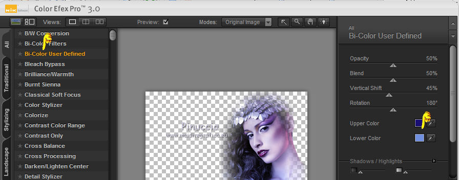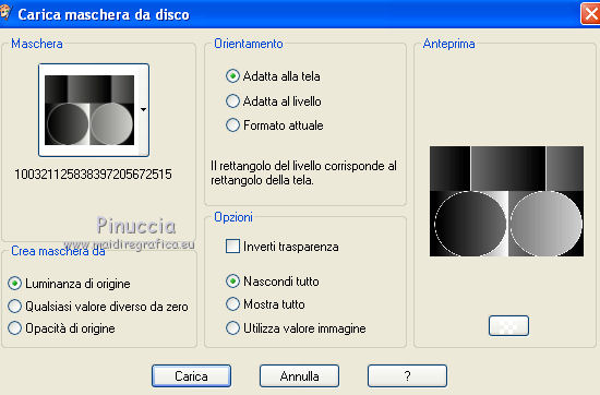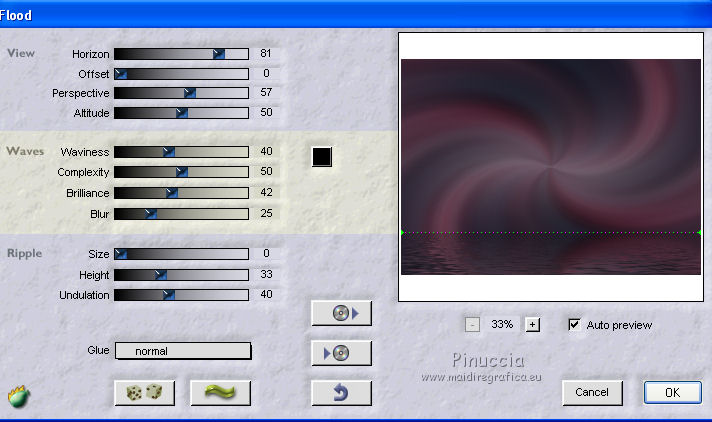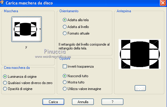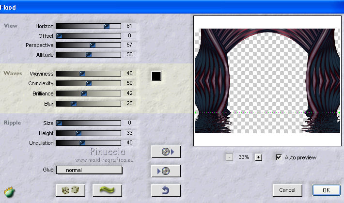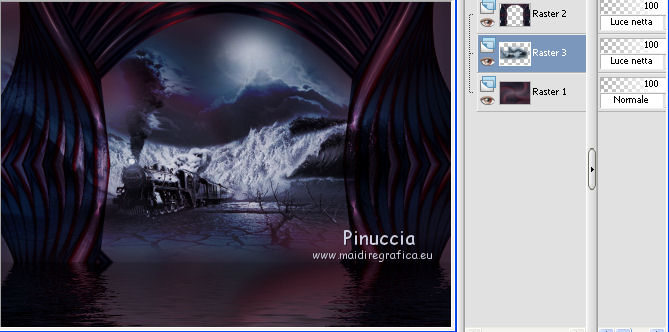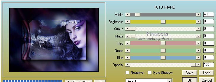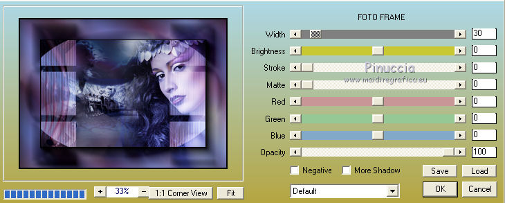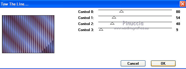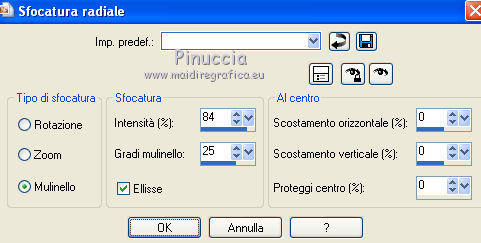 qui puoi trovare qualche risposta ai tuoi dubbi. Se l'argomento che ti interessa non è presente, ti prego di segnalarmelo. Questo tutorial è stato creato con PSP 9, ma può essere eseguito anche con le altre versioni di PSP. Per tradurlo, ho usato PSP X. Questo tutorial è una creazione di ©Christa e non può essere copiato su altri siti nè essere offerto per il download. Lo stesso vale per la mia traduzione. Il materiale viene da vari gruppi di condivisione. Il copyright appartiene ai rispettivi autori. Grazie ai creatori dei tubes che mettono a disposizione il loro lavoro in vari gruppi di condivisione. Occorrente: Materiale qui Per i tubes grazie Chaosgaby, Passion PSP, Keke Creation. Maschere Butterflymask, Edithsmask. Rispetta il lavoro degli autori, non cambiare il nome del file e non cancellare il watermark. Filtri: in caso di dubbi, ricorda di consultare la mia sezione filtri qui Flaming Pear - Flood qui Nik Color Efex qui AAA Frames - Foto Frame qui Xero - Improver qui ![]() Metti le maschere nella cartella Maschere, Apri il resto del materiale in PSP. Se non vuoi sentire la musica premi il tasto ESC 1. Apri image_cg.pspimage. Duplicala con la combinazione di tasti maiuscola+D e chiudi l'originale. La copia - che ha la dimensione di 900 x 650 pixels - sarà la base del tuo lavoro. Se stai usando colori diversi, colorizza l'immagine (sul Viraggio vedi qui). I miei colori: primo piano #6f7fc5, sfondo #5d3750. 2. Apri image2.pspimage" e vai a Modifica>Copia. Torna al tuo lavoro e vai a Modifica>Incolla come nuovo livello. Anche qui, se necessario, colorizza. Per il mio esempio non è necessario. Attiva il livello Raster 1. Regola>Sfocatura>Sfocatura radiale. ![]() Effetti>Plugins>Flaming Pear - Flood. ![]() Attiva il livello Raster 2. cambia la modalità di miscelatura di questo livello in Luce netta. Effetti>Plugins>Flaming Pear - Flood, con i settaggi precedenti. ![]() 3. Apri il tube di un paesaggio o quello che preferisci; - il mio "misted train passion.psp" - Modifica>Copia. Torna al tuo lavoro e vai a Modifica>Incolla come nuovo livello. Nella paletta dei livelli porta questo livello sopra Raster 1. Spostalo in alto,e cambia la modalità di miscelatura in Luce netta. ![]() Apri il tube "keke tube feerique7.pspimage" e vai a Modifica>Copia. Torna al tuo lavoro e vai a Modifica>Incolla come nuovo livello. Livelli>Disponi>Porta in alto. Sposta il tube in basso a sinistra.Cambia la modalità di miscelatura di questo livello in Luce diffusa. Effetti>Plugins>Xero - Improver: ![]() 4. Apri il tube con il viso - il mio chg.18102010.pspimage - e vai a Modifica>Copia. Torna al tuo lavoro e vai a Modifica>Incolla come nuovo livello. Immagine>Ridimensiona, all'85%, tutti i livelli non selezionato. ![]() Spostalo contro il bordo a destra.Effetti>Plugins>Nik Software - Color Efex Pro - Bi-Color User Defined, Lower Color: #708fde. ![]() 5. Livelli>Nuovo livello raster. Riempi con il colore di primo piano #6f7fc5.Livelli>Carica/Salva maschera>Carica maschera da disco. Cerca e carica la maschera 1003211258383.... ![]() Livelli>Unisci>Unisci gruppo. Cambia la modalità di miscelatura di questo livello in Luce diffusa. Livelli>Unisci>Unisci visibile. Effetti>Plugins>AAA Frames - Foto Frame - 2 volte con i seguenti settaggi. ![]() 6. Livelli>Nuovo livello raster. Passa il colore di primo piano a Gradiente. ![]() Riempi il nuovo livello con il gradiente.Effetti>Plugins>Tramages - Tow The Line. ![]() Livelli>Carica/Salva maschera>Carica maschera da disco. Cerca e carica la maschera "y". ![]() Livelli>Unisci>Unisci gruppo. Cambia la modalità di miscelatura di questo livello in Filtra. Livelli>Unisci>Unisci visibile. Effetti>Plugins>AAA Frames - Foto Frame - 2 volte con i seguenti settaggi. ![]() Scrivi un testo e aggiungi il tuo nome e/o il tuo watermark su un nuovo livello. Livelli>unisci>Unisci tutto e salva in formato jpg. ![]() Se hai problemi o dubbi, o trovi un link non funzionante, o anche soltanto per un saluto, scrivimi. 19 Ottobre 2010 |
