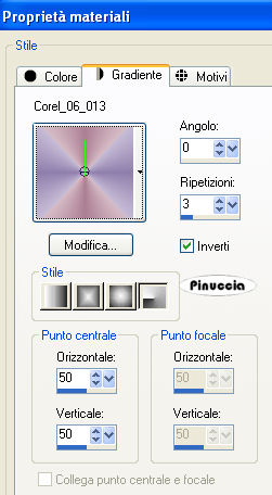 Imposta il colore di primo piano su Gradiente, e seleziona il gradiente Corel_06_13 con i seguenti settaggi.