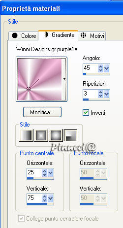 Passa il colore di primo piano a Gradiente, e seleziona il gradiente Winni.Designs.gr.purple1.a con i seguenti settaggi.