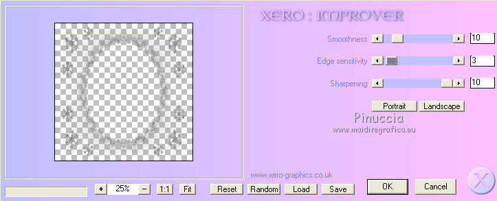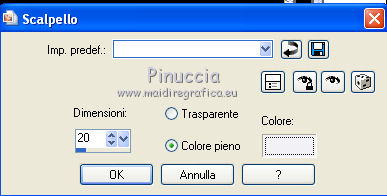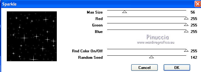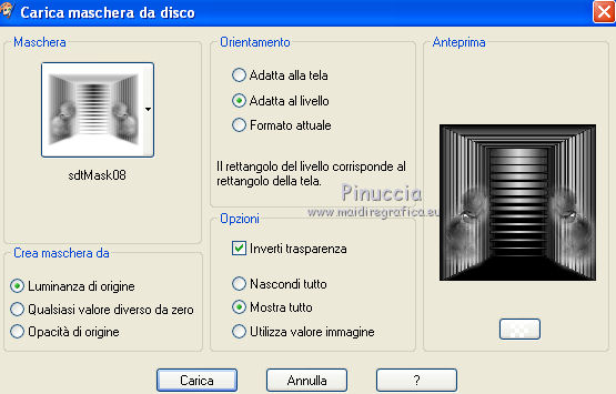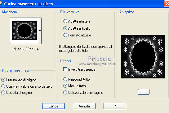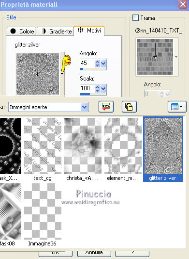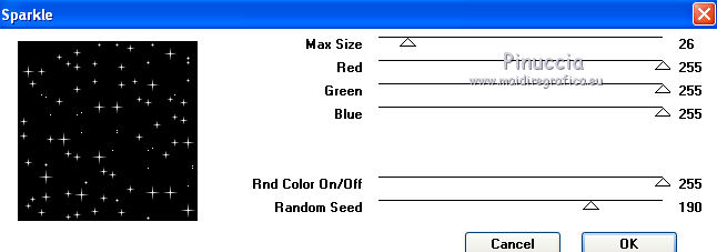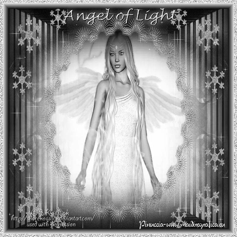 qui puoi trovare qualche risposta ai tuoi dubbi. Se l'argomento che ti interessa non è presente, ti prego di segnalarmelo. Questo tutorial è stato creato con PSP 9, ma può essere eseguito anche con le altre versioni di PSP. Per tradurlo, ho usato PSP X. Questo tutorial è una creazione di ©Christa e non può essere copiato su altri siti nè essere offerto per il download. Lo stesso vale per la mia traduzione. Il materiale viene da vari gruppi di condivisione. Il copyright appartiene ai rispettivi autori. Grazie ai creatori dei tubes che mettono a disposizione il loro lavoro in vari gruppi di condivisione. Rispetta il lavoro degli autori, non cambiare il nome del file e non cancellare il watermark. Occorrente: Un tube a scelta. Il resto del materiale qui Grazie http://andrekosslick.deviantart.com A.Kosslick per l'immagine usata con permesso. Christa richiede che sull'immagine sia aggiunto il testo: "© All copyrights belongs to the original artists. I'm just the designer" Filtri: in caso di dubbi, ricorda di consultare la mia sezione filtri qui Filters Unlimited 2.0 qui VM Natural - Sparkle qui Xero - Improver qui I filtri VM Natural, come tutti i filtri della serie Visman, si possono usare sia da soli che importandoli in Filters Unlimited Animation Shop qui Prima di iniziare anticipo una cosa importante per il tutorial. Le mie descrizioni si riferiscono sempre al modo in cui creo la mia immagine. Per altri tubes e colori, potrebbe essere necessario modificare le mie impostazioni. Gli elementi possono essere colorizzati. Questo non lo scriverò più nel tutorial. ![]() Metti le maschera nella cartella Maschere. Apri il motivo argento in PSP e minimizzalo con il resto del materiale. 1. Imposta il colore di primo piano con il colore #f0f1f5, e il colore di sfondo con il colore nero. Apri una nuova immagine trasparente 800 x 800 pixels, e riempila con il colore di sfondo.Apri il tuo tube. Per il mio lavoro ho usato un'immagine di Andre Kosslick, manipolata con l'applicazione di due maschere e il viraggio a 0/0. Modifica>Copia. Torna al tuo lavoro e vai a Modifica>Incolla come nuovo livello. Per il mio tube: Livelli>Duplica, modalità di miscelatura Filtra. 2. Livelli>Nuovo livello raster. Riempi con il colore di primo piano.Livelli>Carica/Salva maschera>Carica maschera da disco. Cerca e carica la maschera sdtMask08. ![]() Livelli>Unisci>Unisci gruppo. Immagine>Capovolgi. Attiva lo strumento Selezione , rettangolo,e traccia un rettangolo al centro della maschera. ho chiuso il livello del tube per illustrare meglio l'esempio ![]() Premi sulla tastiera il tasto CANC. Selezione>Deseleziona. Livelli>Carica/Salva maschera>Carica maschera da disco. Carica nuovamente la maschera. Livelli>Unisci>Unisci gruppo. Effetti>Plugins>Xero - Improver: ![]() Porta questo livello sotto il livello del tube. Attiva il livello del tube. Ripeti Effetti>Plugins>Xero - Improver. 3. Attiva il livello superiore. Passa il colore di sfondo a Motivi e - tra le immagini aperte - seleziona il motivo glitter zilver, con i seguenti settaggi. ![]() Livelli>Nuovo livello raster. Riempi il livello con il motivo argento.Livelli>Carica/Salva maschera>Carica maschera da disco. Cerca e carica la maschera sdtMask_XMas14. ![]() Livelli>Unisci>Unisci gruppo. Rinomina questo livello "maschera". il tube "element_maske2_cg" che trovi nel materiale è il risultato di questo passaggio. Livelli>Nuovo livello raster. Selezione>Seleziona tutto. Selezione>Modifica>Contrai - 10 pixels. Selezione>Inverti. Riempi con il colore chiaro di primo piano.Livelli>Nuovo livello raster. Riempi con il motivo argento.Cambia la modalità di miscelatura di questo livello in Dissolvi, e abbassa l'opacità al 26%. Livelli>Unisci>Unisci giù. Effetti>Plugins>Xero - Improver, con i settaggi precedenti. Effetti>Effetti 3D>Scalpello. ![]() Selezione>DEseleziona. 4. Attiva il livello Raster 1, e rinomina questo livello "sparke1". Effetti>Plugins>VM Natural - Sparkle. ![]() Livelli>Duplica e rinomina questo livello "sparkle2". Di nuovo Effetti>Plugins>VM Natural - Sparkle. ![]() Immagine>Capovolgi. Attiva il livello "sparkle 1". Livelli>Duplica, porta questo livello sopra il livello "sparkle2", e rinominalo "sparkle3". Effetti>Plugins>VM Natural - Sparkle con i settaggi precedenti. ![]() Immagine>Rifletti. Chiudi i livelli "sparkle2" e "sparkle3". 5. Attiva il livello "maschera". Livelli>Duplica - 2 volte. Rinomina i livelli "maschera 2" e "maschera 3". Attiva il livello "maschera 3". Effetti>Plugins>Xero - Improver. ![]() Chiudi questo livello e attiva il livello "maschera 2". Effetti>Plugins>Xero - Improver. ![]() Chiudi questo livello. Attiva il livello superiore. Scrivi il tuo testo o usa quello fornito con il materiale. Aggiungi il tuo nome e/o il tuo watermark senza dimenticare i copyright delle immagini usate. 6. Animazione. Modifica>Copia Unione. Apri Animation Shop e vai a Modifica>Incolla>Incolla come nuova animazione. Torna in PSP. Chiudi i livelli "maschera" e "sparkle1". Apri i livelli "maschera 2" e "sparkle 2". Modifica>Copia Unione. Torna in Animation Shop e vai a Modifica>Incolla>Incolla dopo il fotogramma corrente. Di nuovo in PSP. Chiudi i livelli "maschera 2" e "sparkle 2" e apri i livelli "maschera 3" e sparkle 3". Modifica>Copia Unione. In Animation Shop: Modifica>Incolla>Incolla dopo il fotogramma corrente. Modifica>Seleziona tutto. Animazione>Proprietà fotogramma, e imposta la velocità a 25. ![]() Controlla il risultato cliccando su Visualizza e salva in formato gif.![]() ![]() Se hai problemi o dubbi, o trovi un link non funzionante, o anche soltanto per un saluto, scrivimi. 29 Novembre 2011 |