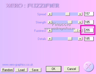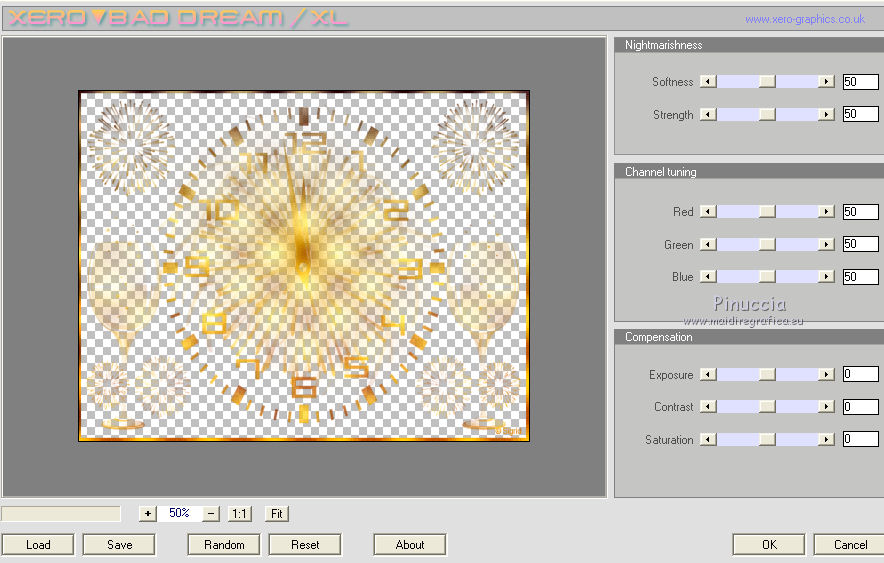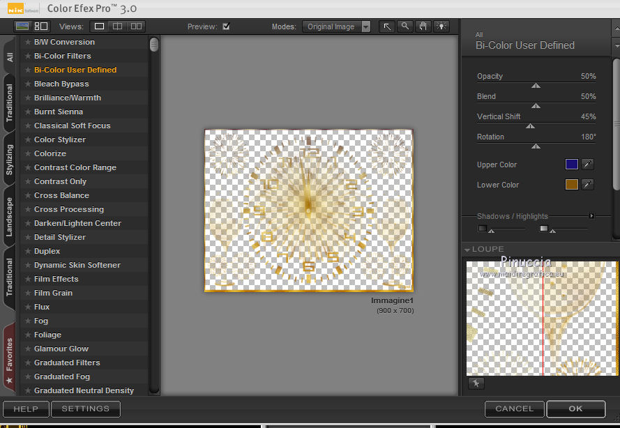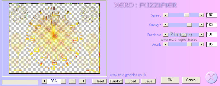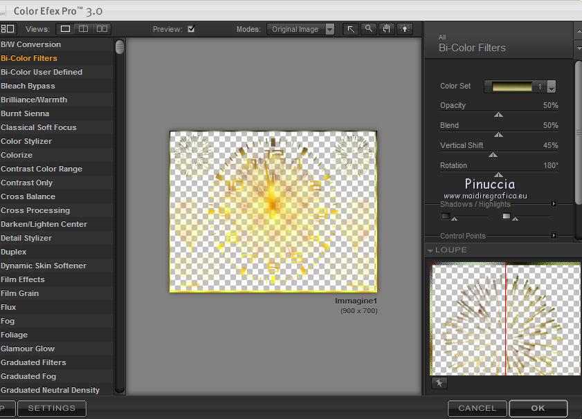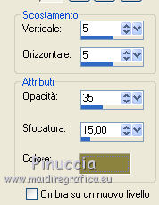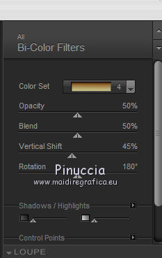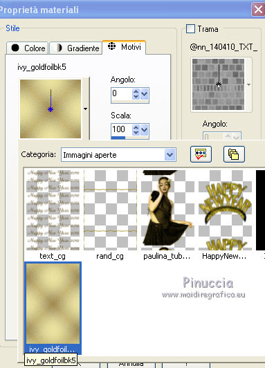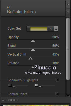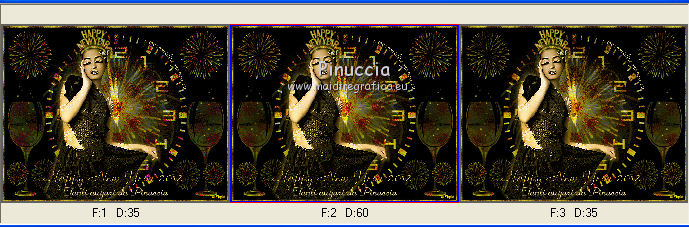 qui puoi trovare qualche risposta ai tuoi dubbi. Se l'argomento che ti interessa non è presente, ti prego di segnalarmelo. Questo tutorial è stato creato con PSP 9, ma può essere eseguito anche con le altre versioni di PSP. Per tradurlo, ho usato PSP X. Questo tutorial è una creazione di ©Christa e non può essere copiato su altri siti nè essere offerto per il download. Lo stesso vale per la mia traduzione. Il materiale viene da vari gruppi di condivisione. Il copyright appartiene ai rispettivi autori. Grazie ai creatori dei tubes che mettono a disposizione il loro lavoro in vari gruppi di condivisione. Rispetta il lavoro degli autori, non cambiare il nome del file e non cancellare il watermark. Occorrente: Materiale qui Per il tube grazie Paulina Filtri: in caso di dubbi, ricorda di consultare la mia sezione filtri qui Xero - Bad Dream XL qui Xero - Improver, Fuzzifier qui Nik Software - Color Efex Pro qui Animation Shop qui Prima di iniziare anticipo una cosa importante per il tutorial. Le mie descrizioni si riferiscono sempre al modo in cui creo la mia immagine. Per altri tubes e colori, potrebbe essere necessario modificare le mie impostazioni. Gli elementi possono essere colorizzati. Questo non lo scriverò più nel tutorial. ![]() se non vuoi sentire la musica, premi il tasto ESC Metti la maschera nella cartella Maschere. Apri il motivo oro in PSP e minimizzalo con il resto del materiale. 1. Imposta il colore di primo piano con il colore nero #000000. Passa il colore di sfondo a Motivi e cerca il motivo oro tra le Immagini aperte. ![]() Apri una nuova immagine trasparente 900 x 700 pixels, e riempila con il colore nero.Livelli>Nuovo livello raster. Riempi con il motivo oro.Livelli>Carica/Salva maschera>Carica maschera da disco. Cerca e carica la maschera silvestermaske05_sigrid. ![]() 2. Effetti>Plugins>Nik Software - Color Efex Pro - Bi-Color User Defined. ![]() Effetti>Plugins>Xero - Bad Dream XL. ![]() Livelli>Duplica - 2 volte, e rimani posizionato sul livello della seconda copia. Effetti>Plugins>Nik Software - Color Efex Pro - Bi-Color Filters. Scegli a destra un Colorset - per il mio esempio Green/Brown1. ![]() Effetti>Plugins>Xero - Fuzzifier. ![]() Chiudi questo livello e attiva il livello della prima copia. 3. Effetti>Plugins>Nik Software - Color Efex Pro - Bi-Color Filters. Cambia Colorset - per il mio esempio Brown 4. ![]() Effetti>Plugins>Xero - Fuzzifier - cambia soltanto Fuzziness con 213. ![]() Chiudi questo livello e attiva il livello originale della maschera. Effetti>Plugins>Nik Software - Color Efex Pro - Bi-Color Filters. Cambia nuovamente Colorset - per il mio esempio Moss 4. ![]() Effetti>Plugins>Xero - Fuzzifier - Fuzziness a 255 e ok. ![]() Lascia il livello visibile. 4. Attiva il livello superiore. Apri il tuo tube e vai a Modifica>Copia. Torna al tuo lavoro e vai a Modifica>Incolla come nuovo livello. Posiziona il tube come preferisci.Effetti>Plugins>Xero - Improver. ![]() Effetti>Effetti 3D>Sfalsa ombra, con un colore scelto dall'immagine. Per l'esempio #8c833f. ![]() Ripeti l'Effetto Sfalsa ombra, cambiando verticale e orizzontale con 5-. Apri "text" e vai a Modifica>Copia. Torna al tuo lavoro e vai a Modifica>Incolla come nuovo livello. Spostalo in basso.Per questo testo sono stati usati i seguenti settaggi. settaggi con Psp 9; dovrai regolare la dimensione in base al testo e alla versione di PSP che stai usando. ![]() Apri "happyNewYear2012.psd" e vai a Modifica>Copia. Torna al tuo lavoro e vai a Modifica>Incolla come nuovo livello. Spostalo sui capelli della donna.Apri "rand_cg.psd" e vai a Modifica>Copia. Torna al tuo lavoro e vai a Modifica>Incolla come nuovo livello. Aggiungi il tuo nome e/o il tuo watermark senza dimenticare eventuali copyright delle immagini usate. 5. Animazione. Modifica>Copia Unione. Apri Animation Shop e vai a Modifica>Incolla>Incolla come nuova animazione. Torna in PSP. Chiudi il livello della maschera e apri il livello della prima copia. Modifica>Copia Unione. Torna in Animation Shop e vai a Modifica>Incolla>Incolla dopo il fotogramma corrente. Di nuovo in PSP. Chiudi il livello della prima copia e apri il livello della seconda copia. Modifica>Copia Unione. In Animation Shop: Modifica>Incolla>Incolla dopo il fotogramma corrente. Modifica>Seleziona tutto. Animazione>Proprietà fotogramma, e imposta la velocità a 35. ![]() Clicca sul secondo fotogramma per selezionarlo. Animazione>Proprietà fotogramma e imposta la velocità a 60. ![]() Controlla il risultato cliccando su Visualizza e salva in formato gif.Per questo esempio ho usato un tube di Thafs. ![]() ![]() Se hai problemi o dubbi, o trovi un link non funzionante, o anche soltanto per un saluto, scrivimi. 28 Dicembre 2011 |