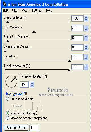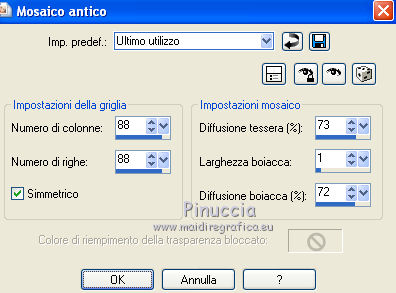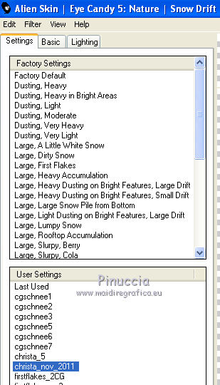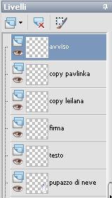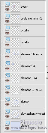 qui puoi trovare qualche risposta ai tuoi dubbi. Se l'argomento che ti interessa non è presente, ti prego di segnalarmelo. Questo tutorial è stato creato con PSP 9, ma può essere eseguito anche con le altre versioni di PSP. Per tradurlo, ho usato PSP X. Questo tutorial è una creazione di ©Christa e non può essere copiato su altri siti nè essere offerto per il download. Lo stesso vale per la mia traduzione. Il materiale viene da vari gruppi di condivisione. Il copyright appartiene ai rispettivi autori. Grazie ai creatori dei tubes che mettono a disposizione il loro lavoro in vari gruppi di condivisione. Rispetta il lavoro degli autori, non cambiare il nome del file e non cancellare il watermark. Occorrente: Materiale qui Per il bel poser grazie Leilana Per lo scrap grazie Pavlinka. Christa richiede che sull'immagine sia aggiunto il testo: "© All copyrights belongs to the original artists. I'm just the designer" Filtri: in caso di dubbi, ricorda di consultare la mia sezione filtri qui Alien Skin Xenofex 2.0 - Constellation qui Alien Skin Eye Candy 5 Nature - Snow Drift qui Animation Shop qui Prima di iniziare anticipo una cosa importante per il tutorial. Le mie descrizioni si riferiscono sempre al modo in cui creo la mia immagine. Per altri tubes e colori, potrebbe essere necessario modificare le mie impostazioni. Gli elementi possono essere colorizzati. Questo non lo scriverò più nel tutorial. ![]() Metti il preset nella cartella del filtro Alien Skin Eye Candy 5 Nature>Settings>Snow drift. Doppio clic sul file e il preset sarà automaticamente installato. Se preferisci puoi importarlo, quando ti servirà, dalla cartella in cui hai scompattato il materiale. Vedi la scheda del filtro qui e come importare un preset in Eye Candy qui 1. Apri una nuova immagine trasparente 826 x 768 pixels. ![]() Imposta il colore di primo piano con il colore chiaro #d8def1. Usa un colore più scuro - per l'esempio #8194d0 - che ti servirà per il Viraggio. Per questo, prendi nota dei valori di tonalità (H) e saturazione (S) di questo colore. ![]() 2. Apri element_maske_cg.psd e vai a Modifica>Copia. Torna al tuo lavoro e vai a Modifica>Incolla come nuovo livello. Livelli>Duplica, e attiva il livello sottostante dell'originale. Effetti>Effetti di trama>Mosaico antico. ![]() Modifica>Ripeti Mosaico antico. Attiva il livello della copia. Effetti>Effetti 3D>Sfalsa ombra, con il colore bianco. ![]() Questo Effetto Sfalsa dovrà essere applicato su tutti gli elementi dello scrap. in alternativa a questo passaggio, puoi semplicemente copiare e incollare l'elemento finale "maske+glasmosaic_cg". Effetti>Plugins>Alien Skin Eye Candy 5 Nature - Snow Drift. Seleziona il preset christa_november_2011 e ok. ![]() ![]() 2. Adesso descriverò gli elementi che ho inserito nell'esempio. Con il tuo materiale dovrai regolarti di conseguenza. Per primo ho copiato e incollato come nuovo livello il cluster PalvinkaDesigns_LoveBeginsInWinter_cluster3.png. ![]() Dopo ho copiato e incollato come nuovo livello, e posizionato in basso PalvinkaDesigns_LoveBeginsInWinter_el(57). Apri element2_cg.psd e vai a Modifica>Copia. Torna al tuo alvoro e vai a Modifica>Incolla come nuovo livello. Spostalo in basso.![]() Successivamente, ho copiato e incollato come nuovo livello, e posizionato in alto a sinistra PalvinkaDesigns_LoveBeginsInWinter_el(42). Regola>Tonalità e Saturazione>Viraggio con i valori corrispondenti al colore scuro scelto prima di iniziare. ![]() Livelli>Duplica. Immagine>Rifletti. ![]() Ho copiato e incollato come nuovo livello PalvinkaDesigns_LoveBeginsInWinter_el(3). Livelli>Disponi>Sposta giù. Ho spostato il livello un po' più in alto e a destra.Effetti>Plugins>Alien Skin Eye Candy 5 Nature - Snow Drift, con i settaggi precedenti. ![]() 5. Ho copiato e incollato come nuovo livello i due tubes degli uccelli. Viraggio e Sfalsa ombra, e li ho posizionati sulla finestra. ![]() Attiva il livello superiore. Apri il tube dollies19 e vai a Modifica>Copia. Torna al tuo lavoro e vai a Modifica>Incolla come nuovo livello. Effetti>Effetti 3D>Sfalsa ombra, con i settaggi precedenti. Sposta il tube a sinistra.Attiva lo strumento Clonazione ![]() ![]() Attiva il livello della neve e clicca con il tasto destro del mouse su una porzione di neve. ![]() Attiva nuovamente il livello del poser e clicca con il tasto sinistro del mouse sul piede del poser ![]() in modo che sembri in parte sommerso dalla neve. ![]() 4. A questo punto ho copiato e incollato come nuovo livello il poser del pupazzo di neve. Viraggio ed Effetto Sfalsa ombra e l'ho posizionato in basso a destra. ![]() Ho copiato e incollato come nuovo livello il file di testo. Viraggio+Effetto Sfalsa ombra e l'ho posizionato in basso. Aggiungi il tuo nome e/o il tuo watermark, e i copyright delle immagini usate su nuovi livelli. Questa è la mia paletta dei livelli. ![]() ![]() 5. Animazione. Attiva il livello della finesta o quello che vuoi animare. Effetti>Plugins>Alien Skin Xenofex 2.0 - Constellation. ![]() Modifica>Copia Unione. Apri Animation Shop e vai a Modifica>Incolla>Incolla come nuova animazione. Torna in PSP. Modifica>Annulla azione Constellation. Effetti>Plugins>Alien Skin Xenofex 2.0 - Constellation, clicca su Random Seed e ok. Modifica>Copia Unione. Torna in Animation Shop e vai a Modifica>Incolla>Incolla dopo il fotogramma corrente. Di nuovo in PSP. Modifica>Annulla azione Constellation. Effetti>Plugins>Alien Skin Xenofex 2.0 - Constellation, clicca su Random Seed e ok. Modifica>Copia Unione. In Animation Shop: Modifica>Incolla>Incolla dopo il fotogramma corrente. Controlla il risultato cliccando su Visualizza e salva in formato gif.![]() Se hai problemi o dubbi, o trovi un link non funzionante, o anche soltanto per un saluto, scrivimi. 18 Novembre 2011 |