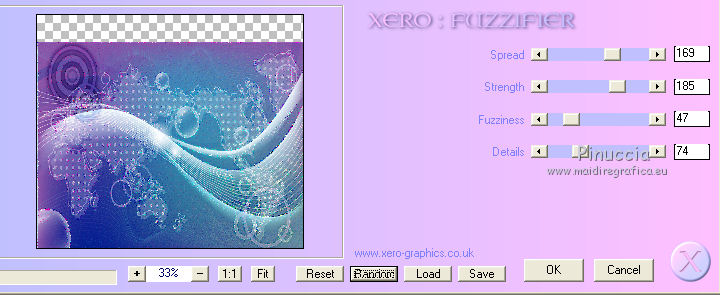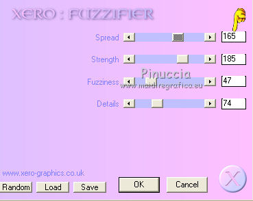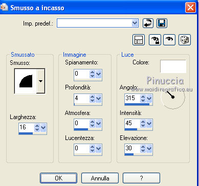 qui puoi trovare qualche risposta ai tuoi dubbi. Se l'argomento che ti interessa non è presente, ti prego di segnalarmelo. Questo tutorial è stato creato con PSP 9, ma può essere eseguito anche con le altre versioni di PSP. Per tradurlo, ho usato PSP X. Questo tutorial è una creazione di ©Christa e non può essere copiato su altri siti nè essere offerto per il download. Lo stesso vale per la mia traduzione. Il materiale viene da vari gruppi di condivisione. Il copyright appartiene ai rispettivi autori. Grazie ai creatori dei tubes che mettono a disposizione il loro lavoro in vari gruppi di condivisione. Rispetta il lavoro degli autori, non cambiare il nome del file e non cancellare il watermark. Occorrente: Materiale qui Per i tubes grazie Chaosgaby e JPRings. Christa richiede che sull'immagine sia aggiunto il testo: "© All copyrights belongs to the original artists. I'm just the designer" Filtri: in caso di dubbi, ricorda di consultare la mia sezione filtri qui Xero - Improver, Fuzzifier qui Xero - Bad Dream XL qui Animation Shop qui Prima di iniziare anticipo una cosa importante per il tutorial. Le mie descrizioni si riferiscono sempre al modo in cui creo la mia immagine. Per altri tubes e colori, potrebbe essere necessario modificare le mie impostazioni. Gli elementi possono essere colorizzati. Questo non lo scriverò più nel tutorial. ![]() 1. Apri una nuova immagine trasparente 800 x 700 pixels. Imposta il colore di primo piano con il colore bianco #ffffff, e il colore di sfondo con #c0c1cc. Riempi l'immagine trasparente con il colore di sfondo.Livelli>Nuovo livello raster. Selezione>Seleziona tutto. Apri "f111910.psd" e vai a Modifica>Copia. Torna al tuo lavoro e vai a Modifica>Incolla nella selezione. Selezione>Deseleziona. Cancella il testo.Cambia la modalità di miscelatura di questo livello in Luminanza. Livelli>Duplica. Livelli>Disponi>Sposta giù. Immagine>Capovolgi. Attiva il livello superiore dell'originale. Attiva lo strumento bacchetta magica ![]() e clicca sulla striscia trasparente per selezionarla. ![]() Livelli>Nuovo livello raster. Apri element_streifen_cg.psd e vai a Modifica>Copia. Torna al tuo lavoro e vai a Modifica>Incolla nella selezione. Selezione>Deseleziona. Apri il tube del viso e vai a Modifica>Copia. Torna al tuo lavoro e vai a Modifica>Incolla come nuovo livello. Immagine>Ridimensiona, al 90%, tutti i livelli non selezionato. Livelli>Disponi>Sposta giù. Effetti>Plugins>Xero - Improver ![]() 3. Apri snowflakes_cg.psd e vai a Modifica>Copia. Torna al tuo lavoro e vai a Modifica>Incolla come nuovo livello. Livelli>Disponi>Sposta giù. Apri il file di testo e vai a Modifica>Copia. Torna al tuo lavoro e vai a Modifica>Incolla come nuovo livello. Livelli>Disponi>Porta in alto. se vuoi il mio testo prendilo qui Apri "snow_cg.psd" e copia il livello "snow1". Torna al tuo lavoro e vai a Modifica>Incolla come nuovo livello. Nella paletta dei livelli porta questo livello sotto quello del viso. Rinomina il livello "neve 1". Attiva nuova "snow_cg.psd". Apri e attiva il livello "snow2" e vai a Modifica>Copia. Torna al tuo lavoro e vai a Modifica>Incolla come nuovo livello. Rinomina il livello "neve 2". Attiva ancora una volta "snow_cg.psd". Apri e attiva il livello "snow3" e vai a Modifica>Copia. Torna al tuo lavoro e vai a Modifica>Incolla come nuovo livello. Rinomina il livello "neve 3". Chiudi i livelli "neve 2" e "neve 3". Questa dovrebbe essere la tua paletta dei livelli. ![]() 4. Apri rand_cg.psd e vai a Modifica>Copia. Torna al tuo lavoro e vai a Modifica>Incolla come nuovo livello. Livelli>Disponi>Porta in alto. Clicca al centro con la bacchetta magica ![]() Selezione>Inverti. Effetti>Effetti 3D>Smusso a incasso. ![]() Selezione>Inverti. Effetti>Effetti 3D>Ritaglio, con il colore bianco. ![]() Selezione>Deseleziona. Aggiungi il tuo nome e/o il tuo watermark e l'avviso del copyright su un nuovo livello. 5. Attiva il livello jsprings2. Livelli>Duplica - 2 volte, e rinomina i livelli "jprings1", "jprings2" e "jprings3". Attiva il livello "jprings3". Effetti>Plugins>Xero - Fuzzifier. ![]() Chiudi il livello e attiva il livello "jprings2". Effetti>Plugins>Xero - Fuzzifier - cambia Spread con 165 e ok. ![]() Chiudi il livello e attiva il livello "jprings1". Effetti>Plugins>Xero - Fuzzifier - Spread a 160 e ok. Lascia il livello visibile. 6. Attiva il livello con il viso. Apri "glitzerstern_Cg.psd" e vai a Modifica>Copia. Torna al tuo lavoro e vai a Modifica>Incolla come nuovo livello. Spostalo sulla fronte del tube.Rinomina questo livello "glitter 1". Effetti>Plugins>Xero - Improver, con i settaggi precedenti. Livelli>Duplica - 2 volte e rinomina i livelli "glitter 2" e "glitter 3". Rimani posizionato sul livello "glitter 3". Effetti>Plugins>Xero - Fuzzifier - Spread a 160. Attiva il livello "glitter 2". Effetti>Plugins>Xero - Fuzzifier - Spread a 165. Attiva il livello "glitter 1". Effetti>Plugins>Xero - Fuzzifier - Spread a 169. Sui livelli "glitter 1" e "glitter 3": Effetti>Plugins>Xero - Bad Dream XL con i settaggi standard. ![]() Chiudi i livelli "glitter 2" e "glitter 3". Questa dovrebbe essere la tua paletta dei livelli. ![]() ![]() 7. Animazione. Rimani sempre posizionato sul livello Raster 1 (per aprire e chiudere i livelli non occorre attivarli). Modifica>Copia Unione. Apri Animation Shop e vai a Modifica>Incolla>Incolla come nuova animazione. Torna in PSP. Chiudi i livelli "1" e apri i livelli "2". ![]() ![]() Modifica>Copia Unione. Torna in Animation Shop e vai a Modifica>Incolla>Incolla dopo il fotogramma corrente. Di nuovo in PSP. Chiudi i livelli "2" e apri i livelli "3". Modifica>Copia Unione. In Animation Shop: Modifica>Incolla>Incolla dopo il fotogramma corrente. Modifica>Seleziona tutto. Animazione>Proprietà fotogramma, e imposta la velocità a 20. ![]() Controlla il risultato cliccando su Visualizza e salva in formato gif.![]() Se hai problemi o dubbi, o trovi un link non funzionante, o anche soltanto per un saluto, scrivimi. 16 Novembr
