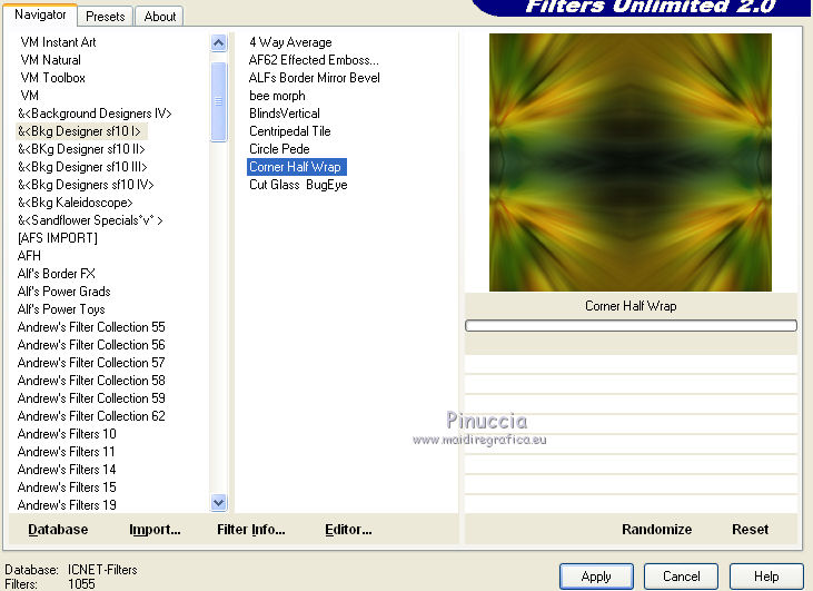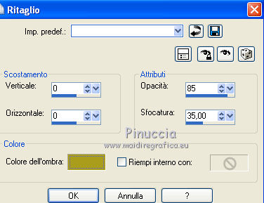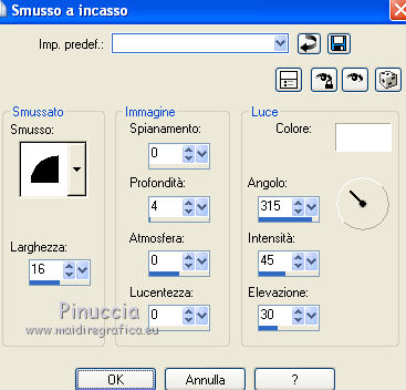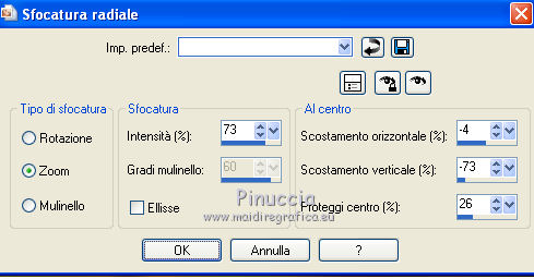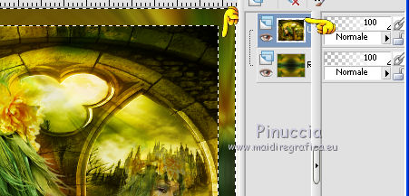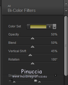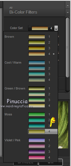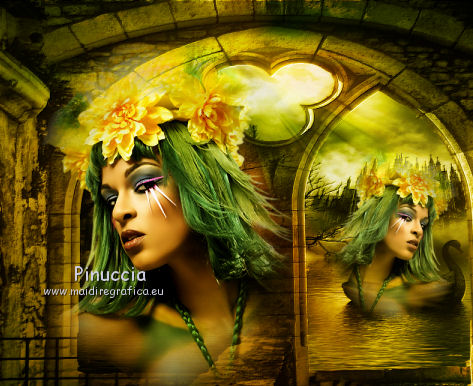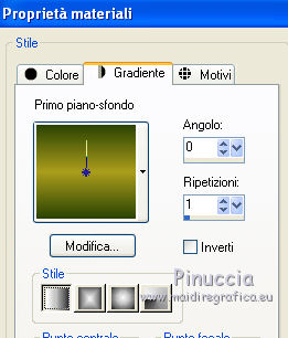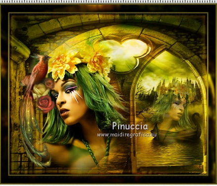 qui puoi trovare qualche risposta ai tuoi dubbi. Se l'argomento che ti interessa non è presente, ti prego di segnalarmelo. Questo tutorial è stato creato con PSP 9, ma può essere eseguito anche con le altre versioni di PSP. Per tradurlo, ho usato PSP X. Questo tutorial è una creazione di ©Christa e non può essere copiato su altri siti nè essere offerto per il download. Lo stesso vale per la mia traduzione. Il materiale viene da vari gruppi di condivisione. Il copyright appartiene ai rispettivi autori. Grazie ai creatori dei tubes che mettono a disposizione il loro lavoro in vari gruppi di condivisione. Rispetta il lavoro degli autori, non cambiare il nome del file e non cancellare il watermark. Occorrente: Materiale qui Per lo sfondo grazie Ashen Sorrow Per i tubes grazie Chaosgaby Christa richiede che sull'immagine sia aggiunto il testo: "© All copyrights belongs to the original artists. I'm just the designer" Filtri: in caso di dubbi, ricorda di consultare la mia sezione filtri qui Xero - Improver qui FM Tile Tools - Blend Emboss qui Filters Unlimited qui Bkg Designersf10I (da importare in Unlimited) qui Nik Software - Color Efex Pro - qui Prima di iniziare anticipo una cosa importante per il tutorial. Le mie descrizioni si riferiscono sempre al modo in cui creo la mia immagine. Per altri tubes e colori, potrebbe essere necessario modificare le mie impostazioni. Gli elementi possono essere colorizzati. Questo non lo scriverò più nel tutorial. ![]() 1. Apri una nuova immagine trasparente 800 x 650 pixels. Imposta il colore di primo piano con il colore scuro #2b4303, e il colore di sfondo con il colore chiaro #aa9d1d. Passa il colore di primo piano a Gradiente. ![]() Riempi l'immagine trasparente con il gradiente.Regola>Sfocatura>Sfocatura gaussiana - raggio 10. ![]() Livelli>Nuovo livello raster. Selezione>Seleziona tutto. Apri il tube chg.13.23072011.psd e vai a Modifica>Copia. minimizza il tube perchè ti servirà ancora Torna al tuo lavoro e vai a Modifica>Incolla nella selezione. Selezione>Deseleziona. Regola>Sfocatura>Sfocatura radiale. ![]() 2. Effetti>Plugins>Nik Software - Color Efex Pro - Bi-Color Filters. a destra scegli un Color Set in armonia con i tuoi colori; per il mio esempio Moss 4. ![]() ![]() Cambia la modalità di miscelatura di questo livello in Luce netta. Effetti>Plugins>FM Tile Tools - Blend Emboss, con i settaggi standard. ![]() Livelli>Nuovo livello raster. Selezione>Seleziona tutto. Apri l'immagine premade_background_1120_by_ashensorrow.jpg e vai a Modifica>Copia. Torna al tuo lavoro e vai a Modifica>Incolla nella selezione. Selezione>Deseleziona. Cambia la modalità di miscelatura di questo livello in Luce netta. Effetti>Plugins>Nik Software - Color Efex Pro, con i settaggi precedenti. Effetti>Plugins>FM Tile Tools - Blend Emboss, con i settaggi standard. 3. Attiva nuovamente il tube del viso chg.13.23072011 e vai a Modifica>copia. Torna al tuo lavoro e vai a Modifica>Incolla come nuovo livello. Immagine>Ridimensiona, al 60%, tutti i livelli non selezionato. Spostalo a sinistra.Livelli>Duplica. Cambia la modalità di miscelatura di questo livello in Luce diffusa. Attiva il livello sottostante dell'originale. Effetti>Plugins>Nik Software - Color Efex Pro, con i settaggi precedenti. Effetti>Plugins>Xero - Improver. ![]() Livelli>Duplica. Immagine>Rifletti. Immagine>Ridimensiona, al 50%, tutti i livelli non selezionato. Spostalo a destra.![]() Abbassa l'opacità di questo livello al 60%. Livelli>Unisci>Unisci visibile. 4. Immagine>Dimensioni tela. ![]() Livelli>Nuovo livello raster. Livelli>Disponi>Sposta giù. Selezione>Seleziona tutto. Apri "Background_cg.psd" e vai a Modifica>Copia. minimizzalo perchè ti servirà ancora Torna al tuo lavoro e vai a Modifica>Incolla nella selezione. Effetti>Plugins>Filters Unlimited 2.0 - BKG Designersf10I - Corner Half Wrap. ![]() Attiva il livello Uniti. Attiva lo strumento Bacchetta magica ![]() clicca sullo spazio trasparente per selezionarlo. non vedrai lo spazio trasparente perchè è coperto dal livello sottostante. ![]() Selezione>Inverti. Modifica>Copia. Selezione>Inverti. Livelli>Nuovo livello raster. Modifica>Incolla nella selezione. Cambia la modalità di miscelatura di questo livello in Luce netta. Effetti>Effetti 3D>Smusso a incasso. ![]() Selezione>inverti. Effetti>Effetti 3D>Ritaglio,con il colore di sfondo. ![]() Selezione>Deseleziona. Regola>Sfocatura>Sfocatura gaussiana - raggio 5. ![]() 5. Apri "rand1_cg.psd" e vai a Modifica>Copia. Torna al tuo lavoro e vai a Modifica>Incolla come nuovo livello. Se necessario, colorizza con i valori corrispondenti al tuo colore chiaro. Apri "rand_cg.psd" e vai a Modifica>Copia. Torna al tuo lavoro e vai a Modifica>Incolla come nuovo livello. Se necessario, colorizza con i valori corrispondenti al tuo colore chiaro. Apri il tube dell'uccello e vai a Modifica>Copia. Torna al tuo lavoro e vai a Modifica>Incolla come nuovo livello. Immagine>Ridimensiona, al 65%, tutti i livelli non selezionato. Immagine>Rifletti. Spostalo a sinistra, davanti al viso della donna.![]() Livelli>Duplica e cambia la modalità di miscelatura di questo livello in Luce diffusa. Attiva il livello sottostante dell'originale. Effetti>Plugins>Nik Software - Color Efex Pro, con i settaggi precedenti. Effetti>Plugins>Xero - Improver, con i settaggi precedenti. Attiva il livello superiore. Attiva nuovamente background_cg.psd e vai a Modifica>Copia. Torna al tuo lavoro e vai a Modifica>Incolla come nuovo livello. Cambia la modalità di miscelatura di questo livello in Luce diffusa. 6. Apri il file di testo e vai a Modifica>Copia. Torna al tuo lavoro e vai a Modifica>Incolla come nuovo livello. Spostalo dove preferisci.Aggiungi il tuo nome e/o il tuo watermark su un nuovo livello, senza dimenticare i copyright delle immagini usate. 7. Livelli>Unisci>Unisci tutto, e salva in formato jpg. ![]() Se hai problemi o dubbi, o trovi un link non funzionante, o anche soltanto per dirmi che ti è piaciuto, 6 No