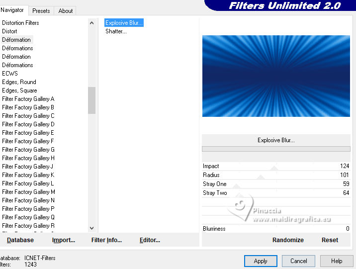 Effects>Plugins>Filters Unilimted 2.0 - Déformation - Explosive Blur, default settings.