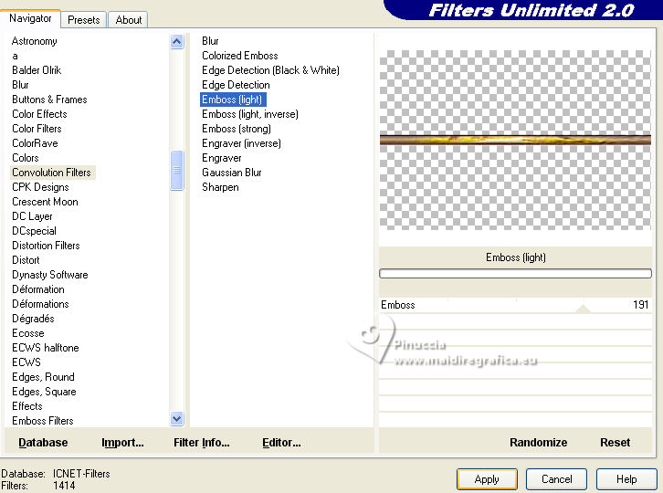 7. Effects>Plugins>Filters Unlimited 2.0 - Convolutions Filters - Emboss (Light), default settings