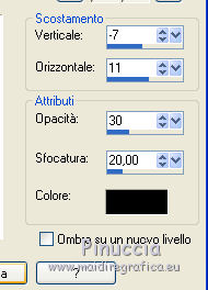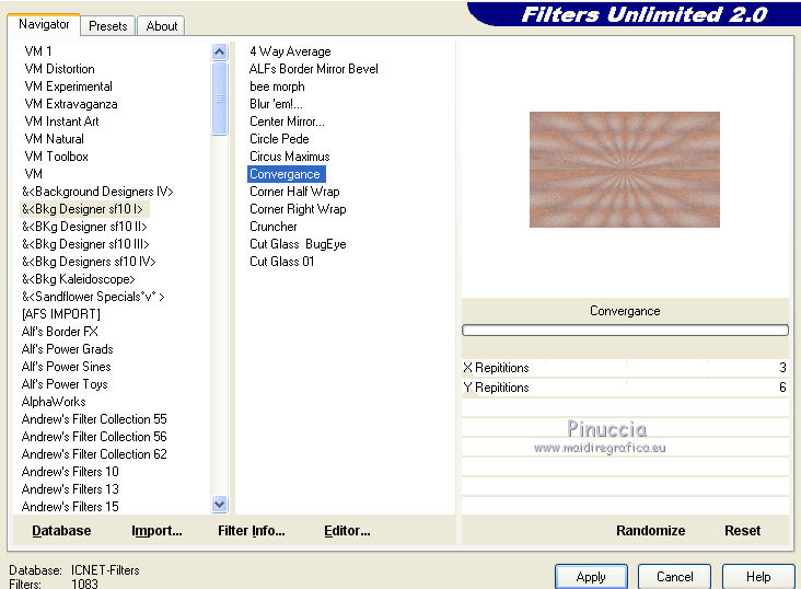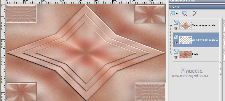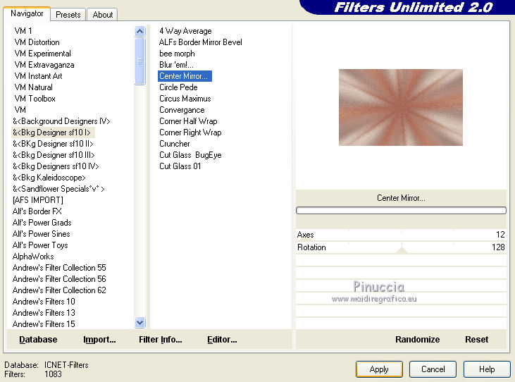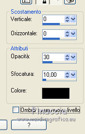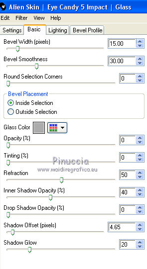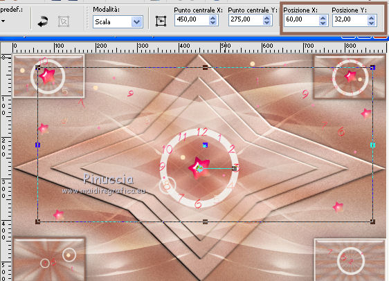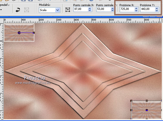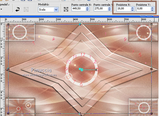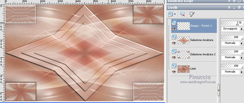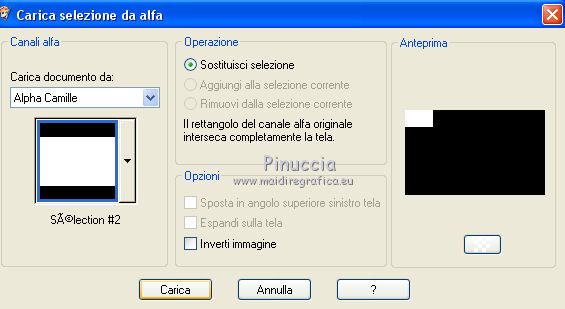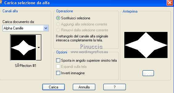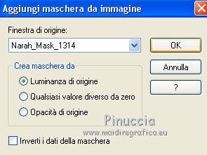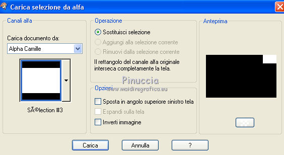 qui puoi trovare qualche risposta ai tuoi dubbi. Se l'argomento che ti interessa non è presente, ti prego di segnalarmelo. Questo tutorial è stato tradotto con Corel X, ma può essere realizzato anche con le altre versioni di PSP. Dalla versione X4, il comando Immagine>Rifletti è stato sostituito con Immagine>Capovolgi in orizzontale, e il comando Immagine>Capovolgi con Immagine>Capovolgi in verticale. Nelle versioni X5 e X6, le funzioni sono state migliorate rendendo disponibile il menu Oggetti. Con la nuova versione X7, sono tornati Rifletti>Capovolgi, ma con nuove varianti. Vedi la scheda sull'argomento qui Le vostre versioni Occorrente: Materiale qui Grazie per la maschera Narah. Il resto del materiale è di Colybrix (in questa pagina trovi i links ai siti dei creatori di tubes) Filtri: se hai problemi con i filtri, consulta la mia sezione filtri qui Plugin Galaxy - Instant Mirror qui Simple - Blintz qui Simple - Top Bottom Wrap (bonus) qui Filters Unlimited 2.0 qui &<Bkg Designer sf10I> - Convergance, Center Mirror (da importare in Unlimited) qui Alien Skin Eye Candy 5 Impact - Glass qui I filtri Simple si possono usare da soli o importati in Filters Unlimited (come fare vedi qui) Se un filtro fornito appare con questa icona ![]() non esitare a cambiare modalità di miscelatura e opacità secondo i colori utilizzati. Apri la maschera in PSP e minimizzala con il resto del materiale. 1. Imposta il colore di primo piano con il colore chiaro #f0e9e0, e il colore di sfondo con il colore scuro #926757. ![]() Apri Alpha Camille. Finestra>Duplica, o sulla tastiera maiuscola+D per fare una copia. ![]() Chiudi l'originale. La copia, che sarà la base del tuo lavoro, non è vuota, ma contiene le selezioni salvate sul canale alfa. 2. Riempi l'immagine trasparente con il colore scuro.3. Livelli>Nuovo livello raster. Selezione>Seleziona tutto. Apri il tube della bambina, cancella la firma, e vai a Modifica>Copia. Minimizza il tube. Torna al tuo lavoro e vai a Modifica>Incolla nella selezione. Selezione>Deseleziona. 4. Effetti>Effetti di immagine>Motivo unico, con i settaggi standard. ![]() 5. Regola>Sfocatura>Sfocatura gaussiana - raggio 30. ![]() 6. Livelli>Duplica. Immagine>Rifletti. Cambia la modalità di miscelatura di questo livello in Sovrapponi, o abbassa l'opacità al 65% (adatta ai tuoi colori). 7. Livelli>Unisci>Unisci visibile. 8. Regola>Aggiungi/Rimuovi disturbo>Aggiungi disturbo. ![]() 9. Effetti>Plugins>Simple - Top Bottom Wrap. Effetti>Plugins>Simple - Blintz. 10. Effetti>Plugins>Plugin Galaxy - Instant Mirror. ![]() 11. Selezione>Carica/Salva selezione>Carica selezione da canale alfa. La selezione Sélection#1 è subito disponibile. Devi soltanto cliccare Carica. ![]() Selezione>Innalza selezione a livello. 12. Effetti>Effetti 3D>Smusso a incasso. ![]() Selezione>Deseleziona. 13. Effetti>Effetti 3D>Sfalsa ombra. ![]() 14. Livelli>Duplica. Immagine>Ridimensiona, all'80%, tutti i livelli non selezionato. 15. Ancora Livelli>Duplica. Immagine>Ridimensiona, all'80%, tutti i livelli non selezionato. 16. Livelli>Unisci>Unisci giù - 2 volte. 17. Attiva il livello di sfondo. Selezione>Carica/Salva selezione>Carica selezione da canale alfa. Apri il menu delle selezioni e carica Sélection#2 ![]() Selezione>Innalza selezione a livello. 18. Effetti>Plugins>Filters Unlimited 2.0 - &<Bkg Designer sf10I> - Convergance, con i settaggi standard. ![]() 19. Effetti>Plugins>Alien Skin Eye Candy 5 Impact - Glass. ![]() 20. Selezione>Modifica>Seleziona bordature selezione. ![]() Riempi con il colore chiaro.Selezione>Deseleziona. 21. Livelli>Duplica. Tasto K per attivare lo strumento Puntatore ![]() e imposta Posizione X: 725,00 e Posizione Y: 443,00. ![]() 22. Livelli>Unisci>Unisci giù. 23. Attiva nuovamente il livello di sfondo. Selezione>Carica/Salva selezione>Carica selezione da canale alfa. Apri il menu delle selezioni e carica Sélection#3 ![]() Selezione>Innalza selezione a livello. 24. Effetti>Plugins>Filters Unlimited 2.0 - &<Bkg Designer sf10I> - Center Mirror. ![]() 25. Effetti>Plugins>Alien Skin Eye Candy 5 Impact - Glass, con i settaggi precedenti. 26. Selezione>Modifica>Seleziona bordature selezione, con i settaggi precedenti. ![]() Riempi con il colore scuro.Selezione>Deseleziona. 27. Livelli>Duplica. Tasto K per attivare lo strumento Puntatore ![]() e imposta Posizione X: -1,00 e Posizione Y: 440,00. ![]() 28. Livelli>Unisci>Unisci giù. Attiva il livello soprastante dei due rettangoli. Livelli>Unisci>Unisci giù. Adesso i 4 rettangoli sono su un unico livello. ![]() 29. Effetti>Effetti 3D>Sfalsa ombra, con i settaggi precedenti. 30. Attiva il livello superiore. Livelli>Nuovo livello raster. Riempi con il colore chiaro.Livelli>Nuovo livello maschera>Da immagine Apri il menu sotto la finestra di origine e vedrai la lista dei files aperti. Seleziona la maschera Narah_mask_1314 ![]() Effetti>Effetti di bordo>Aumenta. Livelli>Unisci>Unisci gruppo. 31. Livelli>Duplica. Immagine>Rifletti. Livelli>Unisci>Unisci giù. Cambia la modalità di miscelatura di questo livello in Sovrapponi, e abbassa l'opacità al 75%. ![]() 32. Apri il tube déco 1 e vai a Modifica>Copia. Torna al tuo lavoro e vai a Modifica>Incolla come nuovo livello. Tasto K per attivare lo strumento Puntatore ![]() e imposta Posizione X: 18,00 e Posizione Y: 8,00. ![]() 33. Ouvrir le tube déco 2 e vai a Modifica>Copia. Torna al tuo lavoro e vai a Modifica>Incolla come nuovo livello. Tasto K per attivare lo strumento Puntatore ![]() e imposta Posizione X: 60,00 e Posizione Y: 32,00. ![]() 34. Effetti>Effetti 3D>Sfalsa ombra. ![]() 35. Attiva il livello di sfondo. Modifica>Copia. 36. Immagine>Aggiungi bordatura, 2 pixels, simmetriche, colore scuro. Immagine>Aggiungi bordatura, 5 pixels, simmetriche, colore chiaro. Immagine>Aggiungi bordatura, 2 pixels, simmetriche, colore scuro. Attiva lo strumento Bacchetta magica ![]() e clicca nel bordo di 5 pixels per selezionarlo. Regola>Aggiungi/Rimuovi disturbo>Aggiungi disturbo, con i 