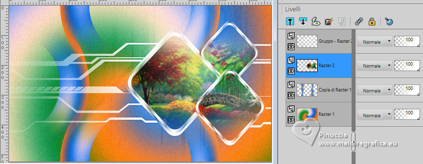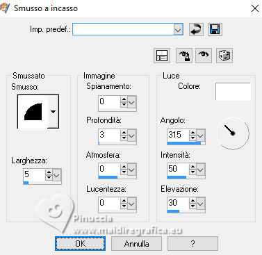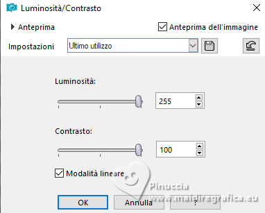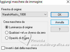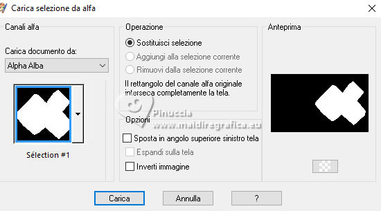 qui puoi trovare qualche risposta ai tuoi dubbi. Se l'argomento che ti interessa non è presente, ti prego di segnalarmelo. Questo tutorial è stato tradotto con PSPX7, ma può essere realizzato con le versioni più antiche. Dalla versione X4, il comando Immagine>Rifletti è stato sostituito con Immagine>Capovolgi in orizzontale, e il comando Immagine>Capovolgi con Immagine>Capovolgi in verticale. Nelle versioni X5 e X6, le funzioni sono state migliorate rendendo disponibile il menu Oggetti. Con la nuova versione X7, sono tornati Rifletti>Capovolgi, ma con nuove varianti. Vedi la scheda sull'argomento qui Traduzione inglese qui Le vostre versioni quiOccorrente: ![]() Per i tubes grazie Kamil. (in questa pagina trovi i links ai siti dei creatori di tubes) Filtri: in caso di dubbi, ricorda di consultare la mia sezione filtri qui Mehdi - Wavy Lab 1.1. qui Mura's Meister - Pole Transform qui AAA Filters - Multifilter qui ![]() non esitare a cambiare modalità di miscelatura e opacità secondo i colori utilizzati. ![]() Apri le maschere in PSP e minimizzale con il resto del materiale. 1. Colori ![]() Imposta il colore di primo piano con il colore 1 #1669ce e il colore di sfondo con il colore 2 #128d3b. ![]() Apri Alpha Alba Finestra>Duplica o sulla tastiera maiuscola+D per fare una copia. ![]() Chiudi l'originale. La copia, che sarà la base del tuo lavoro, non é vuota, ma contiene una selezione salvata sul canale alfa. Effetti>Plugins>Mehdi - Wavy Lab 1.1. questo filtro lavora con i colori della paletta: il primo é il colore di sfondo, il secondo quello di primo piano; cambia gli ultimi due colori creati dal filtro. il terzo con il colore 3 #fc790a e il quarto con il colore 4 #fcd8c8. ![]() 2. Regola>Aggiungi/Rimuovi disturbo>Aggiungi disturbo. ![]() 3. Livelli>Duplica. Effetti>Plugins>Mura's Meister - Pole Transform. ![]() 4. Livelli>Duplica. Immagine>Rifletti. Immagine>Capovolgi. Livelli>Unisci>Unisci giù. Effetti>Effetti di immagine>Motivo unico, con i settaggi standard. ![]() 5. Imposta il colore di primo piano con il colore bianco. Livelli>Nuovo livello raster. Riempi il livello con il colore bianco.Livelli>Nuovo livello maschera>Da immagine. Apri il menu sotto la finestra di origine e vedrai la lista dei files aperti. Seleziona la maschera NarahsMasks_1808 ![]() Effetti>Effetti di bordo>Aumenta. Livelli>Unisci>Unisci gruppo. 6. Livelli>Duplica. Livelli>Unisci>Unisci giù. 7. Selezione>Carica/Salva selezione>Carica selezione da canale alfa. La selezione sélection 1 è subito disponibile. Devi soltanto cliccare Carica. ![]() Apri il tube del paesaggio KamilTubes-454 ![]() Cancella il watermark e vai a Modifica>Copia. Torna al tuo lavoro e vai a Modifica>Incolla come nuovo livello. Immagine>Ridimensiona, se necessario, per il tube fornito io ho ridimensionato al 60%, tutti i livelli non selezionato. Posiziona il tube sulla selezione.Selezione>Inverti. Premi sulla tastiera il tasto CANC ![]() Selezione>Deseleziona. 8. Livelli>Disponi>Sposta giù. ![]() 9. Attiva nuovamente il livello superiore. Effetti>Effetti 3D>Sfalsa ombra, colore nero. ![]() Cambia la modalità di miscelatura di questo livello in Luminanza (esistente). 10. Livelli>Nuovo livello raster. Riempi il livello con il colore bianco.Livelli>Nuovo livello maschera>Da immagine. Apri il menu sotto la finestra di origine e seleziona la maschera NarahsMasks_1810 ![]() Effetti>Effetti di bordo>Aumenta. Livelli>Unisci>Unisci gruppo. 11. Immagine>Rifletti. Immagine>Capovolgi. Tasto K per attivare lo strumento Puntatore ![]() e tira il nodo inferiore verso l'alto fino a 250 pixels. ![]() Cambia la modalità di miscelatura di questo livello in Luminanza (esistente). 12. Livelli>Duplica. Immagine>Rifletti. Immagine>Capovolgi. 13. Attiva il livello di sfondo, Raster 1. Effetti>Plugins>AAA Filters - AAA Multi-Filter ![]() 14. Effetti>Effetti di immagine>Motivo unico, con i settaggi precedenti, ancora in memoria). Facoltativo: se preferisci il risultato del punto precedente, puoi saltare questo effetto. 15. Effetti>Effetti 3D>Smusso a incasso. ![]() 16. Immagine>Aggiungi bordatura, 1 pixel, simmetriche, colore 1 #1669ce. Immagine>Aggiungi bordatura, 3 pixels, simmetriche, colore 3 #fc790a. Immagine>Aggiungi bordatura, 3 pixels, simmetriche, colore 2 #128d3b. Immagine>Aggiungi bordatura, 3 pixels, simmetriche, colore 1 #1669ce. 17. Selezione>Seleziona tutto. Immagine>Aggiungi bordatura, 20 pixels, simmetriche, colore bianco. Effetti>Effetti 3D>Sfalsa ombra, colore 1 #1669ce. ![]() Selezione>Deseleziona. 18. Immagine>Aggiungi bordatura, 1 pixel, simmetriche, colore 1 #1669ce. Immagine>Aggiungi bordatura, 5 pixels, simmetriche, colore bianco. 19. Apri il tube principale KamilTube-1065 ![]() Cancella il watermark e vai a Modifica>Copia. Torna al tuo lavoro e vai a Modifica>Incolla come nuovo livello. Immagine>Ridimensiona, se necessario, per il tube fornito ho ridimensionato al 77%. Sposta il tube a sinistra.Effetti>Effetti 3D>Sfalsa ombra, a scelta. 20. Apri QB_WordArt_Dreams ![]() Modifica>Copia. Torna al tuo lavoro e vai a Modifica>Incolla come nuovo livello. Livelli>Duplica. Livelli>Unisci>Unisci giù. Regola>Luminosità e contrasto>Luminosità e contrasto ![]() Cambia la modalità di miscelatura di questo livello in Luminanza (esistente). Effetti>Effetti 3D>Sfalsa ombra, colore 1 #1669ce. ![]() Modifica>Ripeti Sfalsa ombra. Sposta il testo in alto a destra, o dove preferisci.21. Firma il tuo lavoro. Immagine>Aggiungi bordatura, 1 pixel, simmetriche, colore 1 #1669ce. Immagine>Aggiungi bordatura, 1 pixel, simmetriche, colore 3 #fc790a. Salva in formato jpg. Per i tubes di questo esempio grazie Adrienne ![]() ![]() ![]() Puoi scrivermi se hai problemi o dubbi, o trovi un link che non funziona, o soltanto per un saluto. |