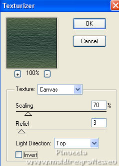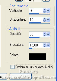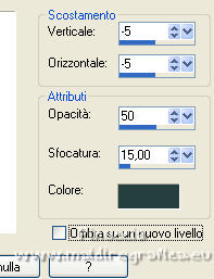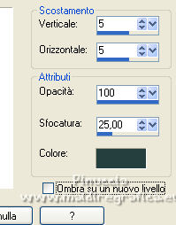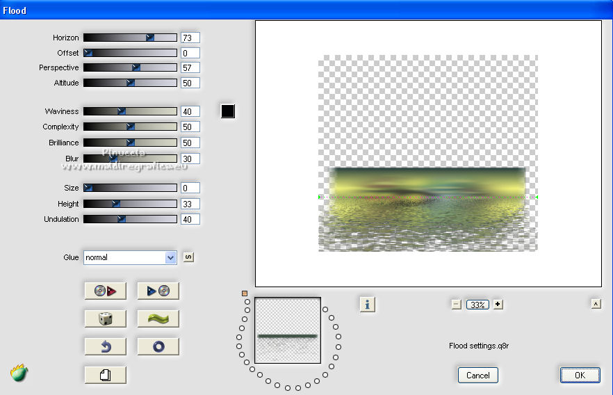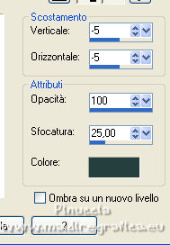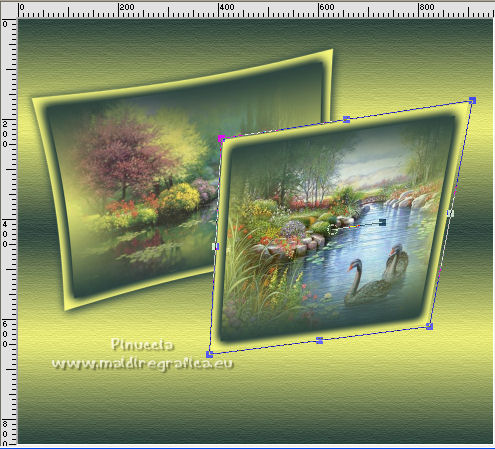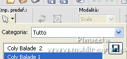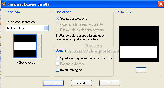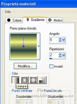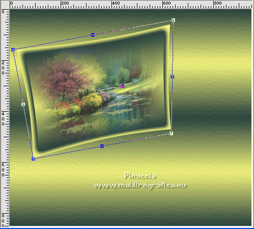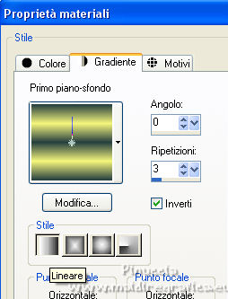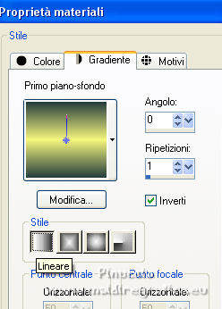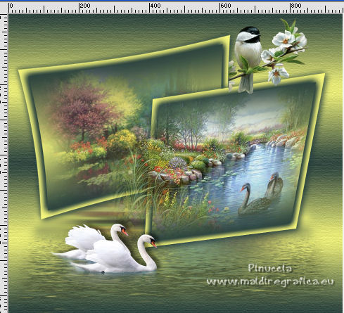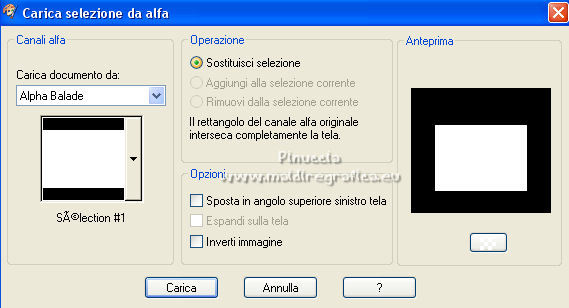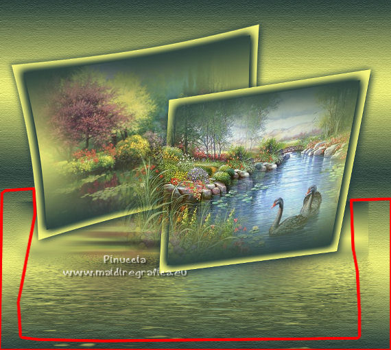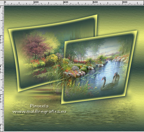 qui puoi trovare qualche risposta ai tuoi dubbi. Se l'argomento che ti interessa non è presente, ti prego di segnalarmelo. Questo tutorial è stato tradotto con PSPX, ma può essere realizzato anche con le altre versioni di PSP. Dalla versione X4, il comando Immagine>Rifletti è stato sostituito con Immagine>Capovolgi in orizzontale, e il comando Immagine>Capovolgi con Immagine>Capovolgi in verticale. Nelle versioni X5 e X6, le funzioni sono state migliorate rendendo disponibile il menu Oggetti. Con la nuova versione X7, sono tornati Rifletti>Capovolgi, ma con nuove varianti. Vedi la scheda sull'argomento qui Occorrente: Materiale qui Per il tube e la maschera grazie Mentali e Silvie (in questa pagina trovi i links ai siti dei creatori di tubes) Filtri: se hai problemi con i filtri, consulta la mia sezione filtri qui Texture - Texturizer qui Flaming Pear - Flood qui ![]() non esitare a cambiare modalità di miscelatura e opacità secondo i colori utilizzati. Nelle ultime versioni di PSP non c'è il gradiente di primo piano/sfondo (Corel_06_029) Puoi usare i gradienti delle versioni precedenti. Trovi qui i gradienti Corel X. ![]() Metti i preset nella cartella Impostazioni predefinite. Imposta il colore di primo piano con #f5f67c, e il colore di sfondo con #263e3e. ![]() Passa il colore di primo piano a Gradiente di primo piano/sfondo, stile Lineare. ![]() 1. Apri Alpha Balade. Finestra>Duplica o sulla tastiera maiuscola+D per fare una copia. ![]() Chiudi l'originale. La copia, che sarà la base del tuo lavoro, non è vuota, ma contiene le selezioni salvate sul canale alfa. Riempi l'immagine trasparente con il gradiente.Regola>Sfocatura>Sfocatura gaussiana - raggio 20. ![]() 2. Effetti>Plugins>Texture - Texturizer se usi la versione francese di questo filtro, Texture>Placage de Texture, il risultato non cambia. ![]() 3. Livelli>Nuovo livello raster. Selezione>Carica/Salva selezione>Carica selezione da canale alfa. La selezione #1 è subito disponibile. Devi soltanto cliccare Carica. ![]() Passa il colore di primo piano a Colore. Riempi la selezione con il colore chiaro di primo piano.Selezione>Modifica>Contrai - 20 pixels. Livelli>Nuovo livello raster. Passa nuovamente il colore di primo piano a Gradiente e cambia i settaggi ![]() Riempi la selezione con il gradiente.Regola>Sfocatura>Sfocatura gaussiana - raggio 20. ![]() 4. Apri il misted paysage 136, cancella il watermark e vai a Modifica>Copia. Minimizzalo perchè ti servirà ancora. Torna al tuo lavoro e vai a Modifica>Incolla come nuovo livello. Immagine>Ridimensiona, all'80%, tutti i livelli non selezionato. Posiziona il tube sulla selezione.5. Selezione>Inverti. Premi sulla tastiera il tasto CANC ![]() Livelli>Unisci>Unisci giù. 6. Di nuovo Selezione>Inverti. Effetti>Effetti 3D>Sfalsa ombra, colore di sfondo. ![]() Modifica>Ripeti Sfalsa ombra. Ripeti ancora l'Effetto Sfalsa ombra, verticale e orizzontale -5. ![]() 7. Selezione>Deseleziona. Livelli>Unisci>Unisci giù. Immagine>Ridimensiona, al 110%, tutti i livelli non selezionato. Effetti>Effetti di distorsione>Distorsione lente. ![]() 8. Tasto K per attivare lo strumento Puntatore ![]() apri il menu delle impostazioni e seleziona il preset Balade 1 ![]() Dovresti avere questo ![]() 9. Effetti>Effetti 3D>Sfalsa ombra, colore scuro. ![]() Ripeti Effetti>Effetti 3D>Sfalsa ombra, colore scuro. ![]() 10. Livelli>Nuovo livello raster. Selezione>Carica/Salva selezione>Carica selezione da canale alfa. Apri il menu delle selezioni e carica la selezione #2. ![]() Passa il colore di primo piano a Colore. Riempi la selezione con il colore giallo di primo piano.Selezione>Modifica>Contrai - 20 pixels. 11. Livelli>Nuovo livello raster. Riporta il colore di primo piano Gradiente, con i settaggi precedenti. ![]() Riempi il livello con il gradiente.Regola>Sfocatura>Sfocatura gaussiana - raggio 20. Apri il tube payage143, cancella la firma e vai a Modifica>Copia. Torna al tuo lavoro e vai a Modifica>Incolla come nuovo livello. Immagine il tube sulla selezione.Premi sulla tastiera il tasto CANC. Livelli>Unisci>Unisci giù. 12. Selezione>Inverti. Effetti>Effetti 3D>Sfalsa ombra, colore di sfondo. ![]() Modifica>Ripeti Sfalsa ombra. Effetti>Effetti 3D>Sfalsa ombra, verticale e orizzontale -5. ![]() Modifica>Ripeti Sfalsa ombra. Selezione>Deseleziona. Livelli>Unisci>Unisci giù. 13. Tasto K per attivare lo strumento Puntatore ![]() apri il menu delle impostazioni e seleziona il preset Balade 2 ![]() Dovresti avere questo ![]() Effetti>Effetti 3D>Sfalsa ombra, colore scuro. ![]() Ripeti Effetti>Effetti 3D>Sfalsa ombra, colore scuro. ![]() 14. Apri il tube morceau de paysage, cancella la firma e vai a Modifica>Copia. Torna al tuo lavoro e vai a Modifica>Incolla come nuovo livello. Tasto K per attivare lo strumento Puntatore ![]() e imposta Posizione x: 230,00 e Posizione Y: 198,00. ![]() 15. Livelli>Nuovo livello raster. Selezione>Carica/Salva selezione>Carica selezione da canale alfa. Apri il menu delle selezioni e carica la selezione #3. ![]() Cambia nuovamente i settaggi del gradiente. ![]() Riempi la selezione con il gradiente.16. Attiva nuovamente il tube paysage 136. Immagine>Capovolgi. Modifica>Copia. Torna al tuo lavoro e vai a Modifica>Incolla nella selezione. Regola>Sfocatura>Sfocatura da movimento. ![]() Ripeti Sfocatura da movimento, angolo 90. ![]() Selezione>Deseleziona. 17. Livelli>Disponi>Sposta giù - 3 volte. ![]() Effetti>Plugins>Flaming Pear - Flood. ![]() 18. Attiva lo strumento Gomma con i seguenti settaggi:![]() Cancella leggermente i bordi dell'effetto (la parte circondata in rosso) ![]() Risultato ![]() 19. Attiva il livello superiore. Apri il tube cygnes, cancella la firma e vai a Modifica>Copia. Torna al tuo lavoro e vai a Modifica>Incolla come nuovo livello. Immagine>Ridimensiona, al 60%, tutti i livelli non selezionato. Sposta il tube in basso a sinistra.Effetti>Effetti 3D>Sfalsa ombra, colore nero. ![]() 20. Apri il tube oiseau 37, cancella la firma e vai a Modifica>Copia.