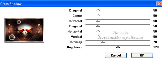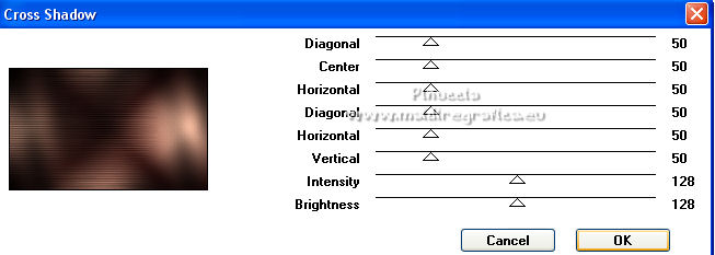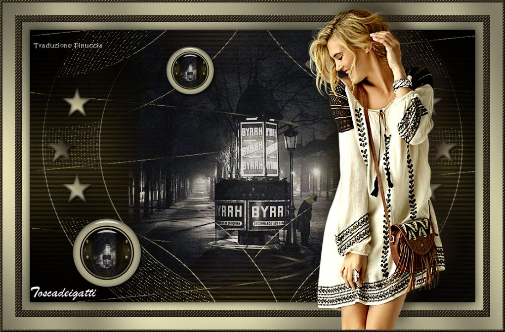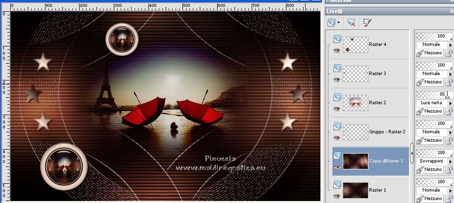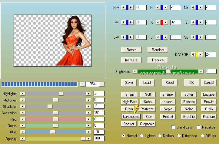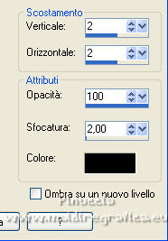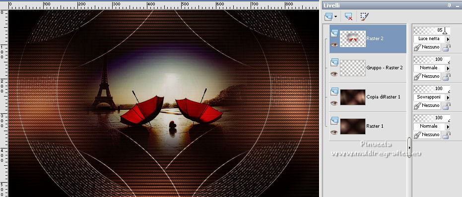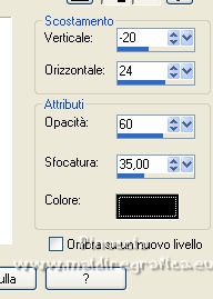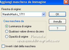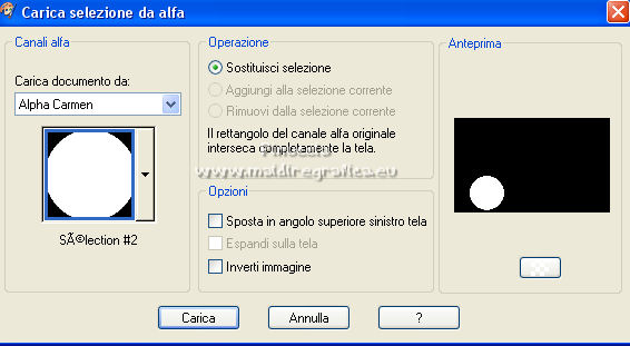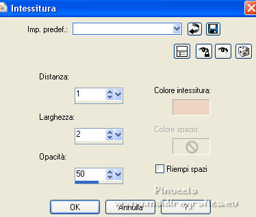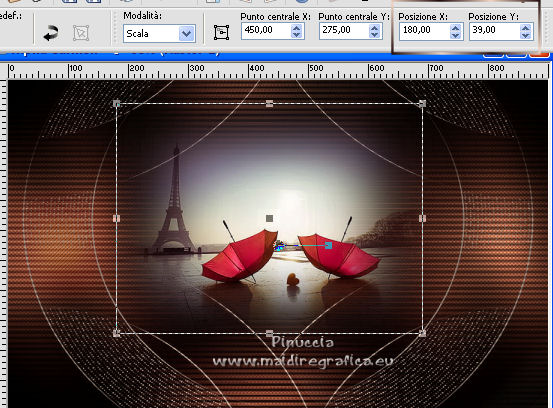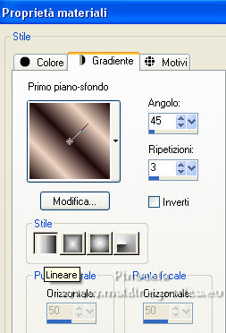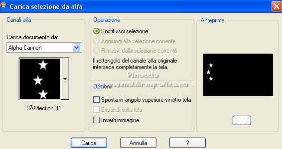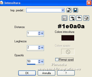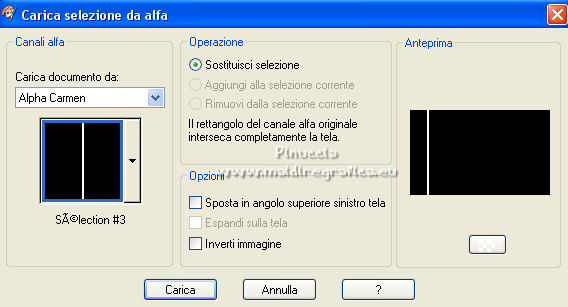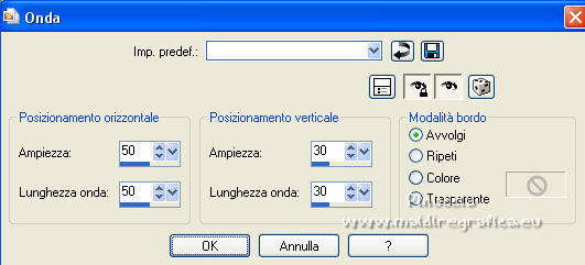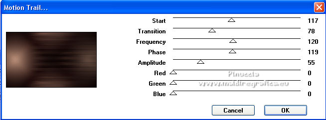 qui puoi trovare qualche risposta ai tuoi dubbi. Se l'argomento che ti interessa non è presente, ti prego di segnalarmelo. Questo tutorial è stato tradotto con PSPX, ma può essere realizzato anche con le altre versioni di PSP. Dalla versione X4, il comando Immagine>Rifletti è stato sostituito con Immagine>Capovolgi in orizzontale, e il comando Immagine>Capovolgi con Immagine>Capovolgi in verticale. Nelle versioni X5 e X6, le funzioni sono state migliorate rendendo disponibile il menu Oggetti. Con la nuova versione X7, sono tornati Rifletti>Capovolgi, ma con nuove varianti. Vedi la scheda sull'argomento qui Occorrente: Materiale qui Per il tube e la maschera grazie Beatriz e Narah. Il resto del materiale è di Colybrix (in questa pagina trovi i links ai siti dei creatori di tubes) Filtri: se hai problemi con i filtri, consulta la mia sezione filtri qui Filters Unlimited 2.0 qui Filter Factory Gallery M - Motion Trail qui Graphics Plus - Cross Shadow qui Alien Skin Eye Candy 5 Impact - Glass qui AAA Filters - Custom qui I filtri Factory Gallery e Graphics Plus si possono usare da soli o importati in Filters Unlimited (come fare vedi qui) Se un filtro fornito appare con questa icona ![]() non esitare a cambiare modalità di miscelatura e opacità secondo i colori utilizzati. Nelle ultime versioni di PSP non c'è il gradiente di primo piano/sfondo (Corel_06_029) Puoi usare i gradienti delle versioni precedenti. Trovi qui i gradienti Corel X. ![]() Apri la maschera in PSP e minimizzala con il resto del materiale. Imposta il colore di primo piano con #1e0a0a, e il colore di sfondo con #efd4c3. ![]() Passa il colore di primo piano a Gradiente di primo piano/sfondo, stile Lineare. ![]() 1. Apri Alpha Carmen. Finestra>Duplica o sulla tastiera maiuscola+D per fare una copia. ![]() Chiudi l'originale. La copia, che sarà la base del tuo lavoro, non è vuota, ma contiene le selezioni salvate sul canale alfa. Riempi l'immagine trasparente con il gradiente.Regola>Sfocatura>Sfocatura gaussiana - raggio 20. ![]() 2. Livelli>Duplica. Immagine>Rifletti. Cambia la modalità di miscelatura di questo livello in Moltiplica. Livelli>Unisci>Unisci giù. 3. Effetti>Effetti di trama>Intessitura, colore #1e0a0a. ![]() 4. Effetti>Plugins>Filters Unlimited 2.0 - Filter Factory Gallery M - Motion Trail, con i settaggi standard. ![]() Livelli>Duplica. Immagine>Rifletti. Effetti>Plugins>Graphics Plus - Cross Shadow, con i settaggi standard. ![]() Cambia la modalità di miscelatura di questo livello in Sovrapponi. 5. Livelli>Nuovo livello raster. Riempi con il colore chiaro di sfondo.Livelli>Nuovo livello maschera>Da immagine. Apri il menu sotto la finestra di origine e vedrai la lista dei files aperti. Seleziona la maschera NarahsMasks_1711. ![]() Effetti>Effetti di bordo>Aumenta. Livelli>Unisci>Unisci gruppo. 6. Effetti>Plugins>Filters Unlimited 2.0 - Filter Factory Gallery M > Motion Trail, con i settaggi standard. Immagine>Rifletti. Ripeti il filtro Factory Gallery M - Motion Trail, con i settaggi standard. 7. Apri il tube mist 1868-paisage de LB Tubes e vai a Modifica>Copia. Torna al tuo lavoro e vai a Modifica>Incolla come nuovo livello. Immagine>Ridimensiona, al 75%, tutti i livelli non selezionato. Immagine>Rifletti. Sposta il tube un po' più in alto.Per il mio tube: Tasto K per attivare lo strumento Puntatore ![]() e imposta Posizione X: 180,00 e Posizione Y: 39,00. ![]() Cambia la modalità di miscelatura di questo livello in Luce netta, e abbassa l'opacità all'85% (per la mia seconda versione ho lasciato in modalità Normale e ho abbassato leggermente l'opacità). ![]() 8. Livelli>Nuovo livello raster, Raster 3. Selezione>Carica/Salva selezione>Carica selezione da canale alfa. La selezione #1 è subito disponibile. Devi soltanto cliccare Carica. ![]() Riempi la selezione con il gradiente.Effetti>Effetti 3D>Smusso a incasso. ![]() Selezione>Deseleziona. 9. Livelli>Duplica. Immagine>Rifletti. Livelli>Unisci>Unisci giù. Effetti>Effetti 3D>Sfalsa ombra, colore nero. ![]() Effetti>Plugins>Graphics Plus - Cross Shadow, con i settaggi standard. 10. Modifica>Copia Speciale>Copia Unione. Selezione>Carica/Salva selezione>Carica selezione da canale alfa. Apri il menu delle selezioni e carica la selezione #2. ![]() Livelli>Nuovo livello raster, Raster 4. Riempi la selezione con il colore chiaro.Effetti>Plugins>Alien Skin Eye Candy 5 Impact - Glass - preset Clear. ![]() 11. Selezione>Modifica>Contrai - 20 pixels. Passa il colore di primo piano a Colore. Riempi la selezione con il colore scuro di primo piano.Selezione>Modifica>Contrai - 4 pixels. Riempi la selezione con il colore chiaro.Selezione>Modifica>Contrai - 4 pixels. Modifica>Incolla nella selezione. Effetti>Plugins>Alien Skin Eye Candy 5 Impact - Glass, con i settaggi precedenti. Selezione>Deseleziona. 12. Immagine>Ridimensiona, al 70%, tutti i livelli non selezionato. Tasto K per attivare lo strumento Puntatore ![]() e imposta Posizione X: 80,00 e Posizione Y: 377,00. ![]() 13. Livelli>Duplica. Immagine>Ridimensiona, al 70%, tutti i livelli non selezionato. Imposta Posizione X: 271,00 e Posizione Y: 30,00. ![]() Livelli>Unisci>Unisci giù. Effetti>Effetti 3D>Sfalsa ombra, con i settaggi precedenti. 14. Attiva il livello Copia di Raster 1, il secondo dal basso. ![]() Livelli>Nuovo livello raster, Raster 5. Selezione>Carica/Salva selezione>Carica selezione da canale alfa. Apri il menu delle selezioni e carica la selezione #3. ![]() Riporta il colore di primo piano a Gradiente. Riempi la selezione con il gradiente.Selezione>Deseleziona. Effetti>Effetti di distorsione>Onda. ![]() Cambia la modalità di miscelatura di questo livello in Luce netta. Livelli>Duplica. 15. Immagine>Aggiungi bordatura, 1 pixel, simmetriche, colore di primo piano. Selezione>Seleziona tutto. Immagine>Aggiungi bordatura, 15 pixels, simmetriche, colore di sfondo. Selezione>Inverti. 16. Effetti>Plugins>Graphics Plus - Cross Shadow, intensity a 70. ![]() Selezione>Inverti. Effetti>Effetti 