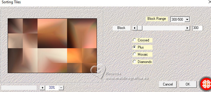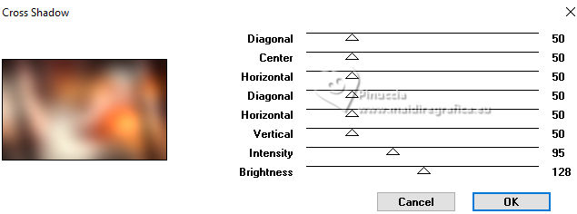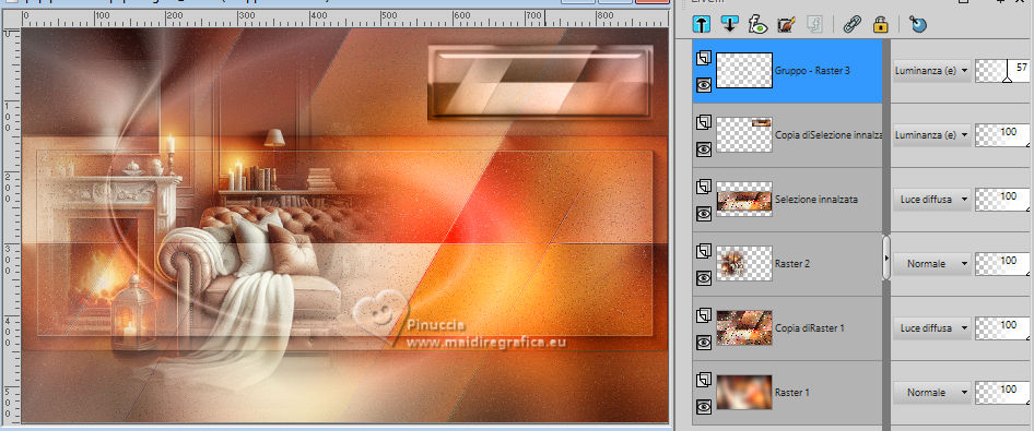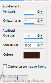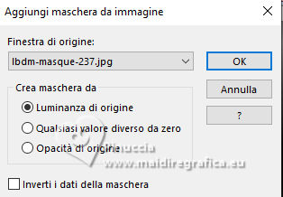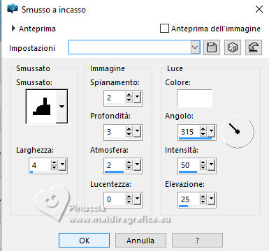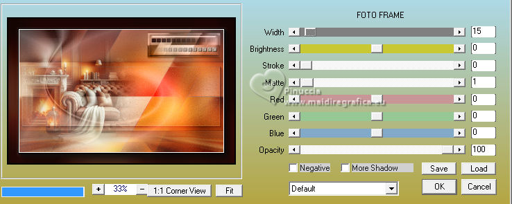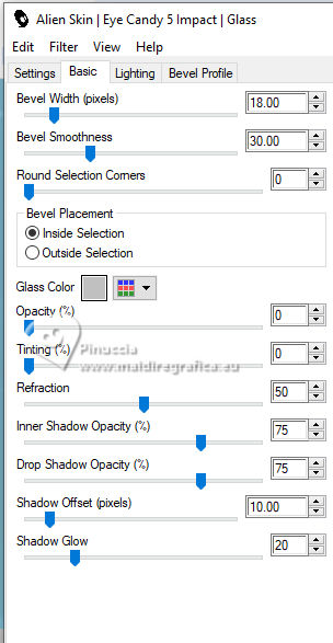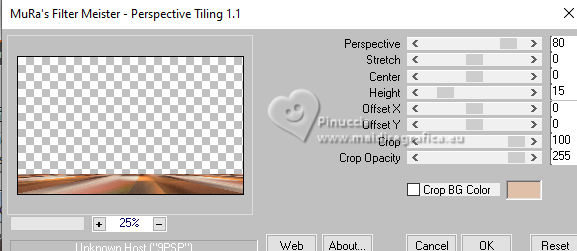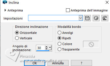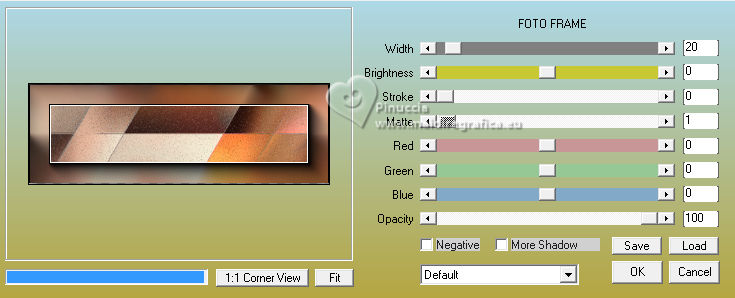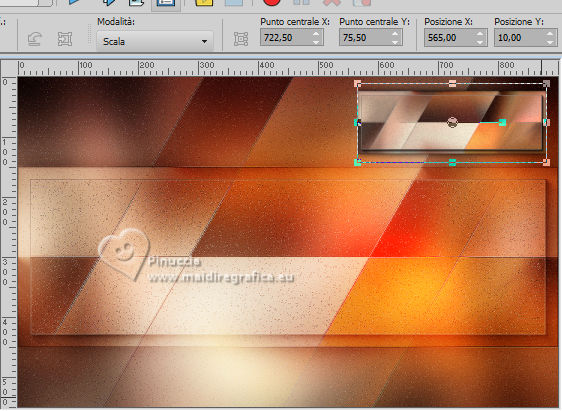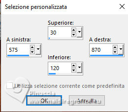 qui puoi trovare qualche risposta ai tuoi dubbi. Se l'argomento che ti interessa non è presente, ti prego di segnalarmelo. Questo tutorial è stato tradotto con PSPX9 e PSP2020, ma può essere realizzato con le versioni più antiche. Dalla versione X4, il comando Immagine>Rifletti è stato sostituito con Immagine>Capovolgi in orizzontale, e il comando Immagine>Capovolgi con Immagine>Capovolgi in verticale. Nelle versioni X5 e X6, le funzioni sono state migliorate rendendo disponibile il menu Oggetti. Con la nuova versione X7, sono tornati Rifletti>Capovolgi, ma con nuove varianti. Vedi la scheda sull'argomento qui Traduzione inglese qui Le vostre versioni qui![]() Occorrente: ![]() (in questa pagina trovi i links ai siti dei creatori di tubes) Filtri: in caso di dubbi, ricorda di consultare la mia sezione filtri qui Filters Unlimited 2.0 qui Graphics Plus - Cross Shadow qui Mehdi - Sorting Tiles qui Alien Skin Eye Candy 5 Impact - Glass qui Mura's Meister qui AAA Frames - Foto Frame qui I filtri Graphics Plus si possono usare da soli o importati in Filters Unlimited (come fare vedi qui) Se un filtro fornito appare con questa icona ![]() non esitare a cambiare modalità di miscelatura e opacità secondo i colori utilizzati. ![]() Apri la maschera in PSP e minimizzala con il resto del materiale. Colori: primo piano: #3d1a16 sfondo: #e0c0a9 ![]() 1. Apri una nuova immagine trasparente 900 x 550 pixels. Selezione>Seleziona tutto. Apri l'immagine KAA WWW paper 14.jpg ![]() Modifica>Copia. Torna al tuo lavoro e vai a Modifica>Incolla nella selezione. Selezione>Deseleziona. 2. Regola>Sfocatura>Sfocatura gaussiana - raggio 50. ![]() 3. Regola>Tonalità e Saturazione>Vivacità. ![]() (nota dell'autore: per la mia seconda versione non ho usato questo effetto, perchè intensifica un po' i colori. Puoi usare Luminosità e Contrasto 0/18, per ottenere pressappoco lo stesso risultato) 4. Effetti>Plugins>Graphics Plus - Cross Shadow, con i settaggi standard. ![]() Livelli>Duplica. 5. Effetti>Plugins>Mehdi - Sorting Tiles ![]() 6. Effetti>Effetti di bordo>Aumenta. Effetti>Effetti geometrici>Inclina. ![]() Cambia la modalità di miscelatura di questo livello in Luce diffusa. Effetti>Effetti di bordo>Aumenta. 7. Regola>Aggiungi/Rimuovi disturbo>Aggiungi disturbo. ![]() Regola>Messa a fuoco>Metti a fuoco. 8. Attiva lo strumento Selezione ![]() (non importa il tipo di selezione impostato, perchè con la selezione personalizzata si ottiene sempre un rettangolo) clicca sull'icona Selezione personalizzata ![]() e imposta i seguenti settaggi. ![]() Selezione>Innalza selezione a livello. Cambia la modalità di miscelatura di questo livello in Luce diffusa. Effetti>Effetti 3D>Sfalsa ombra, colore nero. ![]() 9. Effetti>Plugins>AAA Frames - Foto Frame ![]() Selezione>Deseleziona. 10. Livelli>Duplica. Immagine>Ridimensiona, al 35%, tutti i livelli non selezionato. Tasto K per attivare lo strumento Puntatore ![]() Posizione X: 565,00 - Posizione Y: 10,00. ![]() Cambia la modalità di miscelatura di questo livello in Luminanza (esistente). 11. Selezione personalizzata ![]() ![]() 12. Effetti>Plugins>Alien Skin Eye Candy 5 Impact - Glass. ![]() Selezione>Deseleziona. 13. Apri il misted KAA WW paper 14 ![]() Modifica>Copia. Torna al tuo lavoro e vai a Modifica>Incolla come nuovo livello. Spostalo a sinistra.Livelli>Disponi>Sposta giù - 2 volte. 15. Attiva nuovamente il livello superiore. Livelli>Nuovo livello raster. Imposta il colore di primo piano con il colore bianco. Riempi il livello con il colore bianco.Livelli>Nuovo livello maschera>Da immagine. Apri il menu sotto la finestra di origine e vedrai la lista dei files aperti. Seleziona la maschera lbdm-masque-237 ![]() Effetti>Effetti di bordo>Aumenta. Livelli>Unisci>Unisci gruppo. 16. Immagine>Rifletti>Rifletti orizzontalmente. Cambia la modalità di miscelatura di questo livello in Luminanza (esistente), e abbassa l'opacità al 57%. ![]() 17. Apri il tube deco ![]() Modifica>Copia. Torna al tuo lavoro e vai a Modifica>Incolla come nuovo livello. Colorizza se necessario. 18. Tasto K per attivare lo strumento Puntatore ![]() Posizione X: 580,00 - Posizione Y: 40,00. ![]() Effetti>Effetti 3D>Smusso a incasso. ![]() Effetti>Effetti 3D>Sfalsa ombra, colore nero. ![]() 19. Attiva il livello Copia di Raster 1 (il secondo dal basso). Livelli>Duplica. Effetti>Plugins>Mura's Meister - Perspective Tiling. ![]() 20. Attiva lo strumento Bacchetta magica , tolleranza 0, sfumatura 60,e clicca nella parte trasparente per selezionarla. Premi 4 volte sulla tastiera il tasto CANC ![]() non dimenticare di riportare la sfumatura a 0 Selezione>Deseleziona. Livelli>Duplica. 21. Attiva nuovamente il livello Copia di Raster 1. Modifica>Copia. Imposta nuovamente il colore di primo piano con #3d1a16. ![]() 22. Immagine>Aggiungi bordatura, 2 pixels, simmetriche, colore di sfondo. Selezione>Seleziona tutto. Immagine>Aggiungi bordatura, 40 pixels, simmetriche, colore di primo piano. 23. Selezione>Inverti. Livelli>Nuovo livello raster. Modifica>Incolla nella selezione Cambia la modalità di miscelatura di questo livello in Luce diffusa. 24. Livelli>Unisci>Unisci giù. Selezione>Inverti. Effetti>Effetti 3D>Sfalsa ombra, colore nero. ![]() Selezione>Deseleziona. 25. Effetti>Plugins>AAA Frames - Foto Frame. ![]() 26. Apri il tube principale femme1135-coly ![]() Cancella la firma e vai a Modifica>Copia. Torna al tuo lavoro e vaia Modifica>Incolla come nuovo livello. Immagine>Ridimensiona, per il tube fornito al 78%, tutti i livelli non selezionato. Effetti>Effetti 3D>Sfalsa ombra, a scelta, per me ![]() 27. Apri il testo Riet Tekst Time 529 1161119 ![]() Modifica>Copia. Torna al tuo lavoro e vai a Modifica>Incolla come nuovo livello. Immagine>Ridimensiona, per il tube fornito al 65%, tutti i livelli non selezionato. Immagine>Immagine negativa. 28. Livelli>Duplica. Livelli>Unisci>Unisci giù. Effetti>Effetti 3D>Sfalsa ombra, colore scuro. ![]() Cambia la modalità di miscelatura di questo livello 