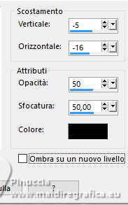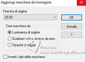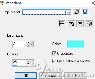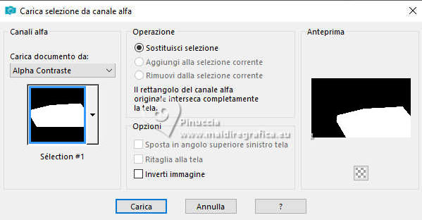 qui puoi trovare qualche risposta ai tuoi dubbi. Se l'argomento che ti interessa non è presente, ti prego di segnalarmelo. Questo tutorial è stato tradotto con PSPX7, ma può essere realizzato con le versioni più antiche. Dalla versione X4, il comando Immagine>Rifletti è stato sostituito con Immagine>Capovolgi in orizzontale, e il comando Immagine>Capovolgi con Immagine>Capovolgi in verticale. Nelle versioni X5 e X6, le funzioni sono state migliorate rendendo disponibile il menu Oggetti. Con la nuova versione X7, sono tornati Rifletti>Capovolgi, ma con nuove varianti. Vedi la scheda sull'argomento qui Traduzione inglese qui![]() Occorrente: ![]() (in questa pagina trovi i links ai siti dei creatori di tubes) Filtri: in caso di dubbi, ricorda di consultare la mia sezione filtri qui Filters Unlimited 2.0 qui Graphics Plus - Cross Shadow qui I filtri Graphics Plus si possono usare da soli o importati in Filters Unlimited (come fare vedi qui) Se un filtro fornito appare con questa icona ![]() non esitare a cambiare modalità di miscelatura e opacità secondo i colori utilizzati. ![]() Consiglio per questo tutorial: trovare una immagine (o un misted) con un buon contrasto, scuro ai bordi e luminoso al centro. Apri le maschere in PSP e minimizzale con il resto del materiale. Imposta il colore di primo con un colore molto vivo: per l'esempio #47fffd. Imposta il colore di sfondo con il colore nero #000000. ![]() 1. Preparazione se hai una immagine in jpg. Apri l'immagine. Livelli>Nuovo livello maschera>Da immagine. Apri il menu sotto la finestra di origine e vedrai la lista dei files aperti. Seleziona la maschera 20-20 ![]() Livelli>Duplica. Livelli>Unisci>Unisci gruppo. Modifica>Copia. 2. Apri Alpha Contraste Finestra>Duplica o sulla tastiera maiuscola+D per fare una copia. ![]() Chiudi l'originale. La copia, che sarà la base del tuo lavoro, non é vuota, ma contiene una selezione salvata sul canale alfa. Riempi l'immagine trasparente con il colore nero.Effetti>Effetti di trama>Veneziana, colore di primo piano. ![]() 3. Livelli>Nuovo livello raster. Riempi il livello con il colore di primo piano.Livelli>Nuovo livello maschera>Da immagine. Apri il menu sotto la finestra di origine e seleziona la maschera 163_Masque_ForumChezVioline ![]() Regola>Messa a fuoco>Metti a fuoco. Livelli>Unisci>Unisci gruppo. 4. Livelli>Nuovo livello raster. Selezione>Seleziona tutto. Apri il misted oiseau mist ![]() Modifica>Copia. Torna al tuo lavoro e vai a Modifica>Incolla nella selezione. Selezione>Deseleziona. 5. Effetti>Effetti di immagine>Motivo unico, Fianco a fianco. ![]() Regola>Sfocatura>Sfocatura gaussiana - raggio 30. ![]() Cambia la modalità di miscelatura di questo livello in Luce netta. 6. Effetti>Effetti di immagine>Motivo unico, con i settaggi standard. ![]() 7. Modifica>Incolla come nuovo livello (il misted è ancora in memoria). Immagine>Ridimensiona, al 75%, tutti i livelli non selezionato. Sposta il tube a destra.Nota di Colybrix: Io ho duplicato questo livello e unito con il livello sottostante (facoltativo) Nella mia seconda versione, ho cambiato la modalità di miscelatura della copia in Sovrapponi, per dare più contrasto 8. Attiva il livello Gruppo-Raster 2. Selezione>Carica/Salva selezione>Carica selezione da canale alfa. La selezione Sélection #1 è subito disponibile. Devi soltanto cliccare Carica. ![]() Selezione>Innalza selezione a livello. Selezione>Deseleziona. 9. Immagine>Ridimensiona, al 75%, tutti i livelli non selezionato. Immagine>Rifletti>Rifletti orizzontalmente (Immagine>Rifletti). Oggetti>Allinea>Sinistra. Oggetti>Allinea>Inferiore. O sposta il tube in basso a sinistra.Livelli>Unisci>Unisci giù. Risultato ![]() 10. Immagine>Aggiungi bordatura, 2 pixels, simmetriche, colore nero. Immagine>Aggiungi bordatura, 2 pixels, simmetriche, colore di primo piano. 11. Selezione>Seleziona tutto. Immagine>Aggiungi bordatura, 30 pixels, simmetriche, colore nero. Selezione>Inverti. Effetti>Effetti di trama>Veneziana, con i settaggi precedenti. ![]() 12. Effetti>Plugins>Graphics Plus - Cross shadow, con i settaggi standard. ![]() Ripeti l'Effetto una seconda volta. Selezione>Inverti. Effetti>Effetti 3D>Sfalsa ombra, colore nero. ![]() Modifica>Ripeti Sfalsa ombra. Selezione>Deseleziona. 13. Apri il tube della donna femme942-coly ![]() Cancella il watermark e vai a Modifica>Copia Torna al tuo lavoro e vai a Modifica>Incolla come nuovo livello. Immagine>Ridimensiona, al 75%, tutti i livelli non selezionato. Sposta il tube a sinistra.Effetti>Effetti 3D>Sfalsa ombra, colore nero, (o a scelta) ![]() 14. Apri il testo Riet_Tekst Enjou_1149-300524 ![]() Cancella il watermark e vai a Modifica>Copia Torna al tuo lavoro e vai a Modifica>Incolla come nuovo livello. Immagine>Ridimensiona, al 75%, tutti i livelli non selezionato. Immagine>Immagine negativa. Effetti>Effetti 3D>Sfalsa ombra, colore nero. ![]() Ripeti l'Effetto Sfalsa ombra, verticale e orizzontale -2. 15. Attiva lo strumento Trasforma in destinazione ![]() dimensione abbastanza larga (circa 200 pixels) ![]() Passail mouse sul testo due volte per mettere il colore di primo piano. Sposta il testo dove preferisci.Per me: Posizione X: 365,00 e Posizione Y: 40,00. ![]() Effetti>Effetti 3D>Sfalsa ombra, colore nero. ![]() 16. Firma il tuo lavoro. Immagine>Aggiungi bordatura, 1 pixel, simmetriche, colore nero. Immagine>Aggiungi bordatura, 2 pixels, simmetriche, colore di primo piano. Immagine>Aggiungi bordatura, 1 pixel, simmetriche, colore nero. Salva in formato jpg. Per i tubes di questo esempio grazie Colybrix e Mentali ![]() ![]() Le vostre versioni. Grazie ![]() DeniseD ![]() ![]() Puoi scrivermi se hai problemi o dubbi, o trovi un link che non funziona, o soltanto per un saluto. |