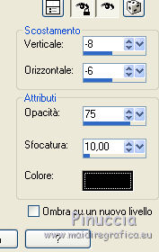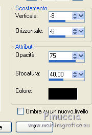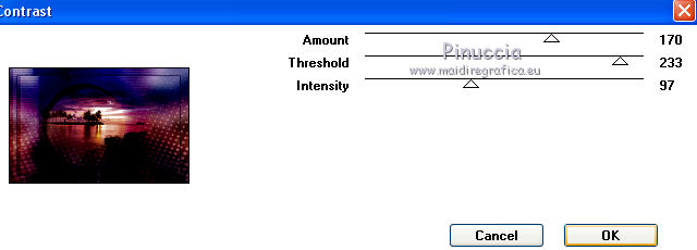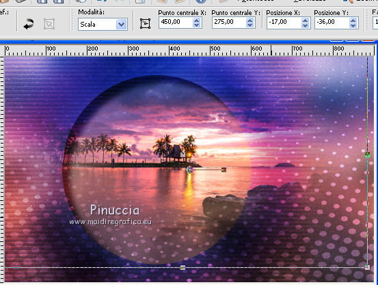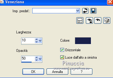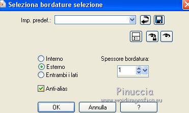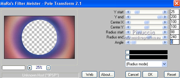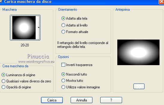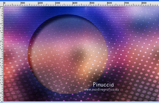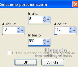 qui puoi trovare qualche risposta ai tuoi dubbi. Se l'argomento che ti interessa non è presente, ti prego di segnalarmelo. Questo tutorial è stato tradotto con PSPX, ma può essere realizzato anche con le altre versioni di PSP. Dalla versione X4, il comando Immagine>Rifletti è stato sostituito con Immagine>Capovolgi in orizzontale, e il comando Immagine>Capovolgi con Immagine>Capovolgi in verticale. Nelle versioni X5 e X6, le funzioni sono state migliorate rendendo disponibile il menu Oggetti. Con la nuova versione X7, sono tornati Rifletti>Capovolgi, ma con nuove varianti. Vedi la scheda sull'argomento qui Occorrente: Materiale qui (in questa pagina trovi i links ai siti dei creatori di tubes) Filtri: se hai problemi con i filtri, consulta la mia sezione filtri qui Filters Unlimited 2.0 qui Graphics Plus - Contrast qui Mura's Meister - Pole Transform qui I filtri Graphics Plus si possono usare da soli o importati in Filters Unlimited (come fare vedi qui) Se un filtro fornito appare con questa icona ![]() non esitare a cambiare modalità di miscelatura e opacità secondo i colori utilizzati. ![]() Metti la maschera 20-20 nella cartella Maschere. Apri la seconda maschera in PSP e minimizzala con il resto del materiale. Imposta il colore di primo piano con #1a224b e il colore di sfondo con #e1d4f1. ![]() 1. Apri una nuova immagine trasparente 900 x 550 pixels. Selezione>Seleziona tutto. 2. Apri l'immagine di sfondo e vai a Modifica>Copia. Torna al tuo lavoro e vai a Modifica>Incolla nella selezione. Selezione>Deseleziona. 3. Livelli>Duplica. Livelli>Carica/Salva maschera>Carica maschera da disco. Cerca e carica la maschera 20-20. ![]() Livelli>Duplica. Livelli>Unisci>Unisci gruppo. 4. Chiudi questo livello e attiva il livello sottostante Raster 1. Regola>Sfocatura>Sfocatura gaussiana - raggio 30. ![]() Effetti>Effetti di immagine>Motivo unico, Fianco a fianco. ![]() 5. Regola>Aggiungi/Rimuovi disturbo>Aggiungi disturbo. ![]() 6. Livelli>Nuovo livello raster. Riempi con il colore chiaro di sfondo, o con il colore bianco.Livelli>Nuovo livello maschera>Da immagine. Apri il menu sotto la finestra di origine e vedrai la lista dei files aperti. Seleziona la maschera 160_Masque_ForumChezVioline. ![]() Effetti>Effetti di bordo>Aumenta. Livelli>Unisci>Unisci gruppo. Cambia la modalità di miscelatura di questo livello in Sovrapponi. 7. Livelli>Duplica. Immagine>Rifletti. Mantieni la modalità di miscelatura in Sovrapponi, e abbassa l'opacità al 50%. ![]() 8. Attiva nuovamente il livello inferiore, Raster 1. Livelli>Duplica. Effetti>Plugins>Mura's Meister - Pole Transform. ![]() Cambia la modalità di miscelatura di questo livello in Sovrapponi. Effetti>Effetti 3D>Sfalsa ombra. ![]() 9. Effetti>Effetti di trama>Veneziana, colore di sfondo. ![]() Livelli>Disponi>Porta in alto. 10. Tasto K per attivare lo strumento Puntatore ![]() e imposta Posizione X: -80,00 e Posizione Y: 0,00. ![]() 11. Attiva lo strumento Gomma ![]() ![]() Clicca in alto e scendi fino in basso, passa 3-4 volte se necessario per cancerllare il taglio netto. ![]() Risultato ![]() 12. Riapri e attiva il livello Copia di Raster 1. Sposta il cerchio al centro se necessario; per il mio esempio: Strumento Puntatore ![]() ![]() 13. Attiva il livello superiore. Livelli>Nuovo livello raster. Attiva lo strumento Selezione ![]() (non importa il tipo di selezione impostato, perchè con la selezione personalizzata si ottiene sempre un rettangolo) clicca sull'icona Selezione personalizzata ![]() e imposta i seguenti settaggi. ![]() 14. Imposta il colore di primo piano con il colore bianco. Abbassa l'opacità dello strumento Riempimento al 30%, e riempi la selezione con il colore bianco.Selezione>Modifica>Seleziona bordature selezione. ![]() 15. Riporta l'opacità dello strumento Riempimento a 100 ingrandisci l'immaginee riempi la selezione con il colore bianco.Selezione>Deseleziona. 16. Cambia la modalità di miscelatura di questo livello in Sovrapponi, e abbassa l'opacità al 75%. Livelli>Duplica. Immagine>Ridimensiona, al 90%, tutti i livelli non selezionato. Regola>Sfocatura>Sfocatura gaussiana - raggio 10 ![]() Cambia la modalità di miscelatura di questo livello in Dissolvi, e abbassa l'opacità al 20%. ![]() 17. Effetti>Effetti di immagine>Motivo unico, Fianco a fianco. ![]() 18. Modifica>Copia Speciale>Copia Unione. 19. Immagine>Aggiungi bordatura, 2 pixels, simmetriche, colore di primo piano #1a224b. Selezione>Seleziona tutto. Immagine>Aggiungi bordatura, 40 pixels, simmetriche, non è necessario cambiare colore. 20. Selezione>Inverti. Modifica>Incolla nella selezione. Effetti>Plugins>Graphics Plus - Contrast. Adatta il settaggio al risultato scelto per la tua immagine, più la cifra è alta più scuro sarà il risultato. ![]() 21. Selezione>Inverti. Effetti>Effetti 3D>Sfalsa ombra, colore chiaro. ![]() Selezione>Deseleziona. 22. Apri il tube della donna e vai a Modifica>Copia. Torna al tuo lavoro e vai a Modifica>Incolla come nuovo livello. Immagine>Rifletti. Immagine>Ridimensiona, al 77%, tutti i livelli non selezionato. Sposta il tube a destra.Effetti>Effetti 3D>Sfalsa ombra, colore nero. ![]() 23. Livelli>Duplica. Attiva il livello sottostante dell'originale. Regola>Sfocatura>Sfocatura gaussiana - raggio 30. ![]() Cambia la modalità di miscelatura di questo livello in Moltiplica, e abbassa l'opacità all'85%. 24. Apri il tube dei fiori e vai a Modifica>Copia. Torna al tuo lavoro e vai a Modifica>Incolla come nuovo livello. Immagine>Ridimensiona, al 70%, tutti i livelli non selezionato. Sposta il tube a sinistraPosizione X: 25,00, Posizione Y: 45,00. ![]() Effetti>Effetti 3D>Sfalsa ombra, colore nero. ![]() 25. Firma il tuo lavoro su un nuovo livello. Immagine>Aggiungi bordatura, 2 pixels, simmetriche, colore di primo piano #1a224b. Immagine>Ridimensiona, a 950 pixels di larghezza, tutti i livelli selezionato. Salva in formato jpg. Versione con tubes di Nicole ![]() ![]() ![]() Puoi scrivermi se hai problemi o dubbi, o trovi un 