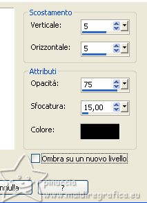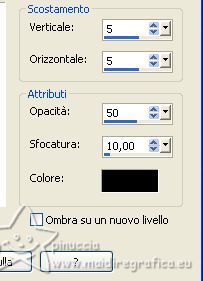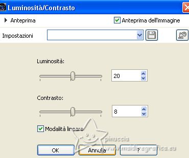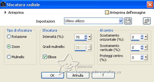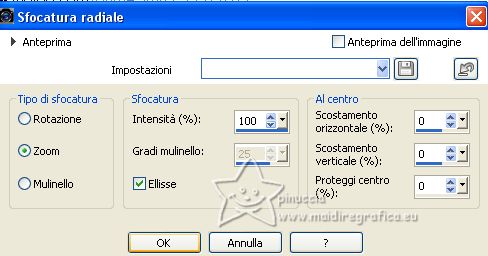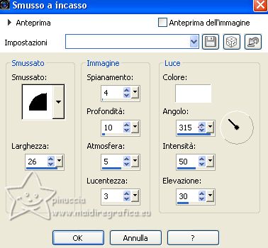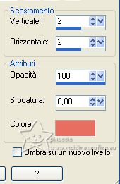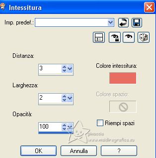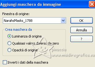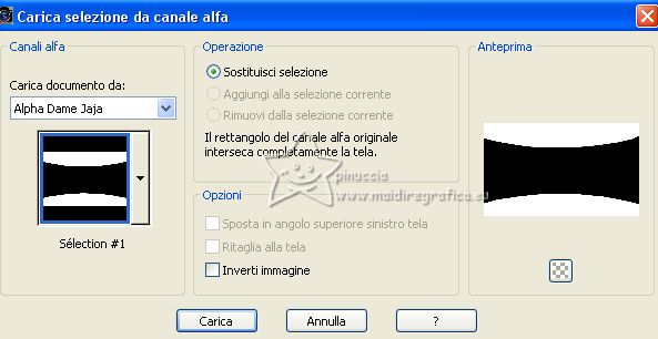 qui puoi trovare qualche risposta ai tuoi dubbi. Se l'argomento che ti interessa non è presente, ti prego di segnalarmelo. Questo tutorial è stato tradotto con PSPX7, ma può essere realizzato con le versioni più antiche. Dalla versione X4, il comando Immagine>Rifletti è stato sostituito con Immagine>Capovolgi in orizzontale, e il comando Immagine>Capovolgi con Immagine>Capovolgi in verticale. Nelle versioni X5 e X6, le funzioni sono state migliorate rendendo disponibile il menu Oggetti. Con la nuova versione X7, sono tornati Rifletti>Capovolgi, ma con nuove varianti. Vedi la scheda sull'argomento qui Traduzione inglese qui Le vostre versioni quiOccorrente: ![]() Per le maschere grazie Narah. Il resto del materiale è di Colybrix (in questa pagina trovi i links ai siti dei creatori di tubes) ![]() non esitare a cambiare modalità di miscelatura e opacità secondo i colori utilizzati. ![]() Apri le maschere in PSP e minimizzale con il resto del materiale. Imposta il colore di primo piano con #e76e60, e il colore di sfondo con #fbcec4. ![]() 1. Apri Alpha Dame Jaja. Finestra>Duplica o sulla tastiera maiuscola+D per fare una copia. ![]() Chiudi l'originale. La copia, che sarà la base del tuo lavoro, non é vuota, ma contiene le selezioni salvate sul canale alfa. Riempi l'immagine trasparente con il colore di primo piano.Livelli>Nuovo livello raster. Selezione>Seleziona tutto. Apri il misted dei fiori fleur55-coly ![]() Cancella il watermark e vai a Modifica>Copia. Minimizza il tube. Torna al tuo lavoro e vai a Modifica>Incolla nella selezione. Selezione>Deseleziona. 2. Effetti>Effetti di immagine>Motivo unico, fianco a fianco. ![]() Regola>Sfocatura>Sfocatura gaussiana - raggio 30. ![]() Regola>Sfocatura>Sfocatura radiale. ![]() Effetti>Effetti di bordo>Aumenta. Modifica>Ripeti Accentua i bordi. Livelli>Unisci>Unisci giù. 3. Livelli>Duplica. Effetti>Effetti di distorsione>Tasselli. ![]() Effetti>Effetti di bordo>Aumenta. Modifica>Ripeti Accentua i bordi. Cambia la modalità di miscelatura di questo livello in Luce diffusa. 4. Livelli>Nuovo livello raster. Riempi il livello con il colore di sfondo.Livelli>Nuovo livello maschera>Da immagine. Apri il menu sotto la finestra di origine e vedrai la lista dei files aperti. Seleziona la maschera Narah_1788 ![]() Effetti>Effetti di bordo>Aumenta. Livelli>Unisci>Unisci gruppo. Cambia la modalità di miscelatura di questo livello in Sovrapponi. 5. Livelli>Duplica. Immagine>Rifletti. 6. Livelli>Nuovo livello raster. Imposta il colore di primo piano con il colore bianco. Riempi il livello con il colore bianco.Livelli>Nuovo livello maschera>Da immagine. Apri il menu sotto la finestra di origine e seleziona la maschera Narah 1790 ![]() Effetti>Effetti di bordo>Aumenta. Livelli>Unisci>Unisci gruppo. 7. Effetti>Effetti 3D>Sfalsa ombra, colore nero. ![]() 8. Modifica>Incolla come nuovo livello (il tube dei fiori fleur55-coly è sempre in memoria). Immagine>Ridimensiona, al 75%, tutti i livelli non selezionato. Abbassa l'opacità di questo livello al 70% (o adatta al tuo tube). 9. Livelli>Duplica. Immagine>Rifletti. Sposta questo tube a destraTasto K per attivare lo strumento Puntatore ![]() Posizione X: 463,00 e Posizione Y: 82,00. ![]() Livelli>Unisci>Unisci giù. 10. Selezione>Carica/Salva selezione>Carica selezione da canale alfa. La selezione Sélection #1 é subito disponibile. Devi soltanto cliccare Carica. ![]() Premi sulla tastiera il tasto CANC ![]() Selezione>Deseleziona. Livelli>Disponi>Sposta giù. 11. Chiudi il livello dei fiori, Raster 2. Modifica>Copia Speciale>Copia Unione. Modifica>Incolla come nuova immagine, e minimizza questa immagine che ti servirà per i bordi. 12. Torna al tuo lavoro. Riapri il livello dei fiori e attiva il livello superiore. Livelli>Nuovo livello raster. Selezione>Carica/Salva selezione>Carica selezione da canale alfa. Apri il menu delle selezioni e carica la selezione Sélection 2 ![]() Modifica>Incolla nella selezione (l'immagine minimizzata è ancora in memoria). ![]() 13. Effetti>Effetti 3D>Smusso a incasso. ![]() Regola>Messa a fuoco>Metti a fuoco. Selezione>Deseleziona. 14. Immagine>Ridimensiona, al 50%, tutti i livelli non selezionato. Tasto K per attivare lo strumento Puntatore ![]() e imposta Posizione X: 380,00 e Posizione Y: 10,00. ![]() Livelli>Duplica. Immagine>Ridimensiona, al 75%, tutti i livelli non selezionato. Imposta Posizione x: 288,00 e Posizione Y: 26,00. ![]() Livelli>Duplica. Immagine>Ridimensiona, al 75%, tutti i livelli non selezionato. Imposta Posizione x: 222,00 e Posizione Y: 37,00. ![]() Livelli>Unisci>Unisci giù. 15. Livelli>Duplica. Immagine>Rifletti. Livelli>Unisci>Unisci giù - 2 volte. Effetti>Effetti 3D>Sfalsa ombra, con i settaggi precedenti. 16. Apri il misted della donna femme874-coly ![]() Modifica>Copia. Torna al tuo lavoro e vai a Modifica>Incolla come nuovo livello. Immagine>Ridimensiona, al 75%, tutti i livelli non selezionato. Sposta il tube a sinistra.(per il mio tube, Posizione x: -37,00 e Posizione Y: -40,00. ![]() In questo tube non c'è Sfalsa ombra, se utilizzi un tube, Sfalsa omba a scelta. 17. Livelli>Duplica. Regola>Sfocatura>Sfocatura radiale. ![]() Immagine>Rifletti. Cambia la modalità di miscelatura di questo livello in Sovrapponi. 18. Attiva lo strumento Testo , font Police Admiration PainsScrivi Dame Jaja con il colore chiaro i miei settaggi ![]() (o usa il testo in bianco e colorizza, o usa il titolo completo ).19. Effetti>Effetti di trama>Intessitura Colore intessitura: colore di primo piano. ![]() Effetti>Effetti 3D>Sfalsa ombra, colore di primo piano. ![]() Facoltativo. Regola>Luminosità e contrasto>Luminosità e contrasto. ![]() Sposta il testo in basso.Effetti>Effetti 3D>Sfalsa ombra, colore nero. ![]() 20. Per i bordi imposta nuovamente il colore di primo piano con #e76e60. ![]() Attiva l'immagine minimizzata al punto 11. Modifica>Copia. 21. Torna al tuo lavoro. Immagine>Aggiungi bordatura, 1 pixel, simmetriche, colore di primo piano. Immagine>