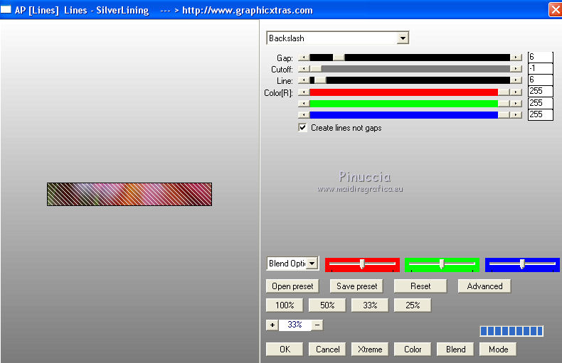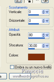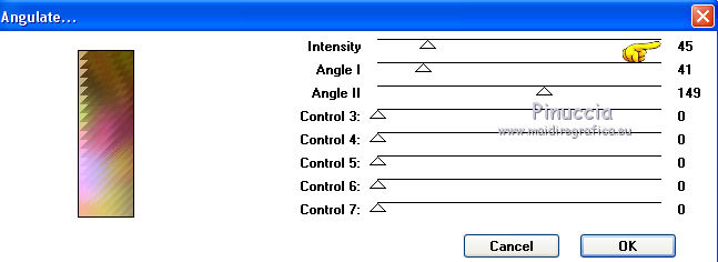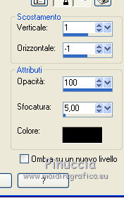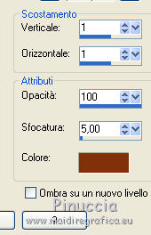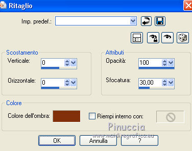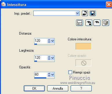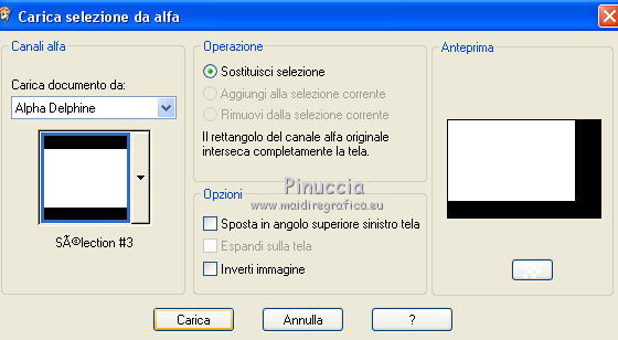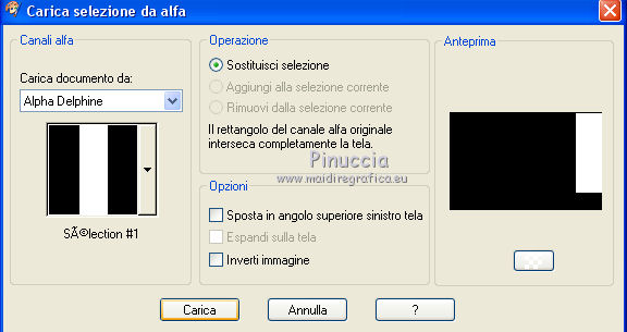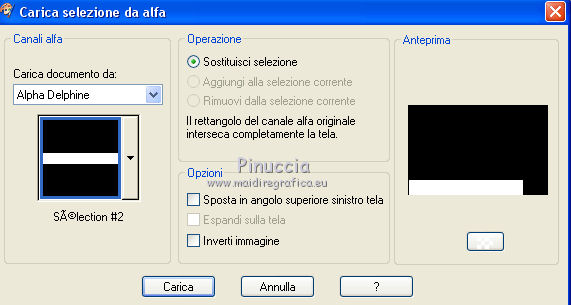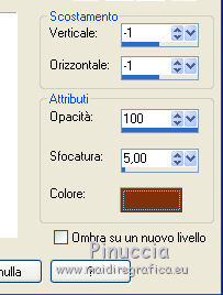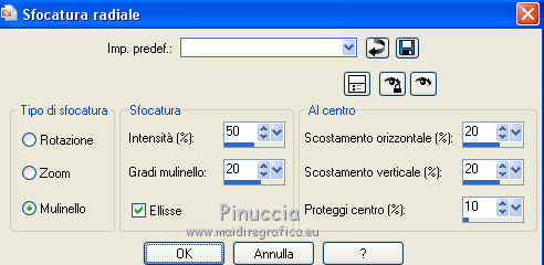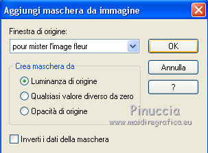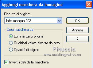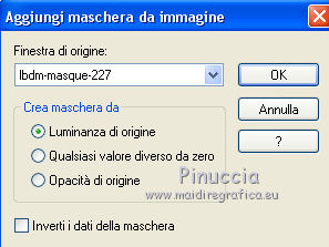 qui puoi trovare qualche risposta ai tuoi dubbi. Se l'argomento che ti interessa non è presente, ti prego di segnalarmelo. Questo tutorial è stato tradotto con PSPX, ma può essere realizzato anche con le altre versioni di PSP. Dalla versione X4, il comando Immagine>Rifletti è stato sostituito con Immagine>Capovolgi in orizzontale, e il comando Immagine>Capovolgi con Immagine>Capovolgi in verticale. Nelle versioni X5 e X6, le funzioni sono state migliorate rendendo disponibile il menu Oggetti. Con la nuova versione X7, sono tornati Rifletti>Capovolgi, ma con nuove varianti. Vedi la scheda sull'argomento qui Le vostre versioniOccorrente: Materiale qui Per le maschere grazie Mary LBDM. Il resto del materiale è di Colybrix. (in questa pagina trovi i links ai siti dei creatori di tubes) Filtri: se hai problemi con i filtri, consulta la mia sezione filtri qui Filters Unlimited 2.0 qui Funhouse - Angulate qui AP Lines - Lines SilverLining qui Graphics Plus - Cross Shadow qui I filtri Graphics Plus e Funhouse si possono usare da soli o importati in Filters Unlimited (come fare vedi qui) Se un filtro fornito appare con questa icona ![]() non esitare a cambiare modalità di miscelatura e opacità secondo i colori utilizzati. Apri le maschere in PSP e minimizzale con il resto del materiale. 1. Imposta il colore di primo piano con #ffffff, e il colore di sfondo con #facf8a. ![]() 2. Apri alpha_delphine. Finestra>Duplica o sulla tastiera maiuscola+D per fare una copia. ![]() Chiudi l'originale. La copia, che sarà la base del tuo lavoro, non è vuota, ma contiene le selezioni salvate sul canale alfa. 3. Selezione>Seleziona tutto. Scegli una bella immagine con fiori e bei colori (o altro per lo sfondo), o apri l'immagine fornita. Modifica>Copia. Torna al tuo lavoro e vai a Modifica>Incolla nella selezione. Selezione>Deseleziona. 4. Regola>Sfocatura>Sfocatura radiale. ![]() 5. Effetti>Effetti di bordo>Aumenta. 6. Livelli>Nuovo livello raster. Riempi il livello con il colore bianco.7. Livelli>Nuovo livello maschera>Da immagine. Apri il menu sotto la finestra di origine e vedrai la lista dei files aperti. Seleziona la maschera lbdm-masque227. ![]() Effetti>Effetti di bordo>Aumenta. Livelli>Unisci>Unisci gruppo. 8. Cambia la modalità di miscelatura di questo livello in Luminanza (esistente) e abbassa l'opacità al 63%. Livelli>Unisci>Unisci giù. 9. Selezione>Carica/Salva selezione>Carica selezione da canale alfa. La selezione #1 è subito disponibile. Devi soltanto cliccare Carica. ![]() 10. Effetti>Plugins>Funhouse - Angulate. ![]() Effetti>Effetti di bordo>Aumenta. Mantieni selezionato. 11. Livelli>Nuovo livello raster. Effetti>Effetti 3D>Ritaglio, colore #82310c. ![]() Livelli>Unisci>Unisci giù. 12. Effetti>Effetti 3D>Sfalsa ombra. ![]() Selezione>Deseleziona. 13. Selezione>Carica/Salva selezione>Carica selezione da canale alfa. Apri il menu delle selezioni e carica la selezione #2. ![]() Selezione>Innalza selezione a livello. 14. Effetti>Plugins>AP Lines - Lines SilverLining. ![]() Abbassa l'opacità di questo livello al 35%. 15. Effetti>Effetti 3D>Sfalsa ombra. ![]() 16. Livelli>Unisci>Unisci giù. Selezione>Deseleziona. 17. Selezione>Carica/Salva selezione>Carica selezione da canale alfa. Apri il menu delle selezioni e carica la selezione #3. ![]() 18. Effetti>Effetti di trama>Intessitura - colore chiaro. (per la mia seconda versione, essendo lo sfondo più chiaro, ho usato il colore scuro). ![]() Effetti>Effeti di bordo>Aumenta. 19. Livelli>Nuovo livello raster. Effetti>Effetti 3D>Ritaglio, con i settaggi precedenti. Livelli>Unisci>Unisci giù. Selezione>Deseleziona. 20. Livelli>Nuovo livello raster. Riempi il livello con il colore bianco.21. Livelli>Nuovo livello maschera>Da immagine. Apri il menu sotto la finestra di origine e seleziona la maschera lbdm-masque202. ![]() Effetti>Effetti di bordo>Aumenta. Livelli>Unisci>Unisci gruppo. 22. Immagine>Ridimensiona, all'80%, tutti i livelli non selezionato. Tasto K sulla tastiera per attivare lo strumento Puntatore ![]() e imposta Posizione X: 8,00 e Posizione Y: 6,00. ![]() 23. Effetti>Effetti 3D>Sfalsa ombra, colore scuro #82310c. ![]() Cambia la modalità di miscelatura di questo livello in Luminanza (esistente). 24. Apri il mist fleurs 97–coly (o miscela la tua immagine di base con la maschera fornita a questo scopo) ![]() Cancella la firma. Modifica>Copia. Torna al tuo lavoro e vai a Modifica>Incolla come nuovo livello. Immagine>Ridimensiona, al 68%, tutti i livelli non selezionato. 25. Tasto K sulla tastiera per attivare lo strumento Puntatore ![]() e imposta Posizione X: 72,00 e Posizione Y: 46,00. ![]() 26. Livelli>Disponi>Sposta giù. Attiva nuovamente il livello superiore. 27. Apri il tube Bulle e vai a Modifica>Copia. Torna al tuo lavoro e vai a Modifica>Incolla come nuovo livello. Mantieni la modalità di miscelatura in Filtra. 28. Imposta Posizione X: 20,00 e Posizione Y: 0,00. ![]() 29. Attiva il livello di sfondo. Selezione>Carica/Salva selezione>Carica selezione da canale alfa. Apri il menu delle selezioni e carica la selezione #4. ![]() Selezione>Innalza selezione a livello. 30. Effetti>Effetti 3D>Smusso a incasso. ![]() 31. Effetti>Effetti 3D>Sfalsa ombra, con i settaggi precedenti ![]() Ripeti l'Effetto Sfalsa ombra, in positivo. ![]() Selezione>Deseleziona. 32. Attiva il livello di sfondo. Modifica>Copia. 33. Immagine>Aggiungi bordatura, 1 pixel, simmetriche, colore scuro #82310c. Immagine>Aggiungi bordatura, 3 pixels, simmetriche, colore bianco. Immagine>Aggiungi bordatura, 1 pixel, simmetriche, colore scuro #82310c. Immagine>Aggiungi bordatura, 25 pixels, simmetriche, colore bianco. 34. Attiva lo strumento Bacchetta magica ![]() e clicca nel bordo di 25 pixels per selezionarlo. Selezione>Inverti. Effetti>Effetti 3D>Sfalsa ombra, colore scuro #82310c ![]() 35. Selezione>Inverti. Effetti>Plugins>AP Lines - Lines SilverLining, con i settaggi precedenti. Regola>Messa a fuoco>Metti a fuoco. Selezione>Deseleziona. 36. Immagine>