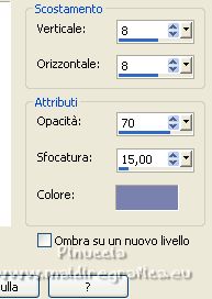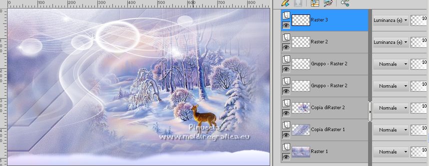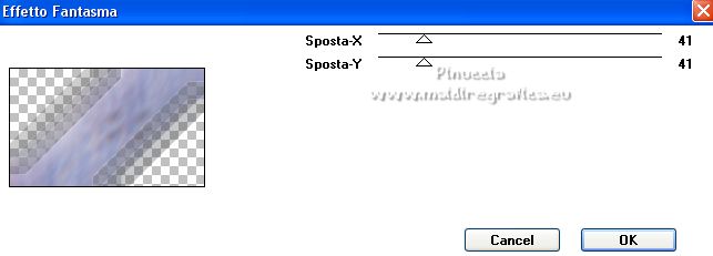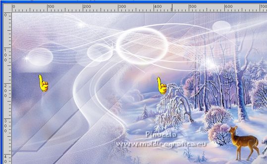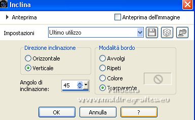qui puoi trovare qualche risposta ai tuoi dubbi. Se l'argomento che ti interessa non è presente, ti prego di segnalarmelo. Questo tutorial è stato tradotto con PSPX, ma può essere realizzato anche con le altre versioni di PSP. Dalla versione X4, il comando Immagine>Rifletti è stato sostituito con Immagine>Capovolgi in orizzontale, e il comando Immagine>Capovolgi con Immagine>Capovolgi in verticale. Nelle versioni X5 e X6, le funzioni sono state migliorate rendendo disponibile il menu Oggetti. Con la nuova versione X7, sono tornati Rifletti>Capovolgi, ma con nuove varianti. Vedi la scheda sull'argomento qui Occorrente: ![]() Per le maschere grazie Narah. Il resto del materiale è di Colybrix (in questa pagina trovi i links ai siti dei creatori di tubes) ![]() se hai problemi con i filtri, consulta la mia sezione filtri qui Filters Unlimited 2.0 qui It@lian Editors Effects - Effetto Fantasma qui Graphics Plus - Cross shadow qui I filtri It@lian Editors e Graphics Plus si possono usare da soli o importati in Filters Unlimited (come fare vedi qui) Se un filtro fornito appare con questa icona ![]() non esitare a cambiare modalità di miscelatura e opacità secondo i colori utilizzati. Nelle ultime versioni di PSP non c'é il gradiente di primo piano/sfondo (Corel_06_029) Puoi usare i gradienti delle versioni precedenti. Trovi qui i gradienti Corel X. ![]() Apri le maschere in PSP e minimizzale con il resto del materiale. 1. Imposta il colore di primo piano con il colore 1 #c0d4f0, e il colore di sfondo con il colore 2 #e7e8f2. ![]() Passa il colore di primo piano a Gradiente di primo piano/sfondo, stile Lineare. ![]() Apri una nuova immagine trasparente 875 x 525 pixels. ![]() Riempi l'immagine trasparente con il gradiente.2. Apri il paesaggio paysghiver16-coly ![]() Cancella la firma e vai a Modifica>Copia. Torna al tuo lavoro e vai a Modifica>Incolla come nuovo livello. Immagine>Rifletti. Immagine>Ridimensiona, all'83%, tutti i livelli non selezionato. Livelli>Duplica. Chiudi questo livello. 3. Attiva il livello sottostante dell'originale. Effetti>Effetti di immagine>Motivo unico, Fianco a fianco. ![]() Regola>Sfocatura>Sfocatura gaussiana - raggio 10. ![]() Livelli>Unisci>Unisci giù. 4. Regola>Aggiungi/Rimuovi disturbo>Aggiungi disturbo. ![]() Livelli>Duplica. 5. Effetti>Effetti geometrici>Inclina. ![]() 6. Effetti>Plugins>It@lian Editors Effect - Effetto Fantasma, con i settaggi standard. ![]() Effetti>Effetti di bordo>Aumenta. Effetti>Effetti 3D>Sfalsa ombra, colore 3 #7b81af. ![]() Ripeti l'Effetto Sfalsa ombra, verticale e orizzontale -8. 7. Riapri e attiva il livello superiore. Sposta il tube un po' più a destra.Tasto K per attivare lo strumento Puntatore ![]() e imposta Posizione X: 219,00 e Posizione Y: 0,00. ![]() 8. Imposta il colore di sfondo con il colore bianco. Livelli>Nuovo livello raster. Riempi il livello con il colore bianco.Livelli>Nuovo livello maschera>Da immagine. Apri il menu sotto la finestra di origine e vedrai la lista dei files aperti. Seleziona la maschera NarahsMasks_1752 ![]() Effetti>Effetti di bordo>Aumenta. Livelli>Unisci>Unisci gruppo. 9. Livelli>Nuovo livello raster. Riempi il livello con il colore bianco.Livelli>Nuovo livello maschera>Da immagine. Apri il menu sotto la finestra di origine e seleziona la maschera NarahsMasks_1754 ![]() Effetti>Effetti di bordo>Aumenta. Livelli>Unisci>Unisci gruppo. 10. Immagine>Ridimensiona, con i seguenti settaggi, ![]() Sposta la maschera in alto a sinistra.Strumento Puntatore ![]() Posizione X: -9,00 e Posizione Y: -92,00. ![]() 11. Attiva lo strumento Gomma con i seguenti settaggi![]() Cancella leggermente le tracce dei bordi in basso (4-5 passaggi per ciascuno). ![]() Dovresti avere questo: ![]() 12. Copia e incolla come nuovo livello i due tubes sol neige droite e sol neige gauche Spostali in bassoe cambia la modalità di miscelatura di questi livelli in Luminanza (esistente). ![]() 13. Per i bordi, imposta il colore di primo piano con il colore 3 #7b81af. ![]() Immagine>Aggiungi bordatura, 1 pixel, simmetriche, colore 3 Immagine>Aggiungi bordatura, 5 pixels, simmetriche, colore 4. 14. Selezione>Seleziona tutto. Immagine>Aggiungi bordatura, 5 pixels, simmetriche, colore 3. Selezione>Inverti. Effetti>Plugins>Graphics Plus - Cross shadow ![]() 15. Selezione>Seleziona tutto. Immagine>Aggiungi bordatura, 20 pixels, simmetriche, colore 4. Effetti>Effetti 3D>Sfalsa ombra, colore nero. ![]() 16. Selezione>Seleziona tutto. Immagine>Aggiungi bordatura, 5 pixels, simmetriche, colore 3. Selezione>Inverti. Effetti>Plugins>Graphics Plus - Cross shadow, con i settaggi precedenti ![]() 17. Selezione>Seleziona tutto. Immagine>Aggiungi bordatura, 30 pixels, simmetriche, colore 4. Effetti>Effetti 3D>Sfalsa ombra, colore nero. ![]() Selezione>Deseleziona. 18. Apri il tube Flocons bordure ![]() Modifica>Copia. Torna al tuo lavoro e vai a Modifica>Incolla come nuovo livello. E' al suo posto. 19. Apri il tube del piccolo cervo dessin77-anim55-coly ![]() Cancella la firma e vai a Modifica>Copia. Torna al tuo lavoro e vai a Modifica>Incolla come nuovo livello. Immagine>Rifletti. Immagine>Ridimensiona, al 70%, tutti i livelli non selezionato, non dimenticare di selezionare Mantieni proporzioni ![]() Sposta il tube a sinistra.Effetti>Effetti 3D>Sfalsa ombra, colore nero. ![]() 20. Apri il tube del piccolo orso ours ![]() Modifica>Copia. Torna al tuo lavoro e vai a Modifica>Incolla come nuovo livello. Immagine>Ridimensiona, al 50%, tutti i livelli non selezionato. Attiva lo strumento Selezione , rettangolo,e traccia una selezione come nell'esempio ![]() Premi sulla tastiera il tasto CANC ![]() Selezione>Deseleziona. Sposta il tube contro il bordo in basso a destra![]() Effetti>Effetti 3D>Sfalsa ombra, colore nero. ![]() 21. Apri il tube WA-Douceur hivernale ![]() Cancella la firma e vai a Modifica>Copia. Torna al tuo lavoro e vai a Modifica>Incolla come nuovo livello. Immagine>Ridimensiona, al 70%, tutti i livelli non selezionato. Sposta